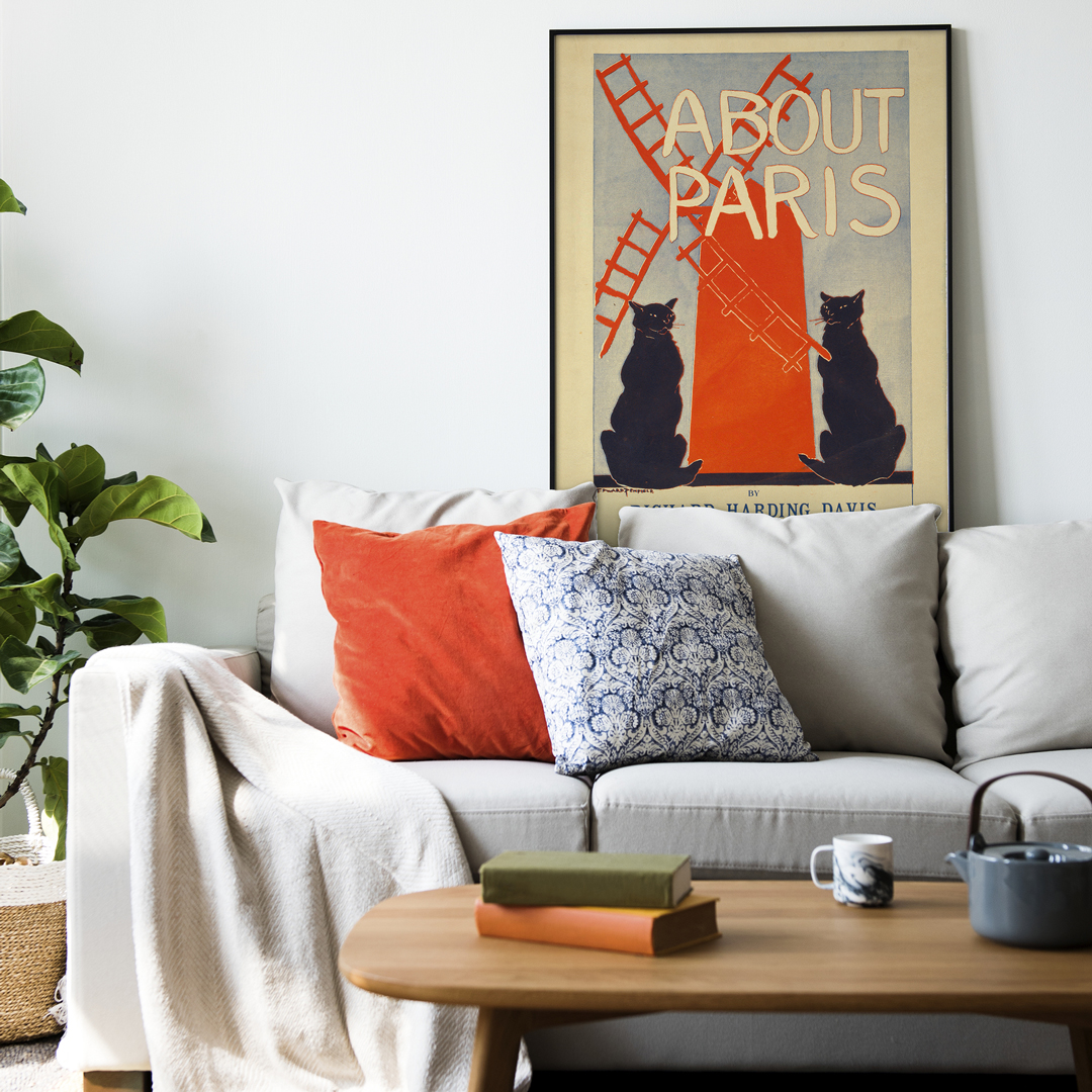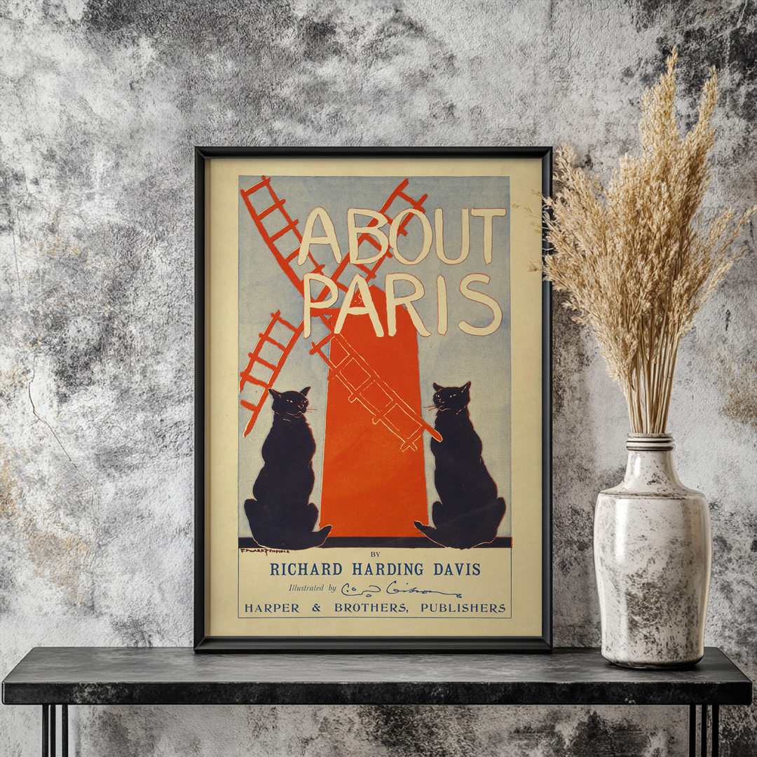 Cette affiche vintage About Paris (1895) par Edward Penfield illustre le Paris bohème avec ses chats noirs et le Moulin Rouge. Chef-d’œuvre Art Nouveau, elle témoigne de l’élégance graphique et de la culture nocturne parisienne. En décoration, elle apporte charme rétro et raffinement, séduisant amateurs d’Art Nouveau et collectionneurs d’affiches anciennes Paris.