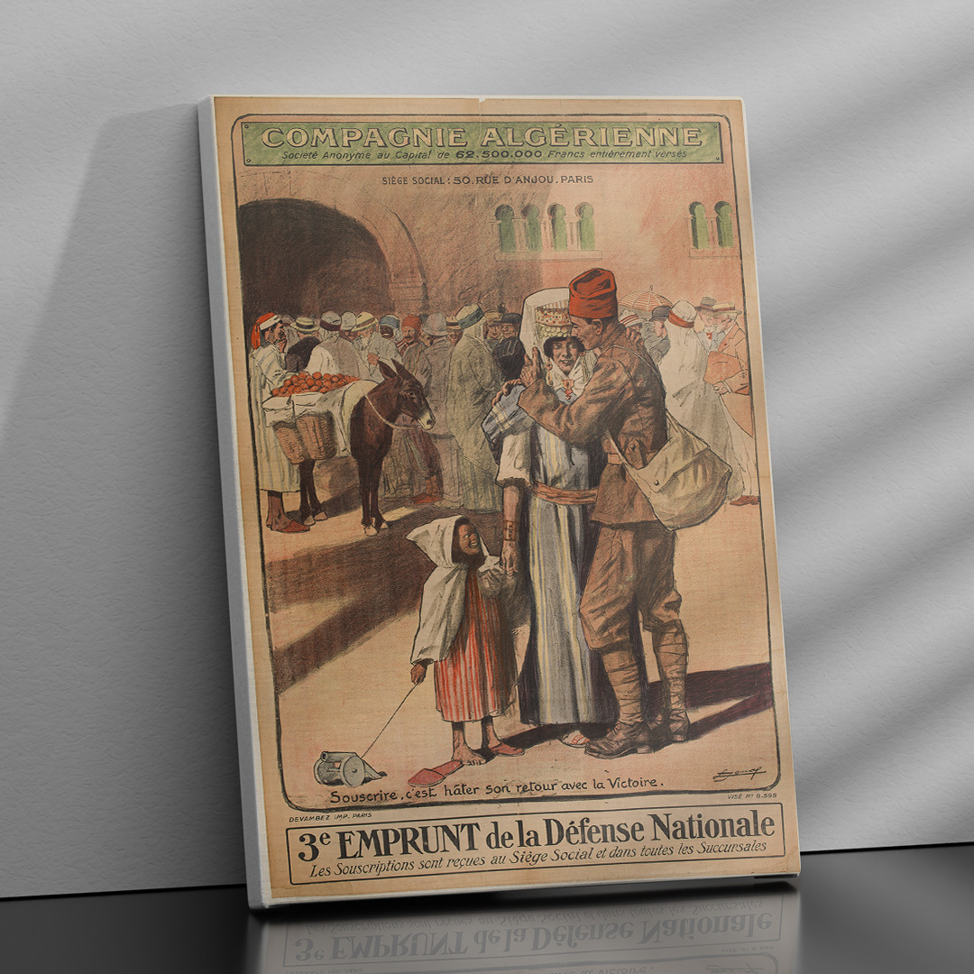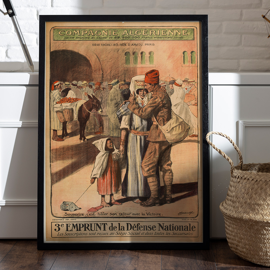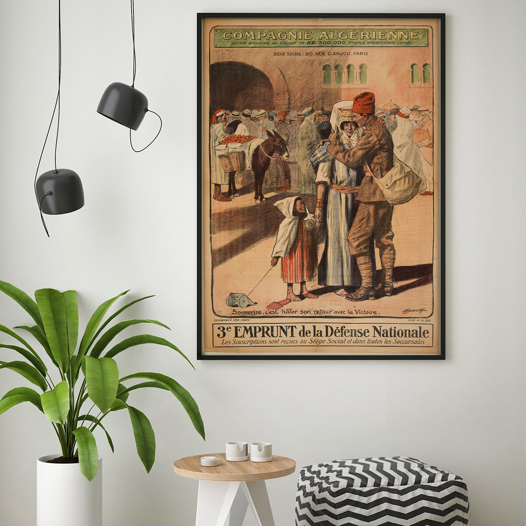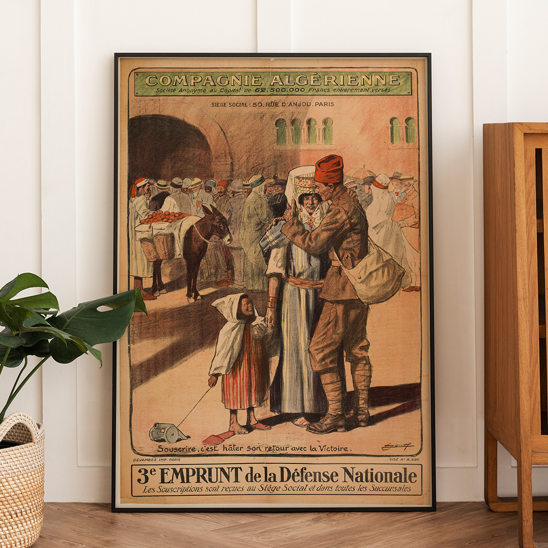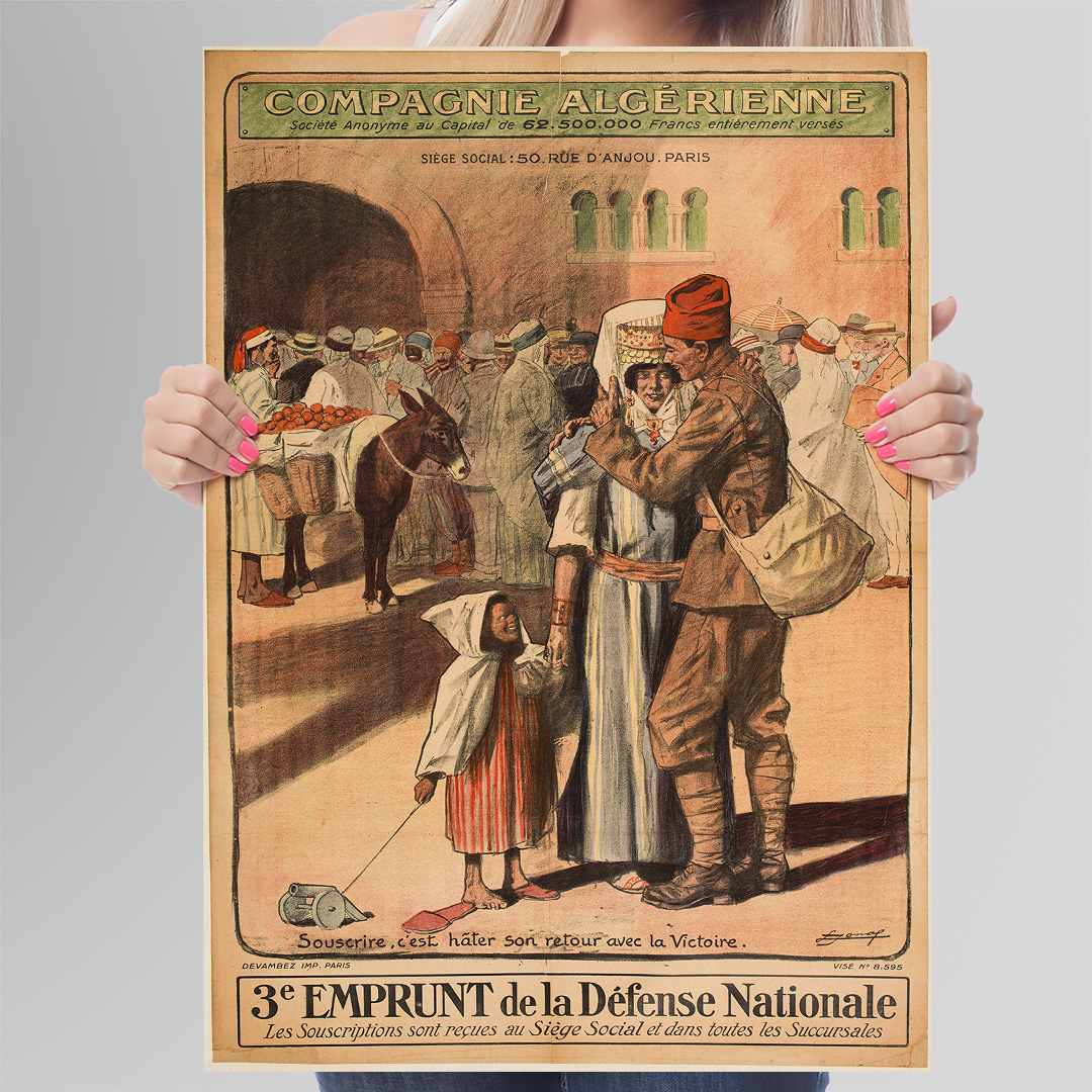 Affiche 3e Emprunt Défense Nationale – Compagnie Algérienne (1917) par Lucien Jonas. Une œuvre historique puissante, idéale pour une décoration murale culturelle et authentique.