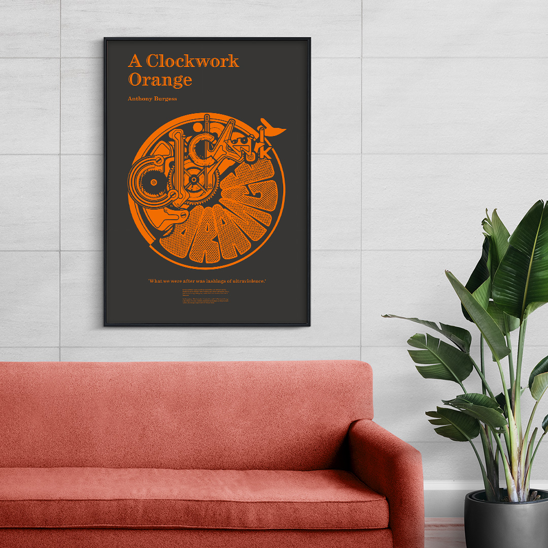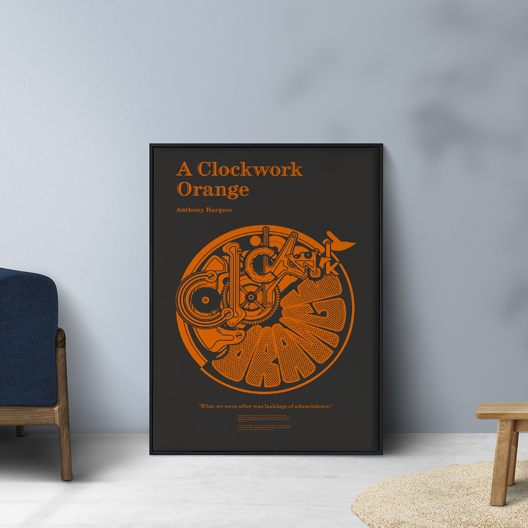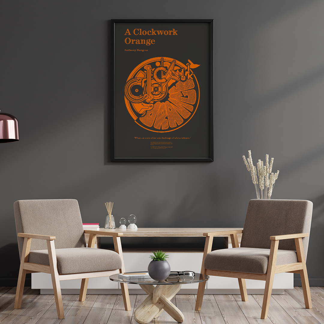 L’affiche A Clockwork Orange d’Anthony Burgess est une œuvre graphique mythique, symbole du lien entre littérature et design conceptuel des années 60. Son fond noir profond contraste avec un symbole orange central, évoquant la dualité entre l’humain et la machine, thème central du roman.