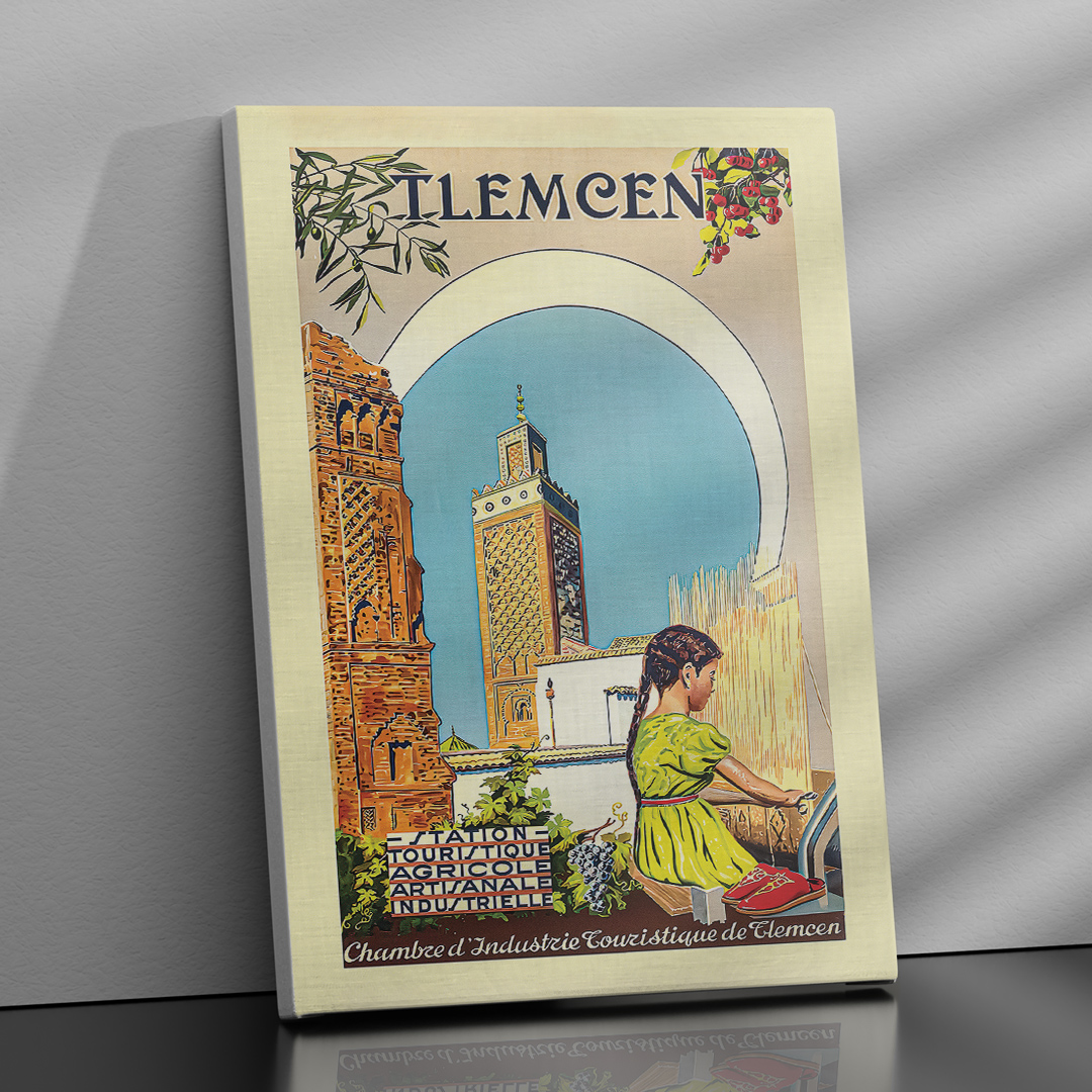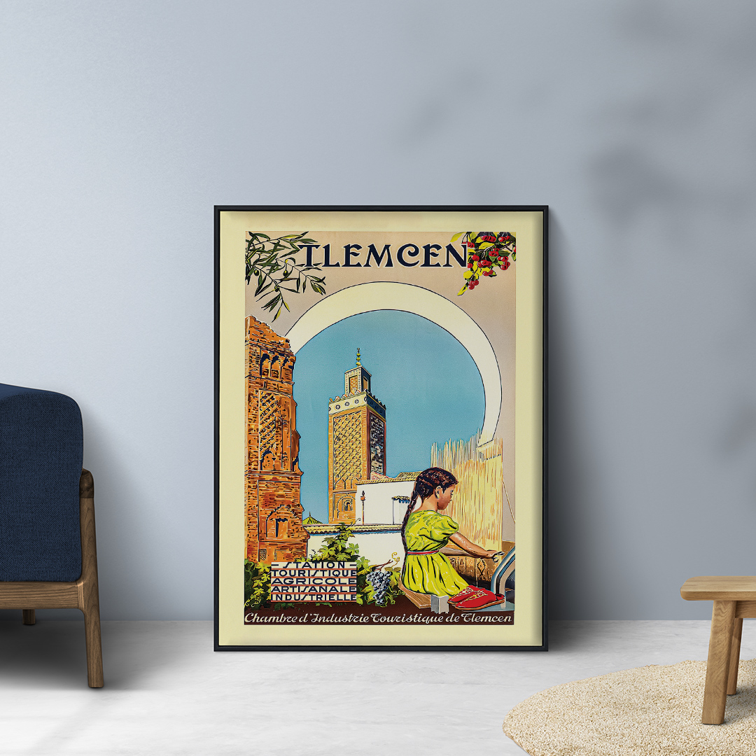 Affiche algérienne vintage dédiée à Tlemcen, éditée par la Chambre d’Industrie Touristique dans les années 1930. On y découvre une scène paisible où tradition, architecture et artisanat se mêlent sous le soleil d’Algérie. Une affiche emblématique pour les passionnés d’art et de patrimoine nord-africain.