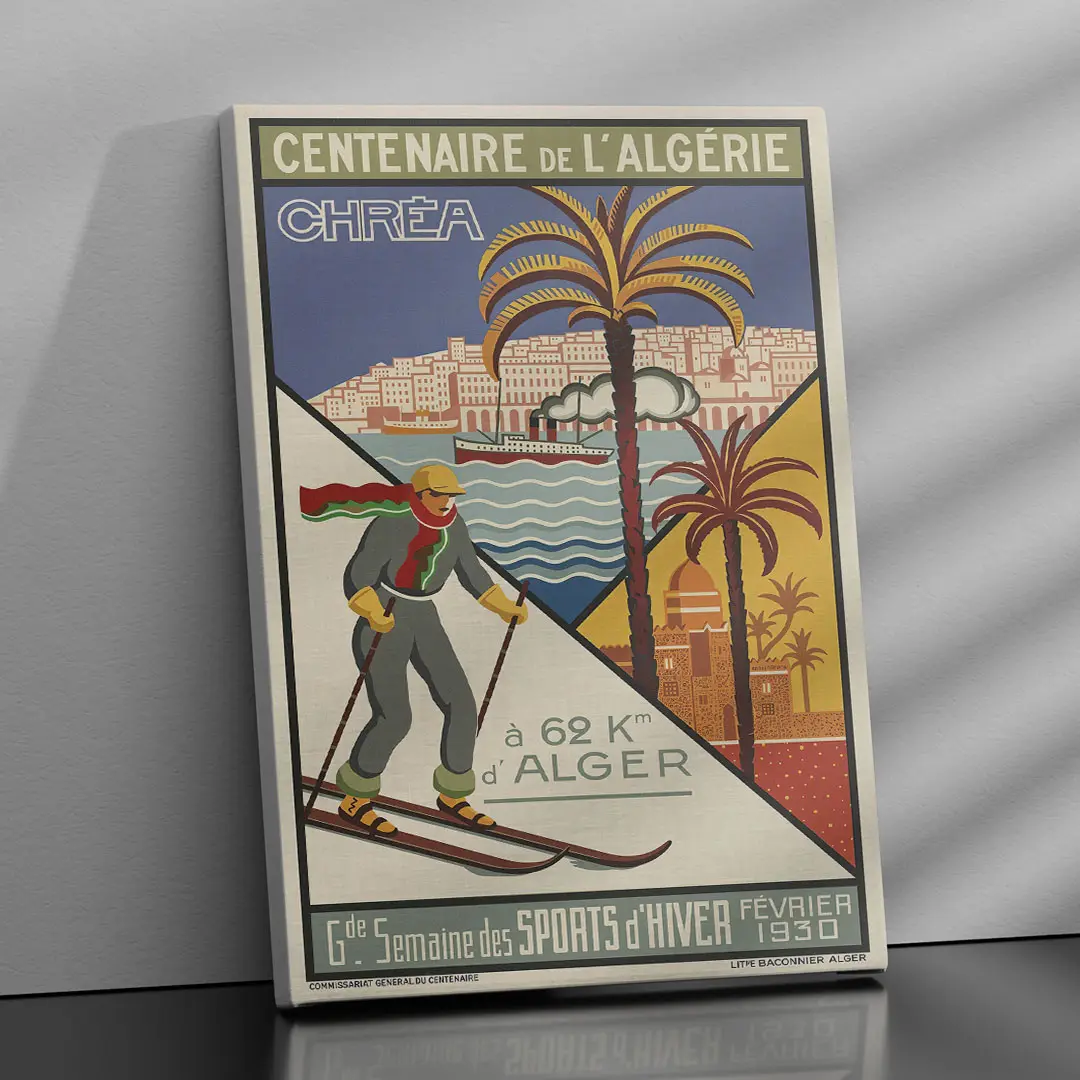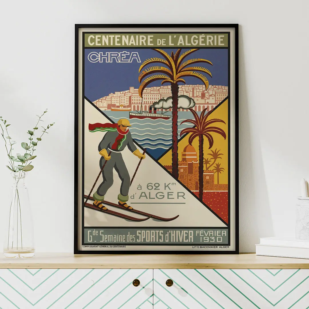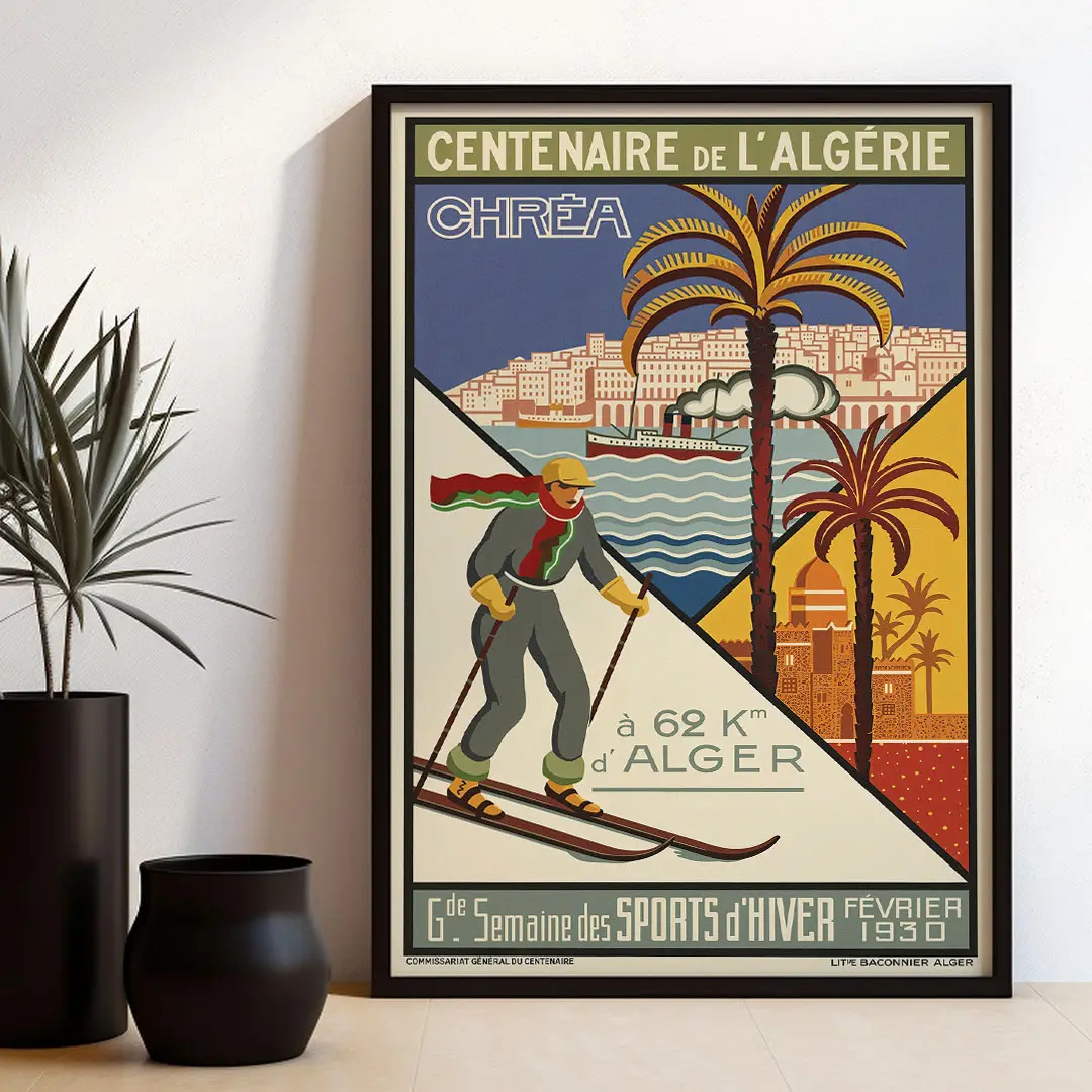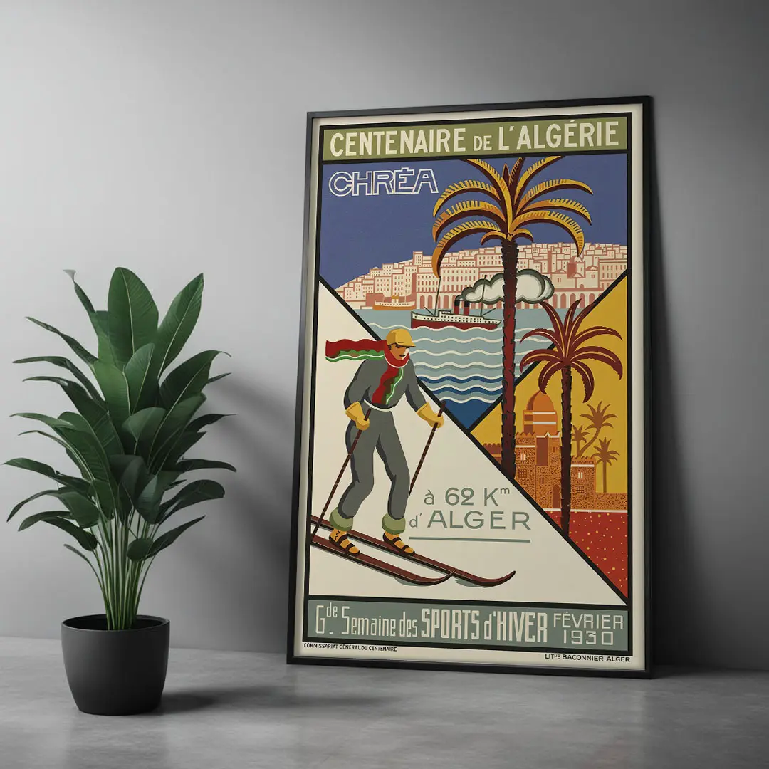 Plongez dans l’élégance des années 30 avec l’Affiche Algérie Vintage : Chréa Sports d’Hiver. Créée par l’artiste Georges-André Klein pour le Centenaire de 1930, cette œuvre célèbre le contraste unique du pays : le ski à deux pas de la mer. Entre modernisme Art Déco et nostalgie des sommets enneigés de l’Atlas, ce visuel iconique de la Lithographie Baconnier est une pièce maîtresse pour votre décoration. Disponible en haute qualité chez DzecoArt.