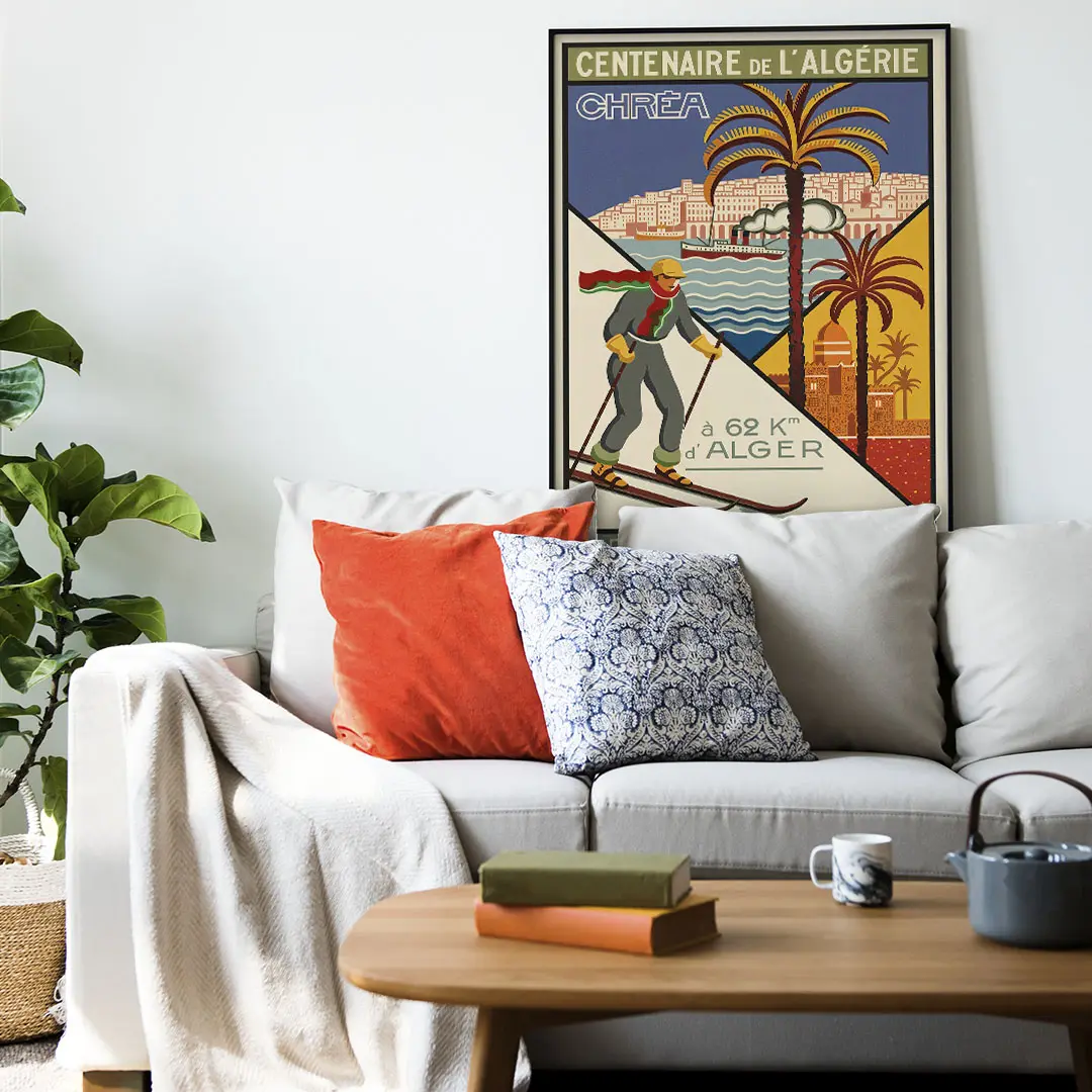 Opter pour l’Affiche Algérie Vintage : Chréa sur Dzeco.art, c’est garantir une ambiance « évasion » unique à votre intérieur. Vous êtes peut-être passionné de sports de montagne ou amoureux de l’histoire d’Alger. Dans les deux cas, ce tirage apporte une dimension historique et artistique indéniable à votre pièce.
