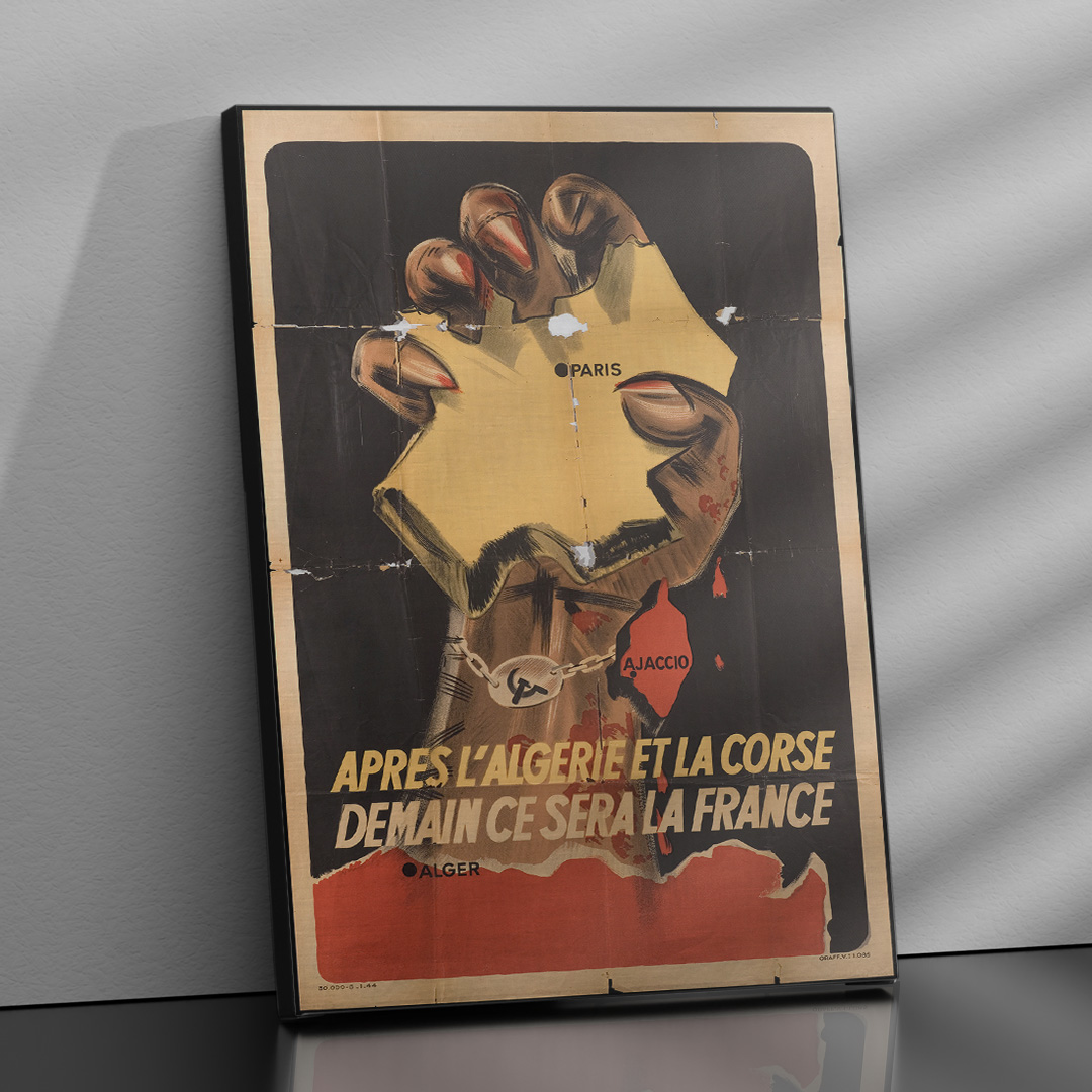 Affiche de propagande française de 1944, “Après l’Algérie et la Corse, demain ce sera la France” incarne une imagerie puissante et troublante. Entre histoire, message politique et esthétisme vintage, elle apporte une forte présence visuelle à votre intérieur. Disponible sur dzeco.art en plusieurs formats et finitions, cette reproduction soignée conjugue impact graphique et valeur patrimoniale.