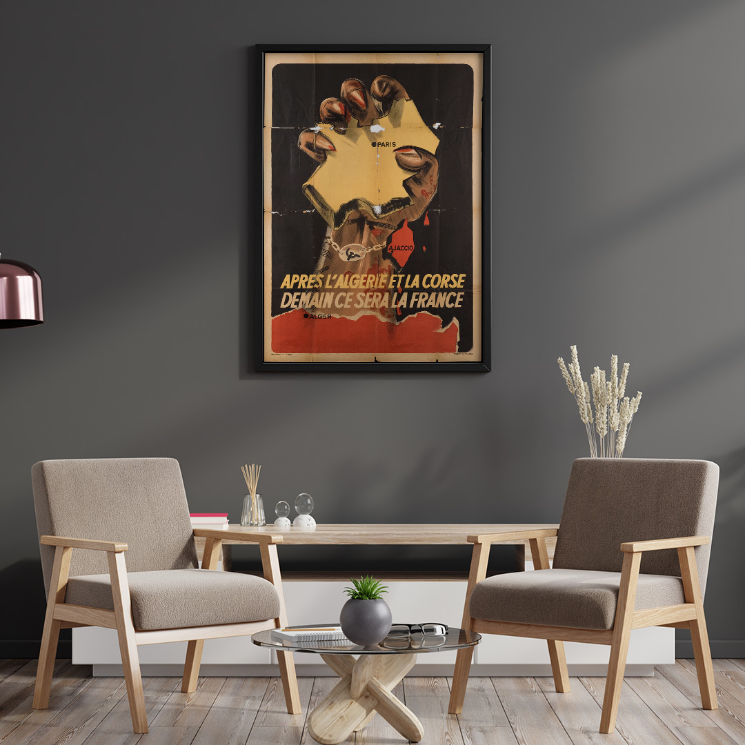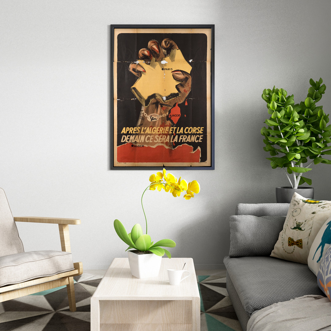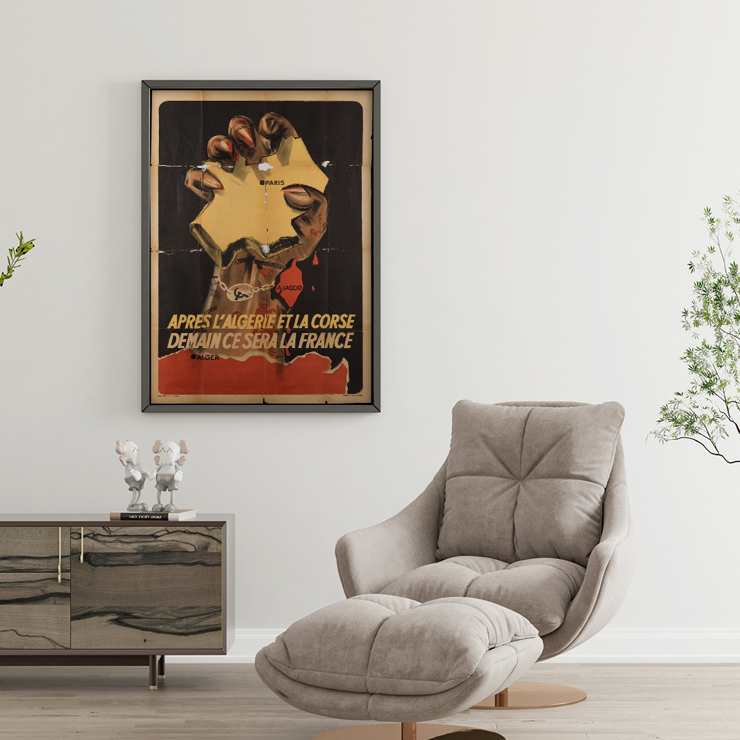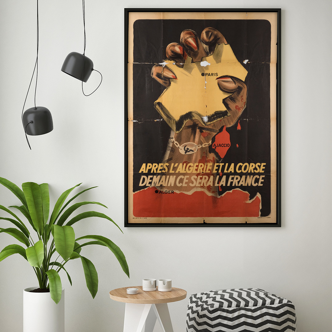 L’affiche “Après l’Algérie et la Corse, demain ce sera la France” séduit aujourd’hui les amateurs d’art vintage, mais aussi les passionnés d’histoire et de graphisme politique. En effet, elle trouve naturellement sa place dans un intérieur contemporain, un bureau ou une bibliothèque à caractère intellectuel.