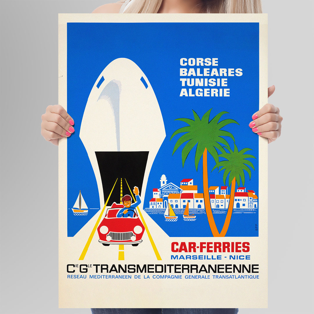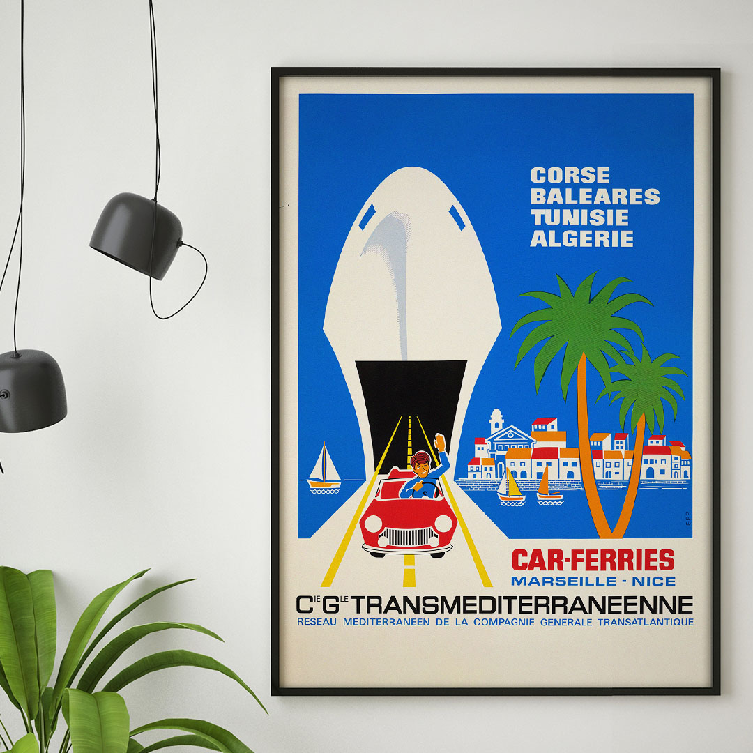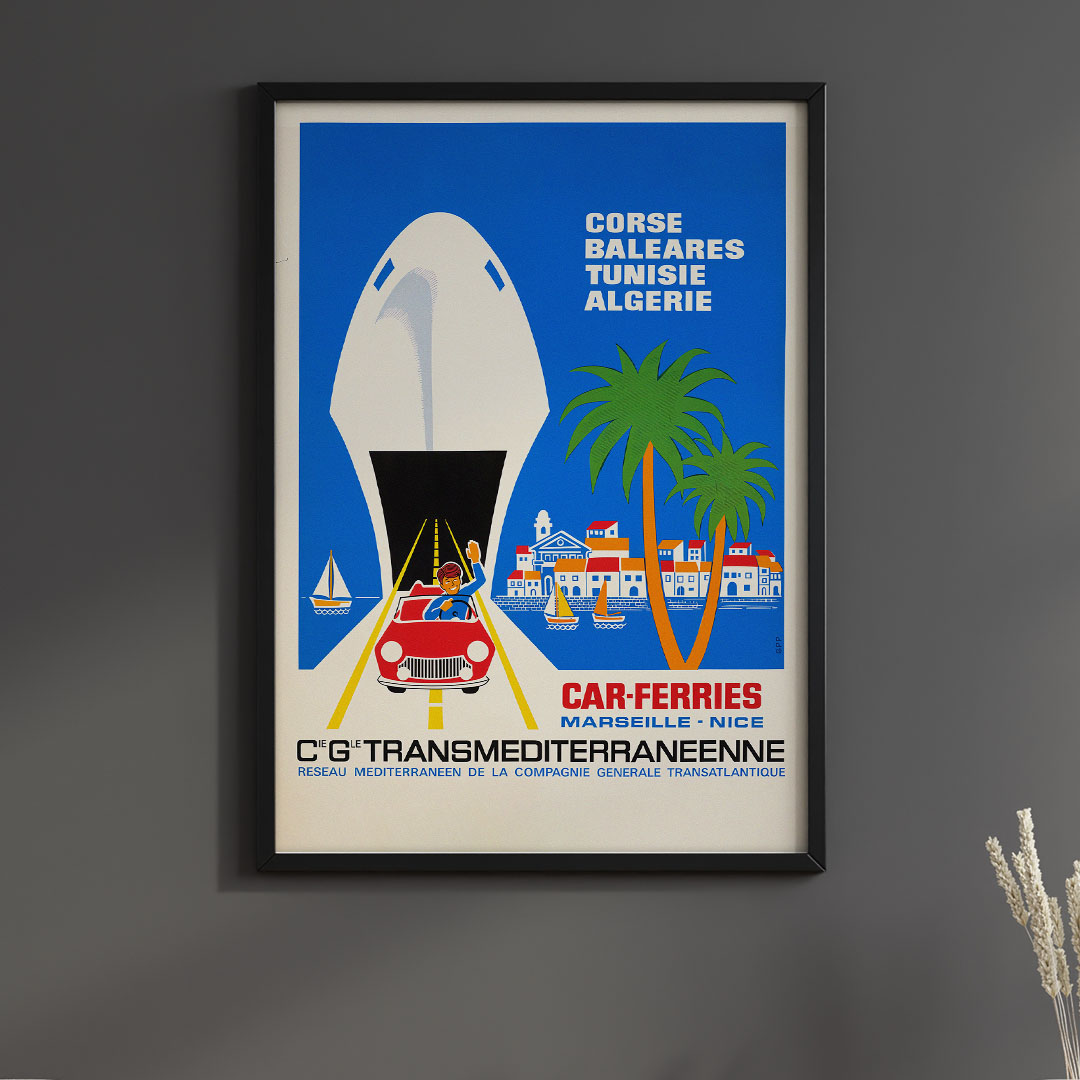 Sublime reproduction restaurée de l’affiche maritime Cie Gle Transméditerranéenne. Un visuel iconique des années 60 mêlant car-ferry, voiture de sport et palmiers. Idéal pour une décoration rétro chic évoquant les traversées vers la Corse et l’Afrique du Nord