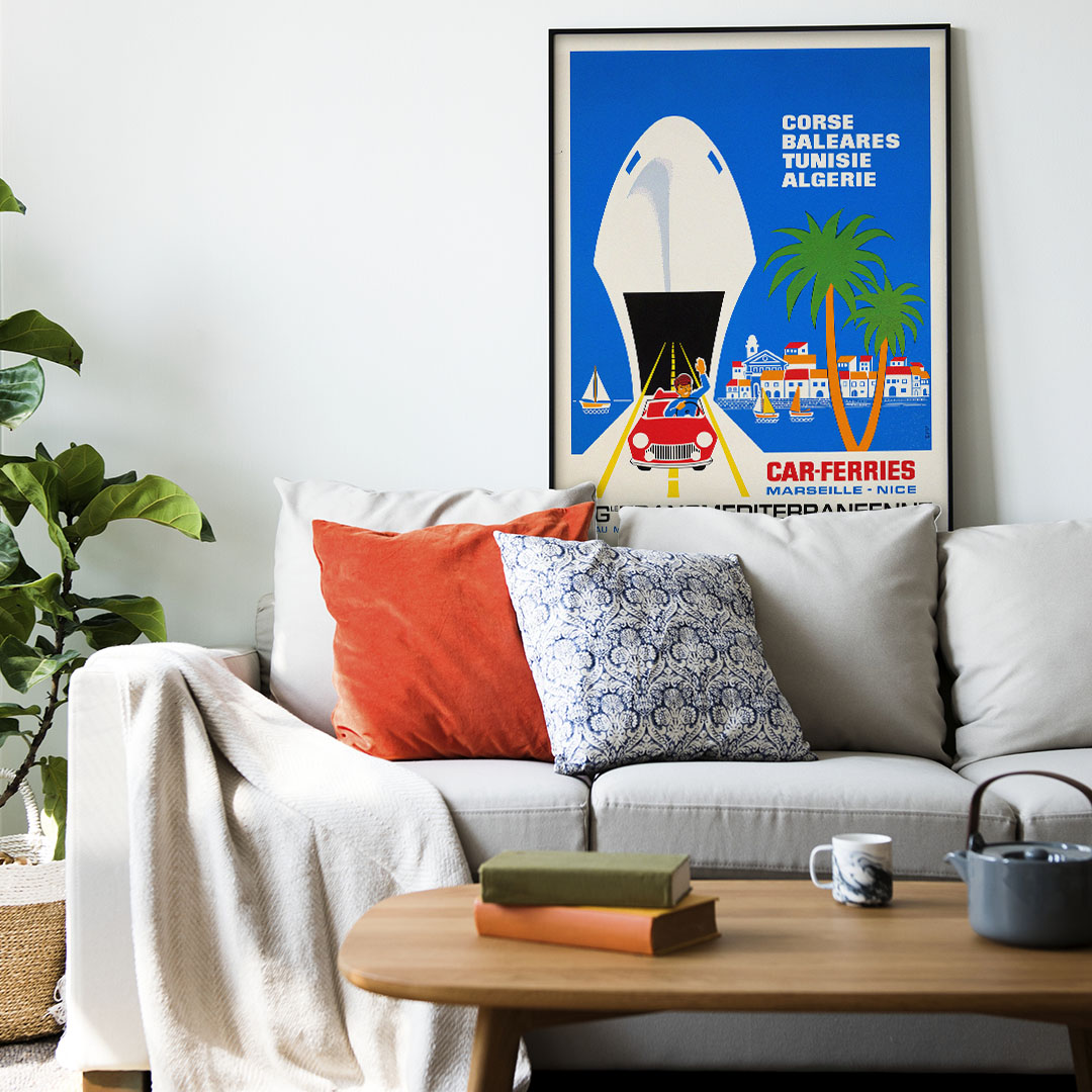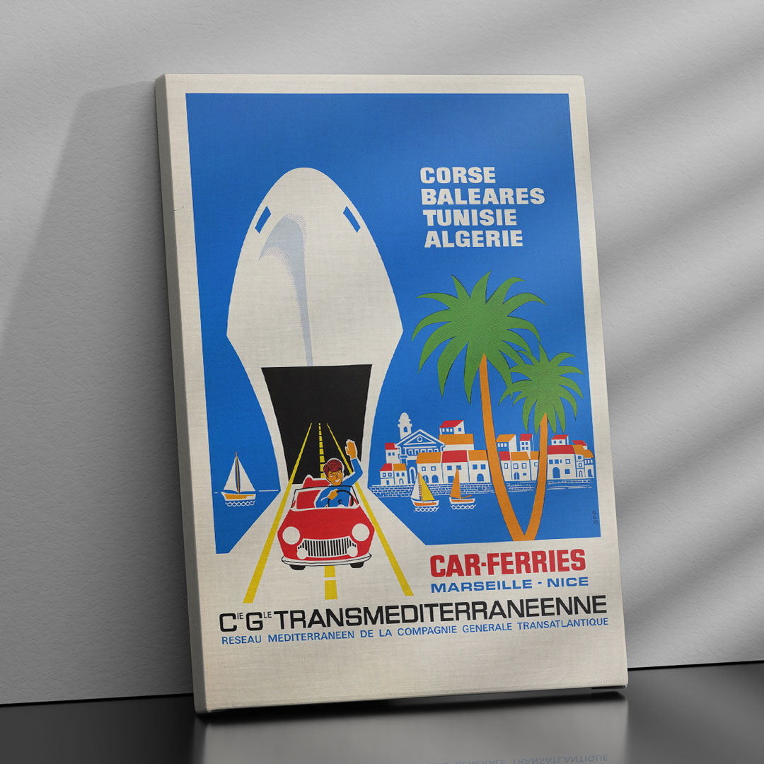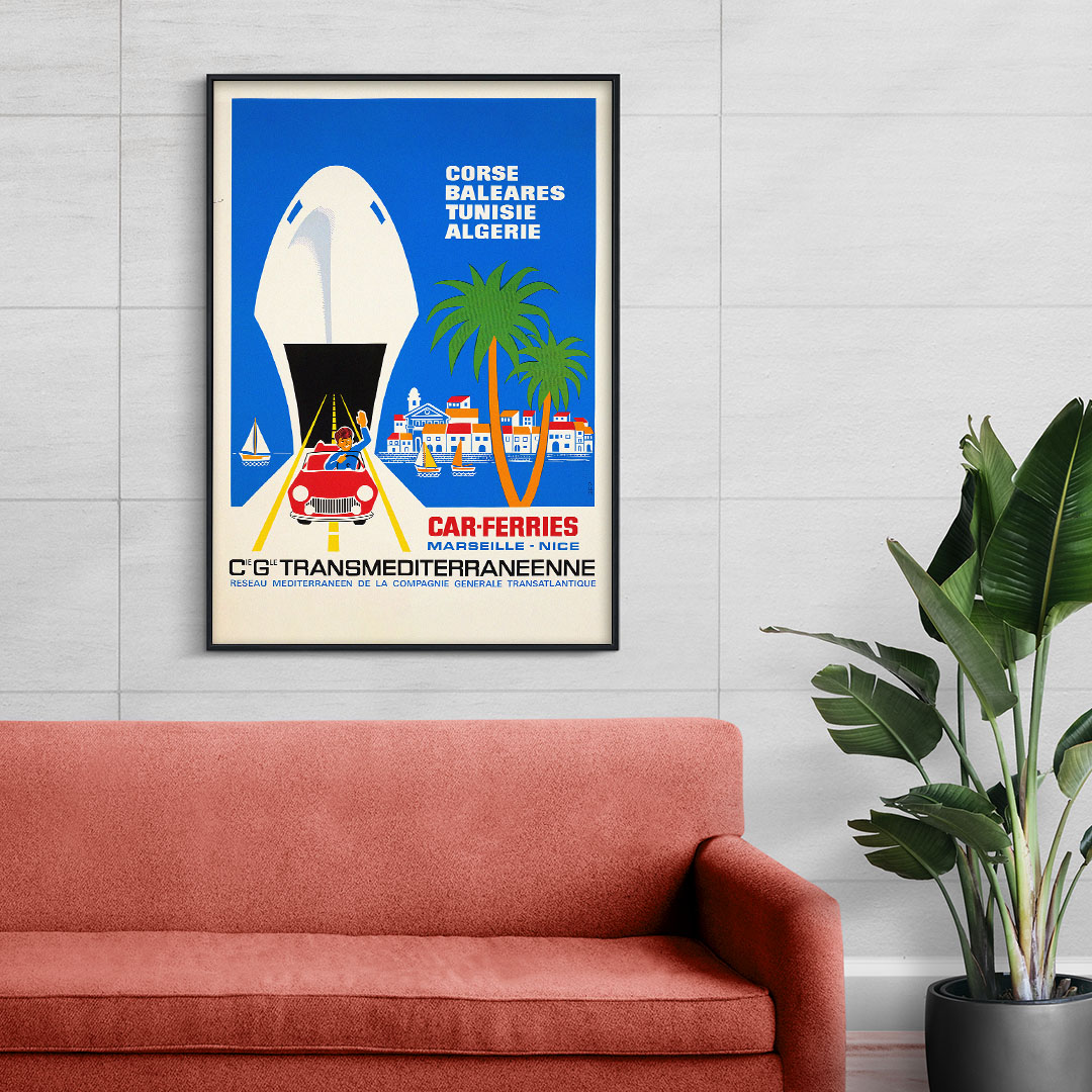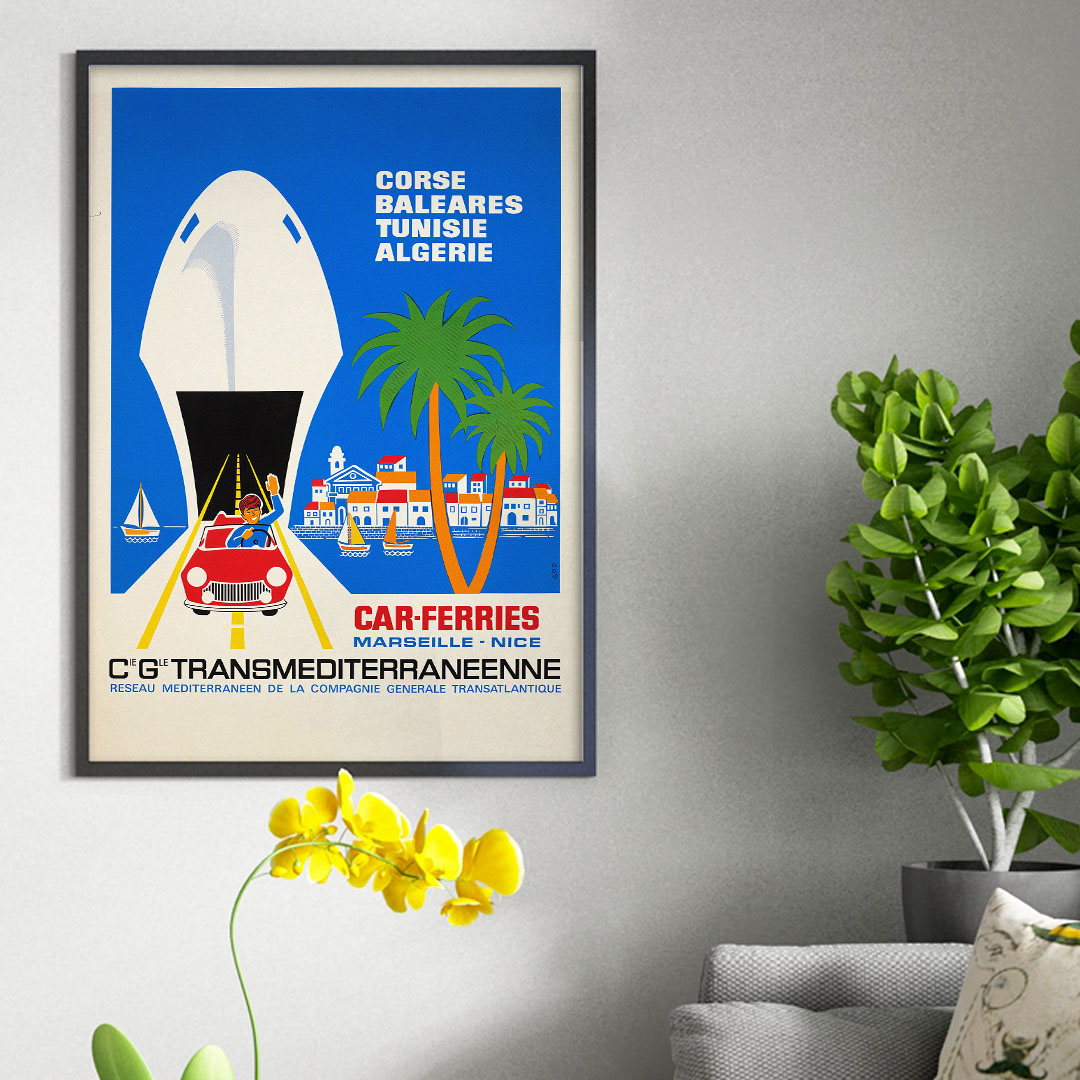 Sublime reproduction restaurée de l’affiche maritime Cie Gle Transméditerranéenne. Un visuel iconique des années 60 mêlant car-ferry, voiture de sport et palmiers. Idéal pour une décoration rétro chic évoquant les traversées vers la Corse et l’Afrique du Nord