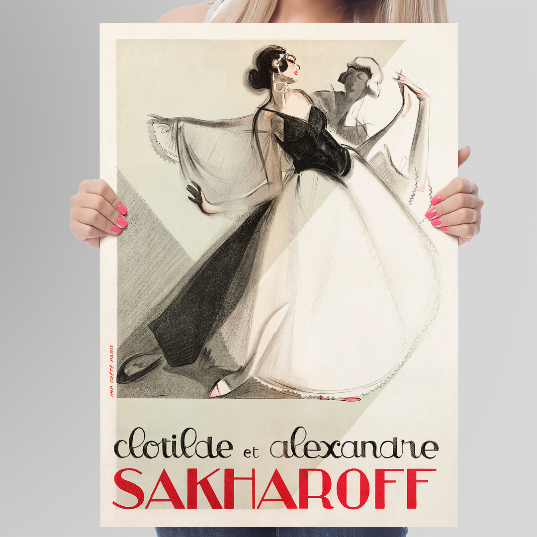 L’affiche Clotilde et Alexandre Sakharoff est une œuvre emblématique du début du XXᵉ siècle, célébrant l’audace et l’élégance du célèbre couple de danseurs russes. Véritables pionniers de la danse moderne et de l’expression corporelle, les Sakharoff ont marqué la scène artistique européenne par leur style avant-gardiste et leur esthétique singulière.