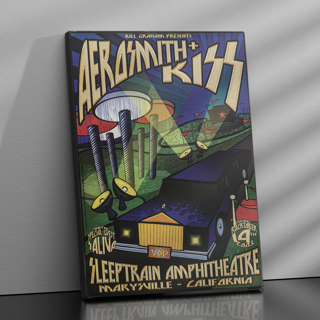 Cette affiche de concert Aerosmith and Others – Sleep Train Amphitheatre – October 14, 2003 incarne l’esprit des grandes tournées rock américaines du début des années 2000. Elle met en avant Aerosmith, accompagné notamment de KISS, dans un contexte de show spectaculaire et de musique live à grande échelle.