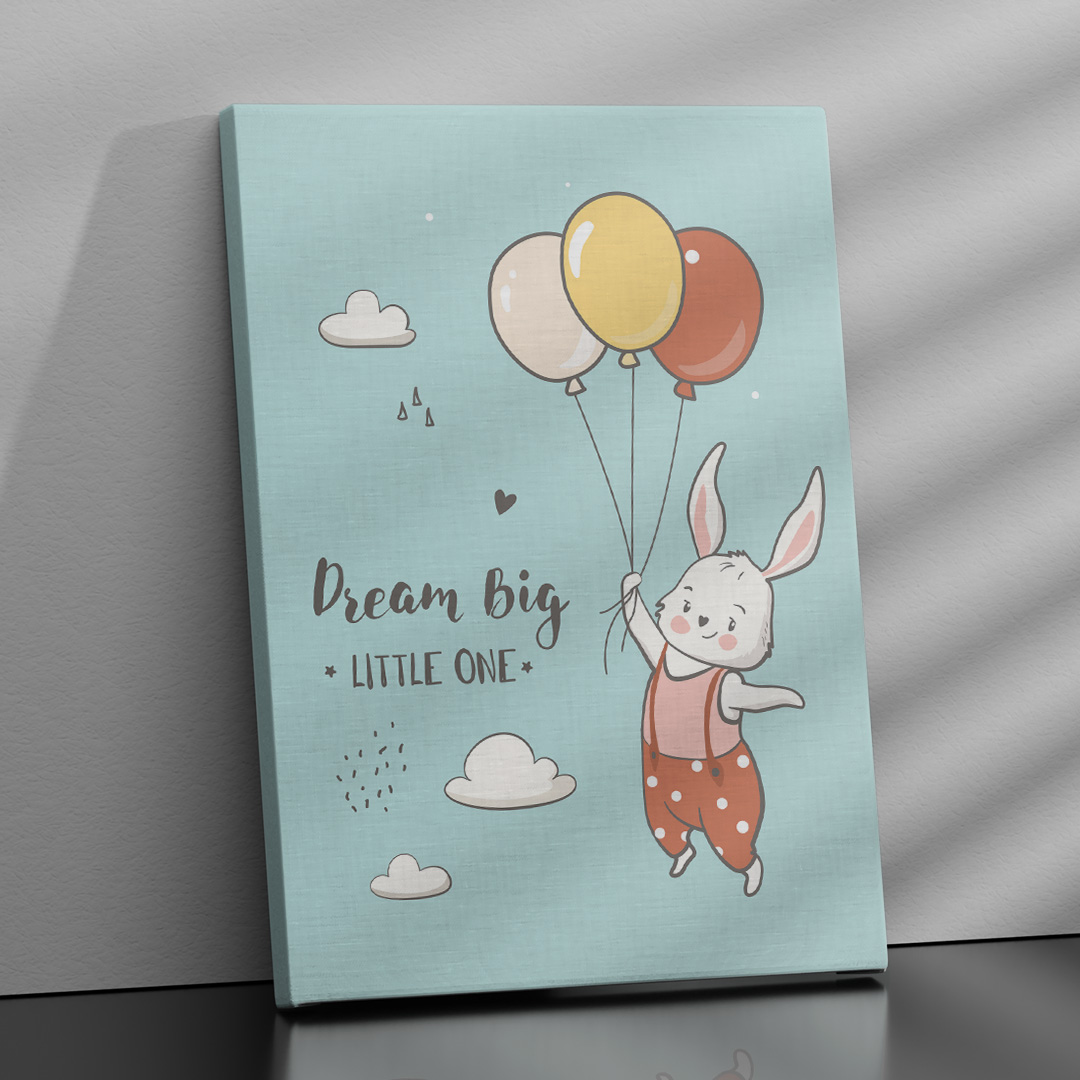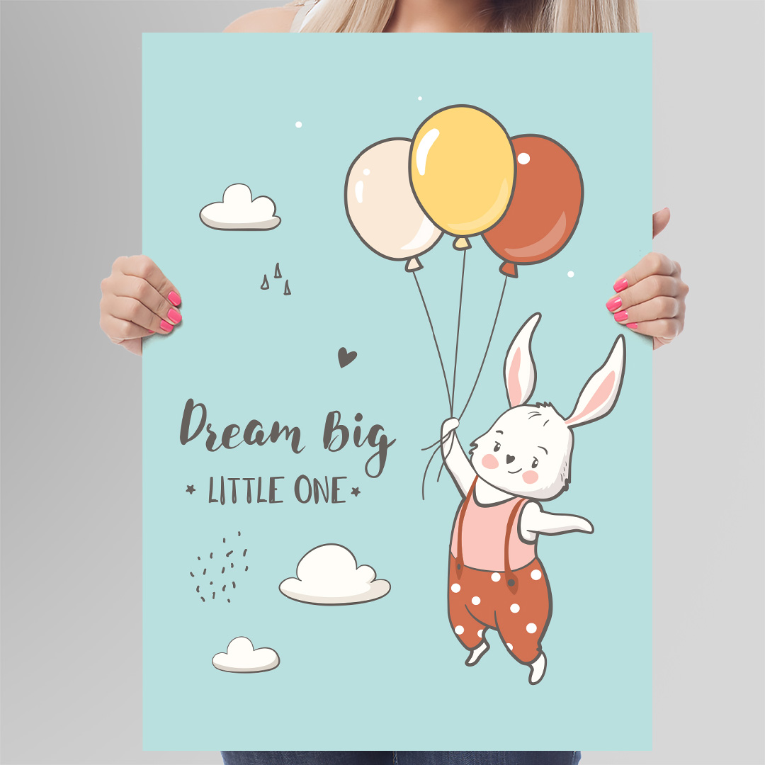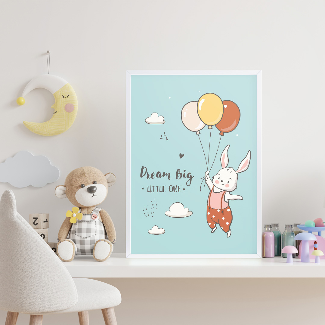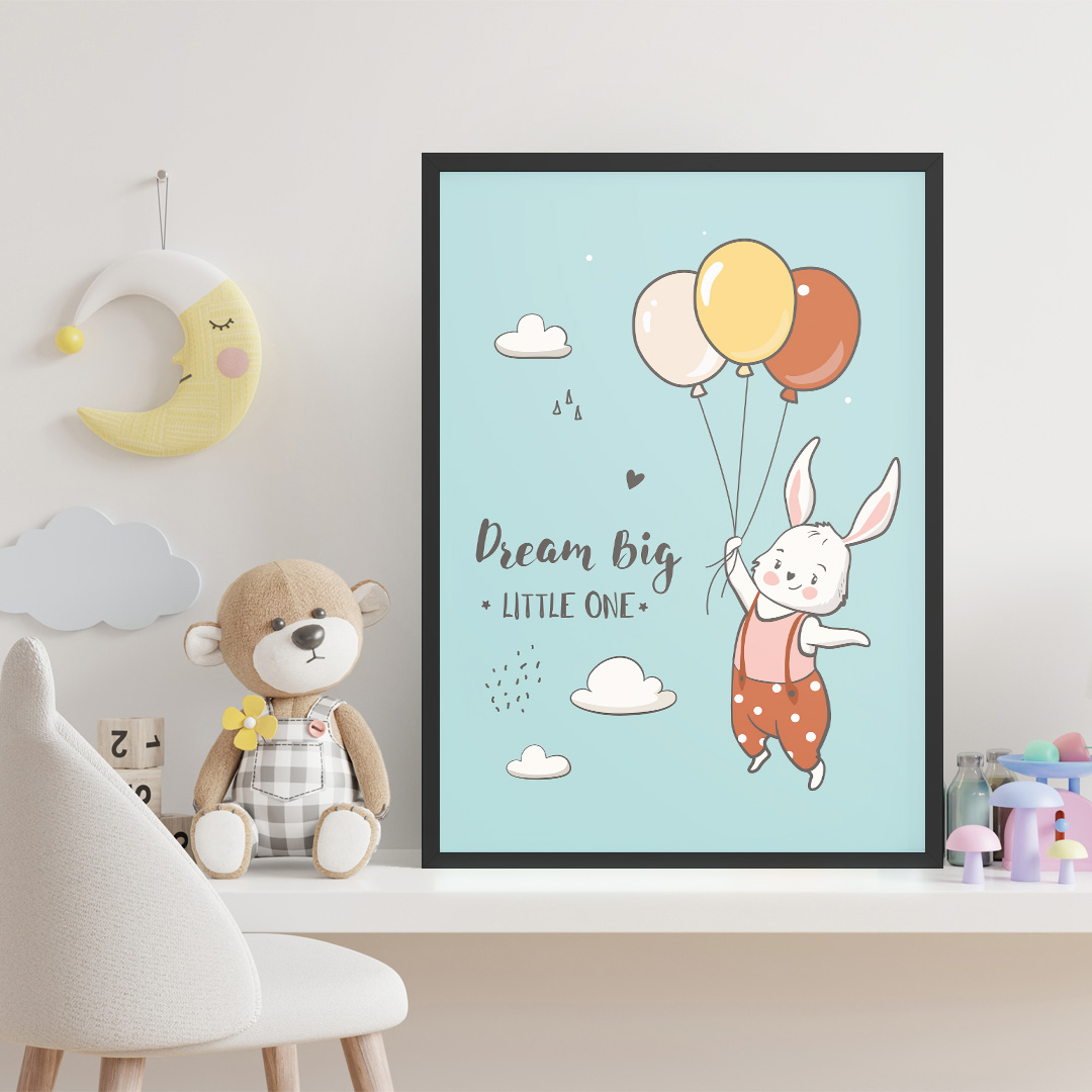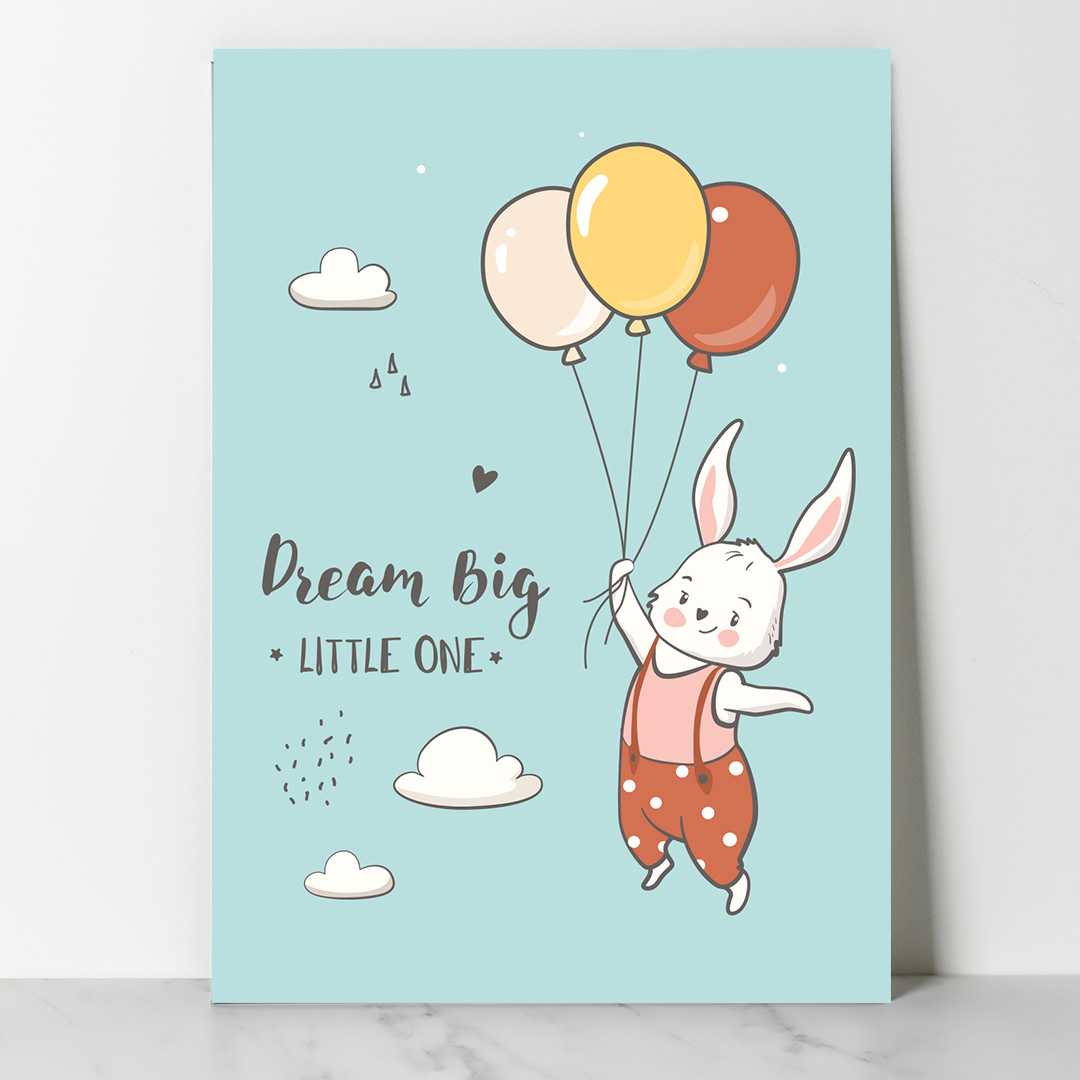 Affiche décorative chambre bébé au fond bleu pastel avec un lapin tenant trois ballons et le titre “Dream Big, Little One”. Disponible du A4 au A1, en cadre ou en toile prête à accrocher. Une décoration douce, tendre et inspirante pour la chambre de votre enfant.