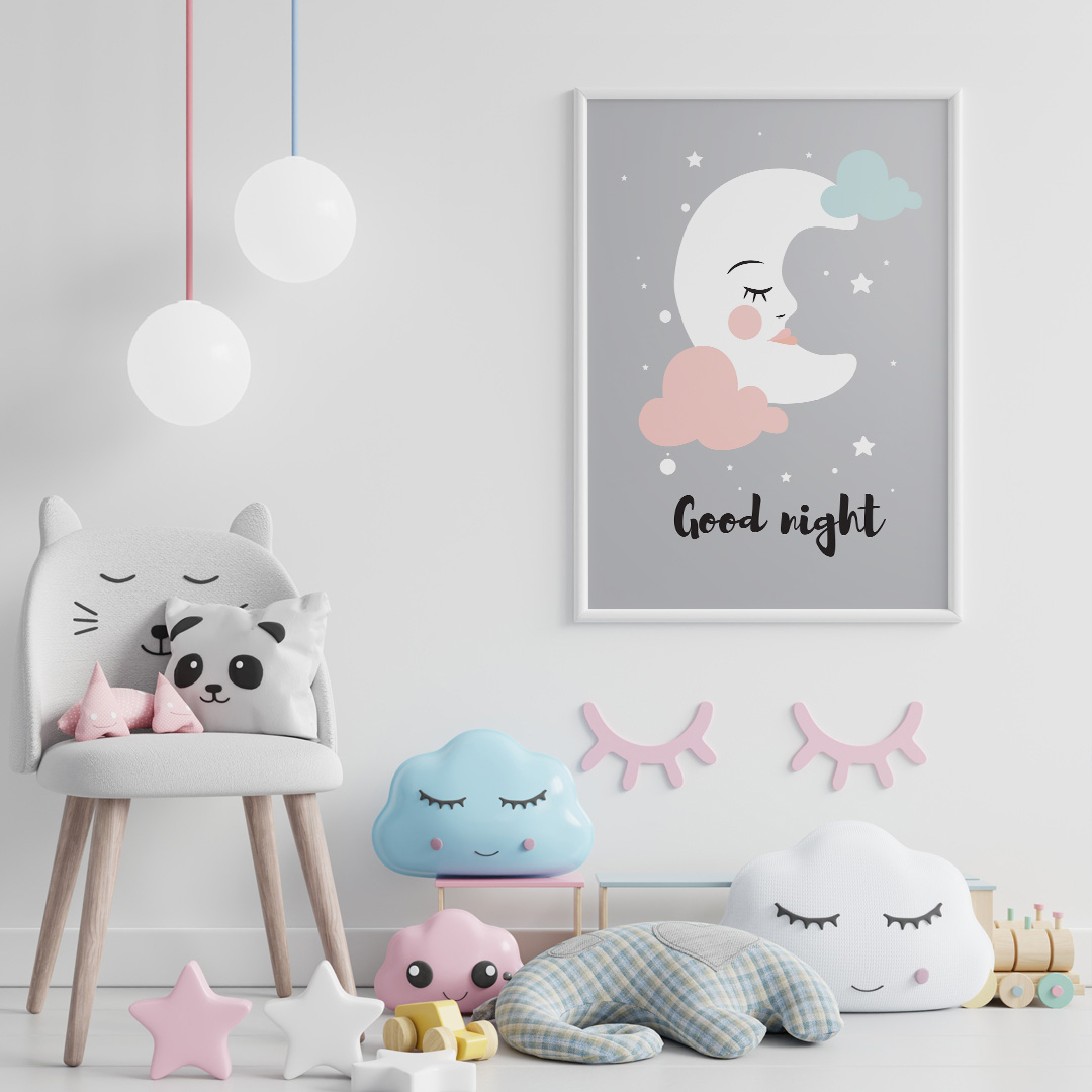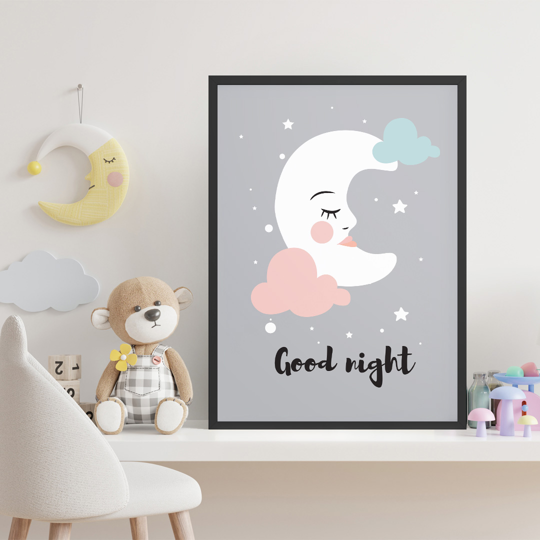 Apportez une ambiance douce et apaisante à la chambre de votre bébé avec cette superbe affiche décorative. Le fond gris clair crée un environnement calme et relaxant. Au centre, un adorable croissant lunaire dormant apporte une touche de tendresse et de sérénité. Le titre « Good Night », placé en haut de l’affiche, invite au repos et à la douceur du coucher. Ainsi, votre bébé bénéficie d’un espace à la fois chaleureux et réconfortant.