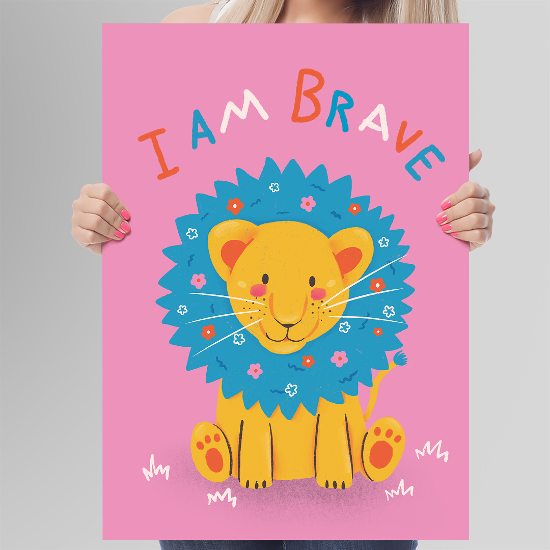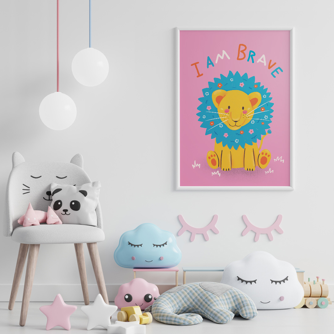 Affiche lion enfant I Am Brave. Disponible en cadre avec verre (3 couleurs) ou toile tendue. Formats : A4, A3, A2, A1. Idéale pour chambre bébé ou salle de jeux.