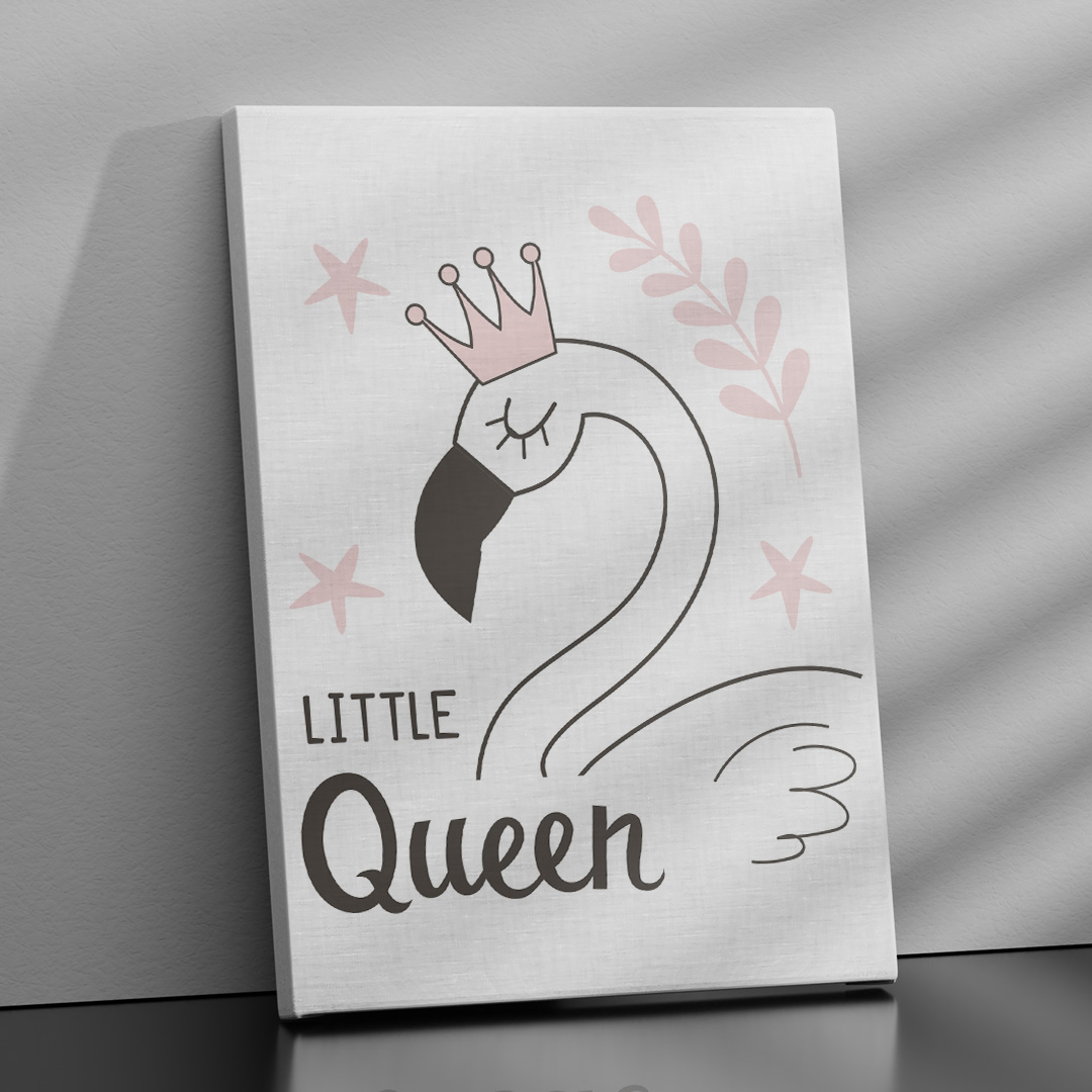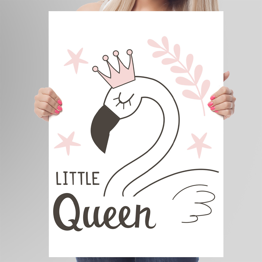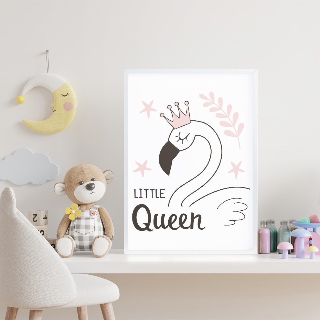 Apportez élégance et douceur à la chambre de votre bébé avec cette adorable affiche décorative. Le fond blanc lumineux crée une ambiance claire et apaisante. En bas de l’affiche, un flamant est dessiné au trait, entouré de petites décorations en pastel, apportant un visuel délicat et raffiné. Le titre « Little Queen », placé en bas, ajoute une touche ludique et charmante, parfaite pour personnaliser la chambre de votre petite princesse.