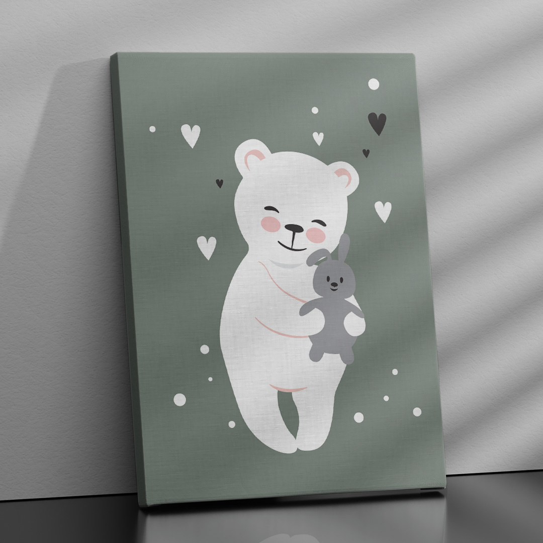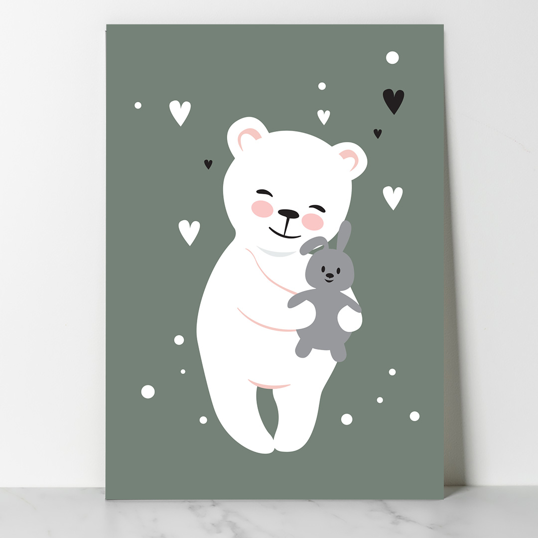 Affiche décorative chambre bébé avec fond vert pastel, nounours blanc entouré de cœurs. Quatre formats disponibles, cadre ou toile prête à accrocher.