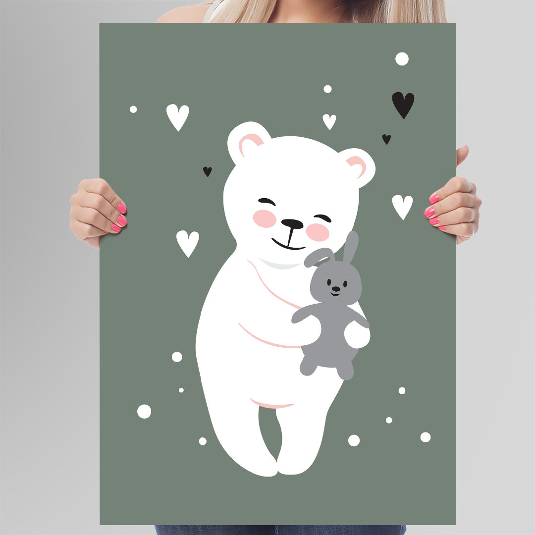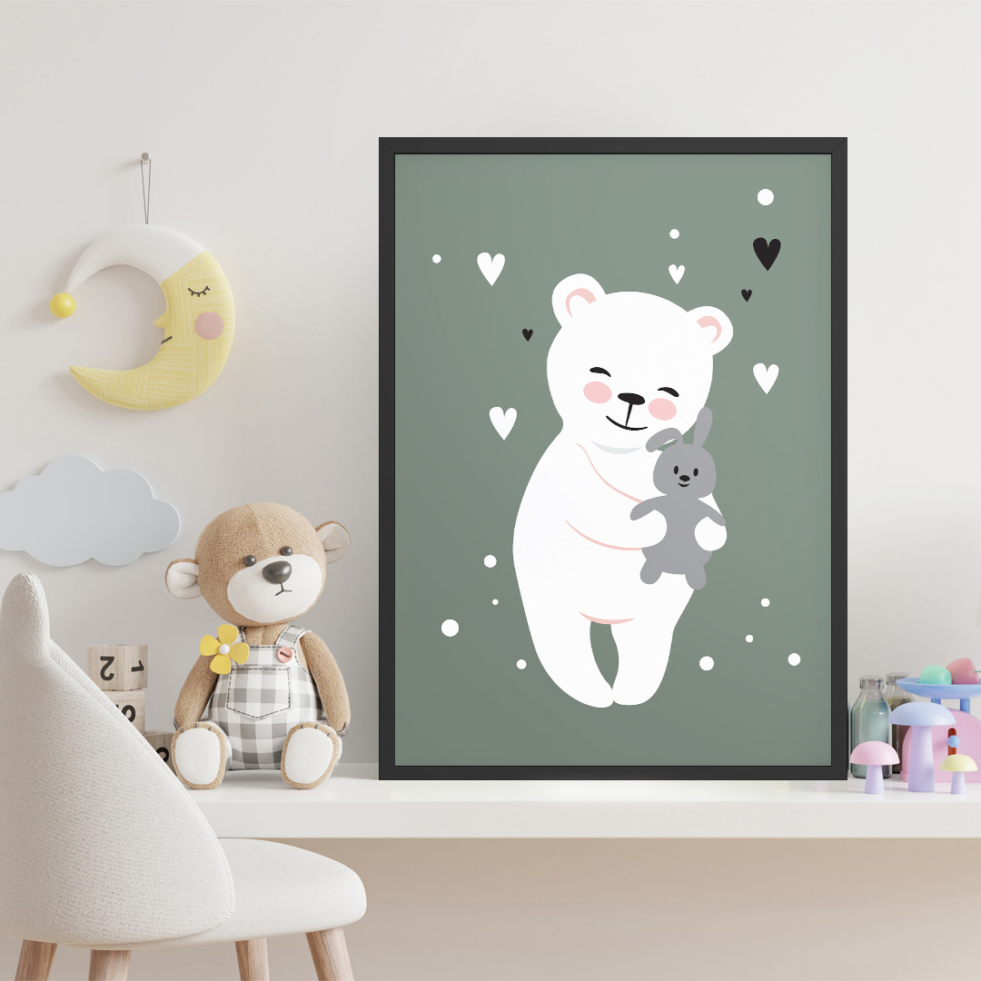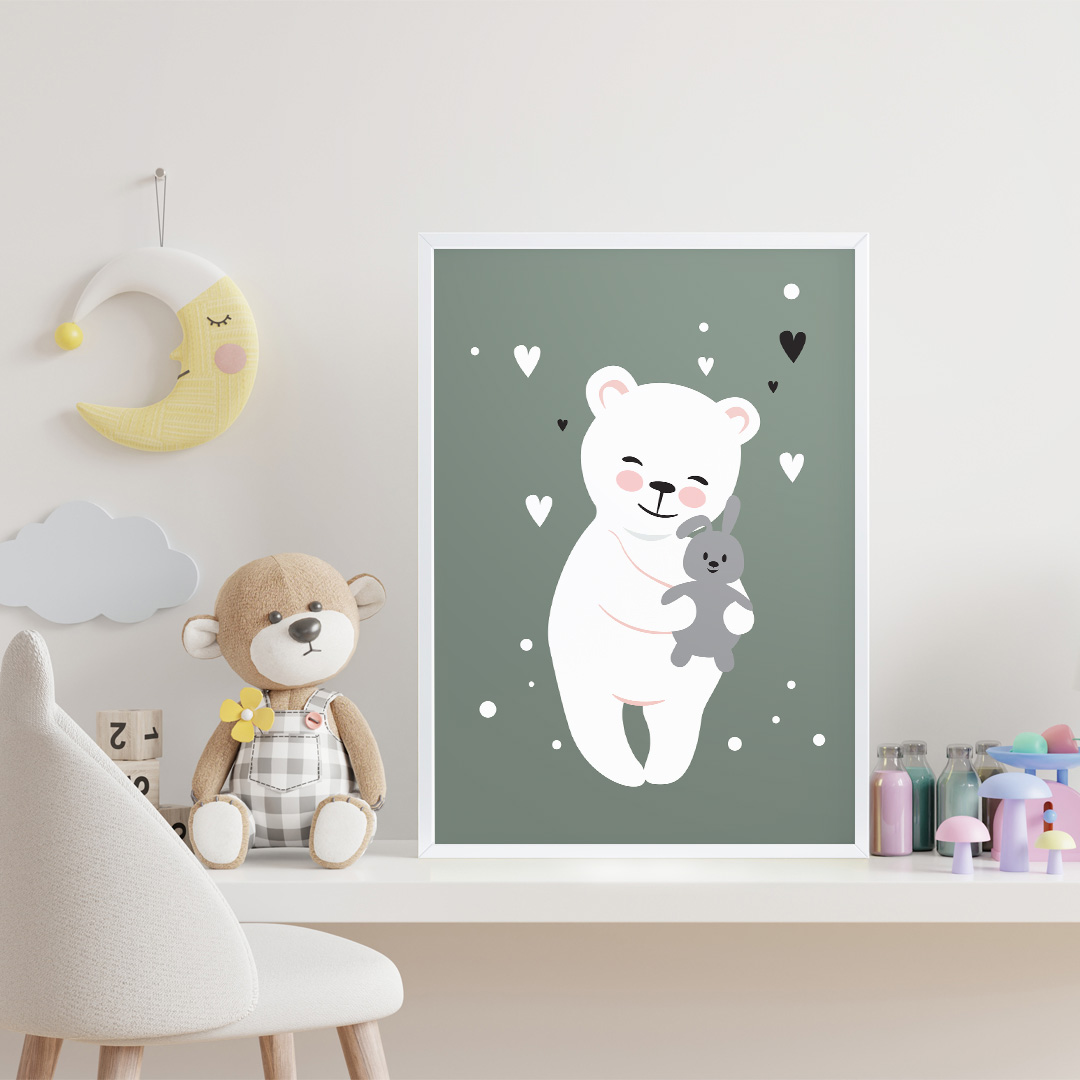 Cette affiche constitue également un cadeau parfait pour célébrer une naissance ou un anniversaire. Son fond vert pastel, son nounours blanc et ses cœurs apportent une touche de douceur qui plaira aux parents et aux enfants. Offrez une décoration originale qui rend la chambre plus joyeuse, apaisante et accueillante. Chaque regard sur l’affiche rappelle la tendresse et l’amour présents dans la chambre.