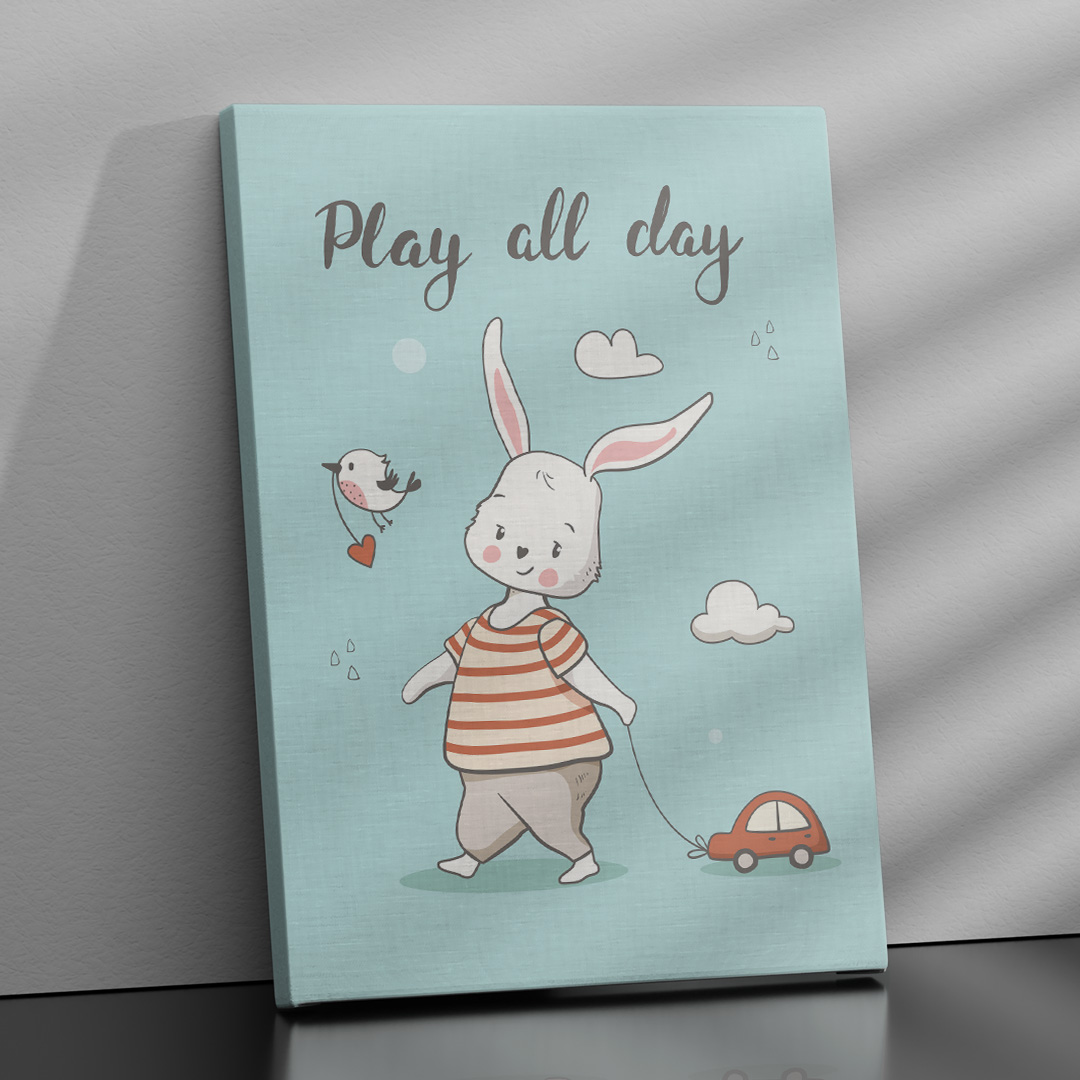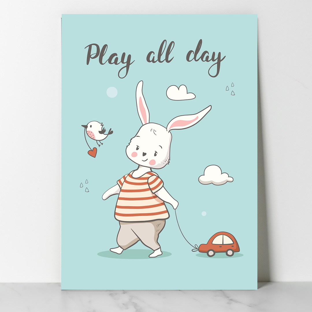 Affiche décorative chambre bébé au fond bleu pastel avec un lapin traînant une voiture, des nuages et un oiseau portant un cœur. Titre “Play All Day”. Disponible du A4 au A1, en cadre ou toile prête à accrocher. Une décoration douce, ludique et poétique pour stimuler l’imagination de votre enfant.