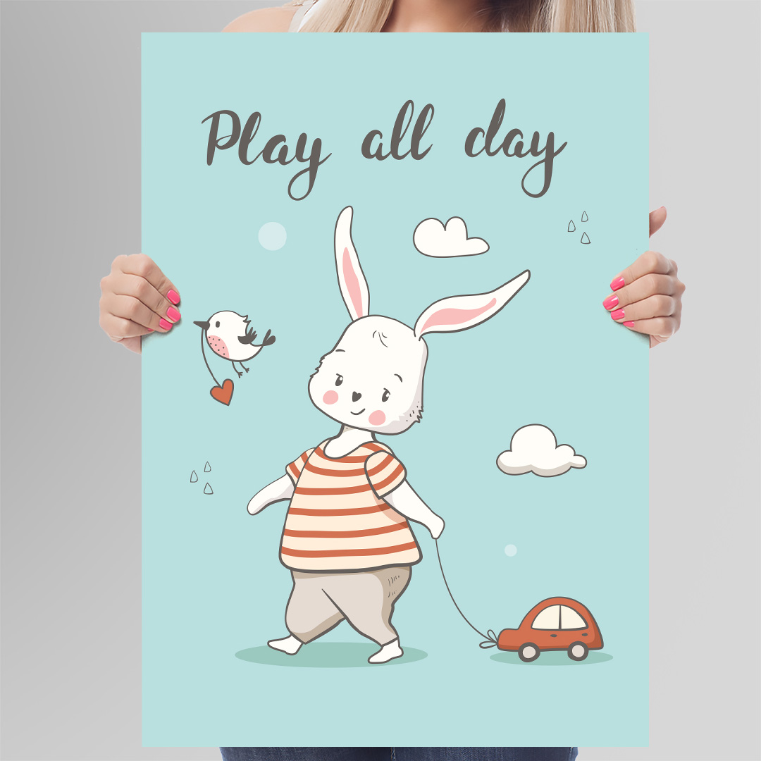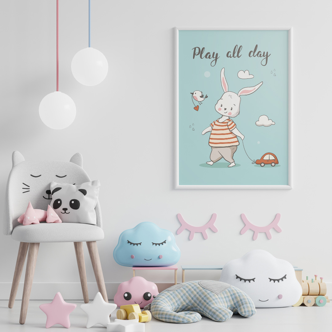 Cette affiche décorative chambre bébé “Play All Day” apporte une touche de gaieté et de douceur à la chambre de votre enfant. Le fond bleu pastel crée une atmosphère apaisante et lumineuse. L’illustration montre un petit lapin traînant une voiture, entouré de nuages, tandis qu’un oiseau survole la scène en tenant un cœur dans son bec. Cette composition raconte une histoire tendre et amusante qui stimule l’imagination des tout-petits.