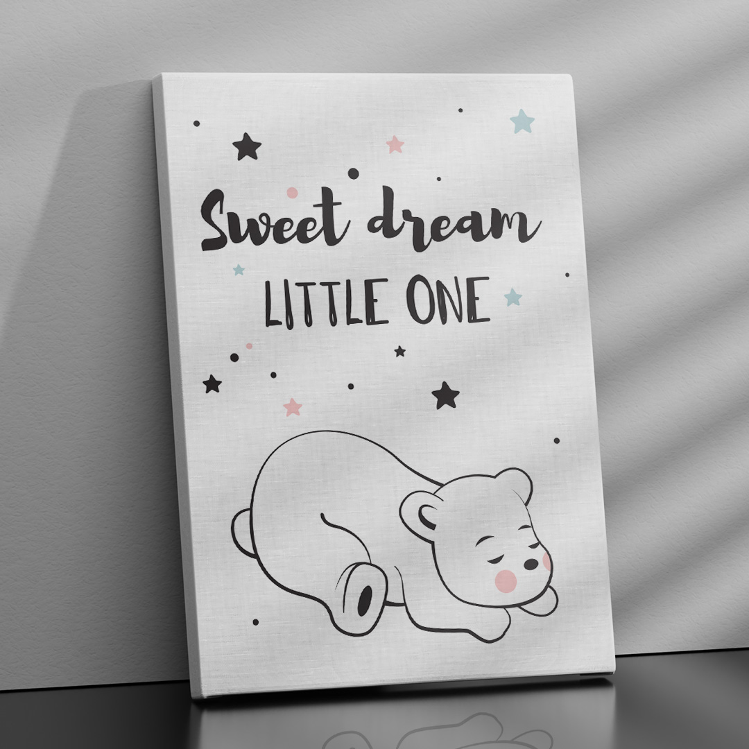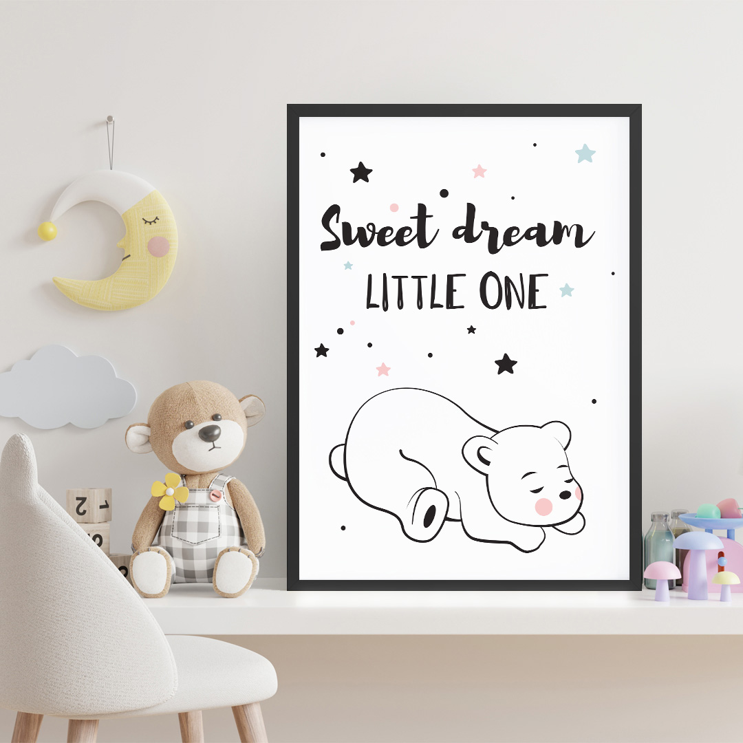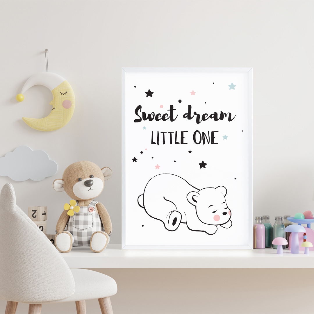 Apportez douceur et magie à la chambre de votre bébé avec cette adorable affiche décorative. Le fond blanc lumineux crée un espace clair et apaisant. En bas, un nounours est dessiné en train de dormir paisiblement. Au-dessus, le titre « Sweet Dream Little One » est entouré d’une pluie d’étoiles colorées, ajoutant une touche ludique et réconfortante. Ainsi, cette illustration apporte chaleur et imagination à la chambre de votre enfant.