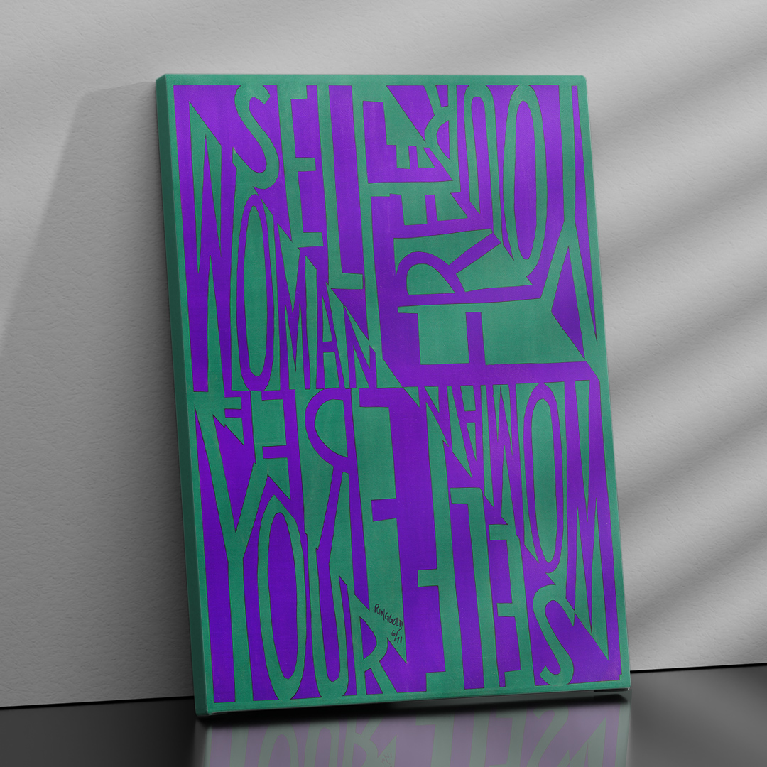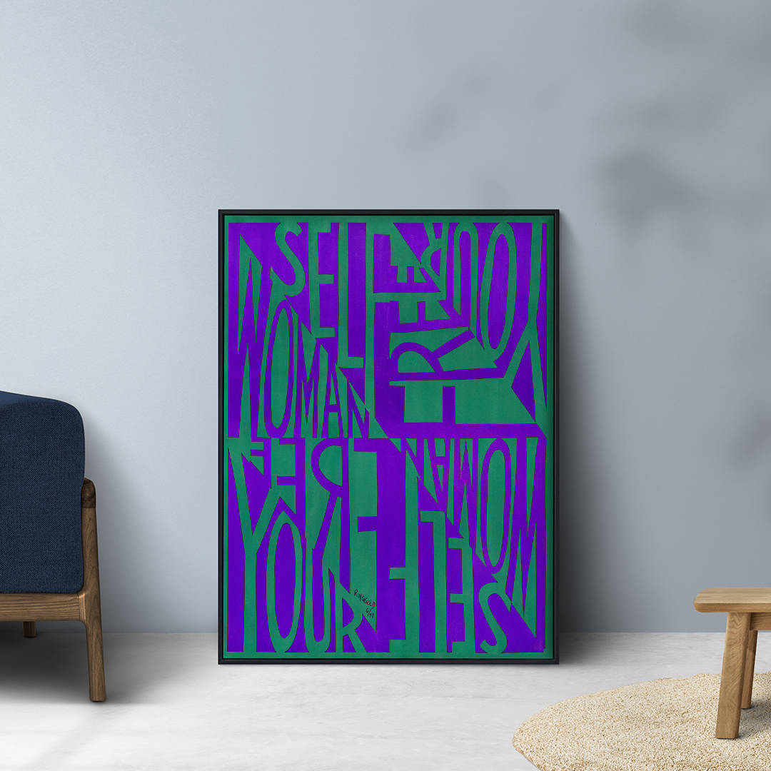 Affiche emblématique de Faith Ringgold, Woman Free Yourself (1971), symbole de liberté et de féminisme noir. Une œuvre vibrante aux tons violet et vert, à la fois artistique et engagée.