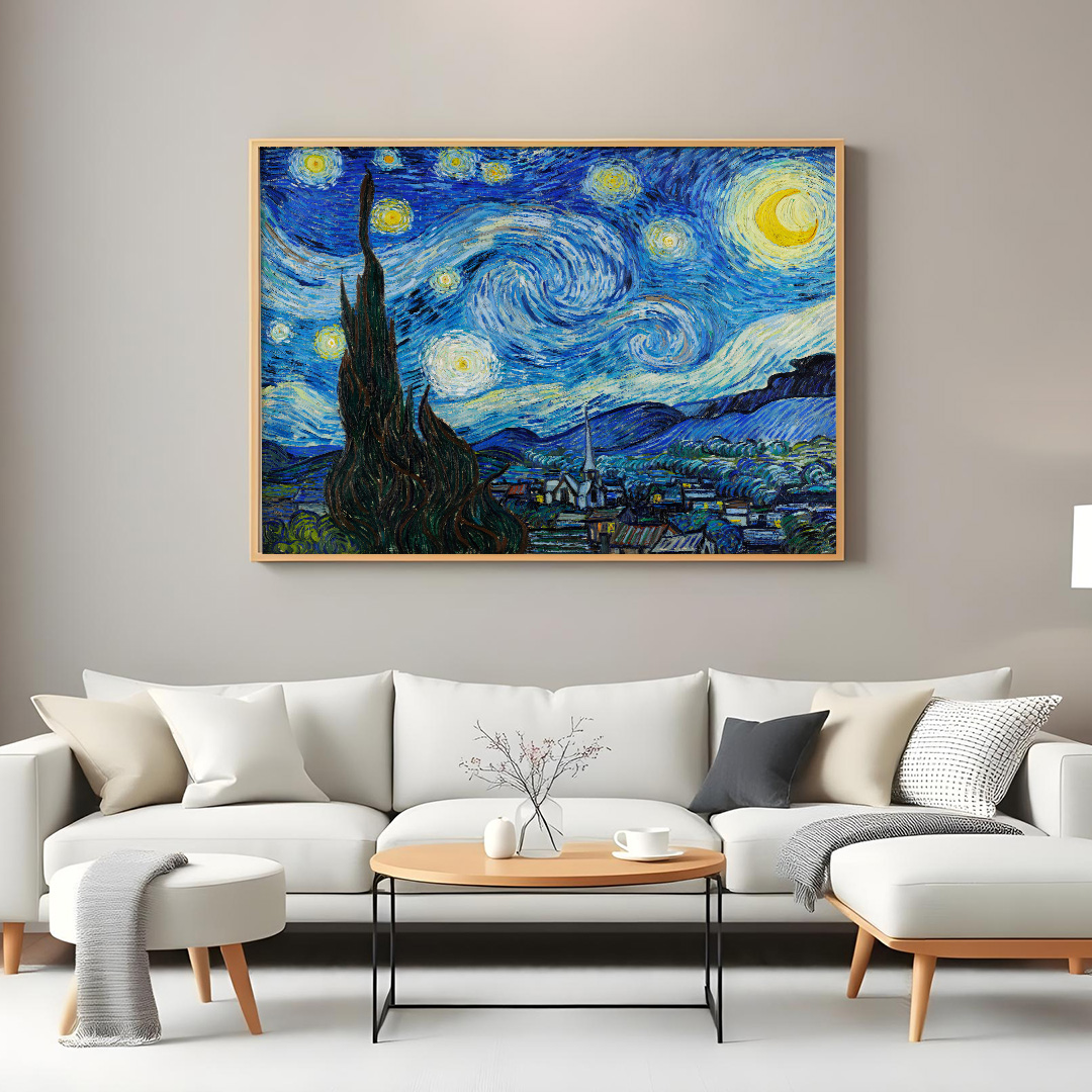 Affiche La Nuit étoilée – Vincent Van Gogh 1889, reproduction raffinée de ce chef-d’œuvre post-impressionniste. Elle apporte magie, poésie et sérénité à votre intérieur. Disponible du A4 au A1, en cadre ou en toile prête à accrocher, elle transforme chaque pièce en un lieu inspirant et apaisant.
