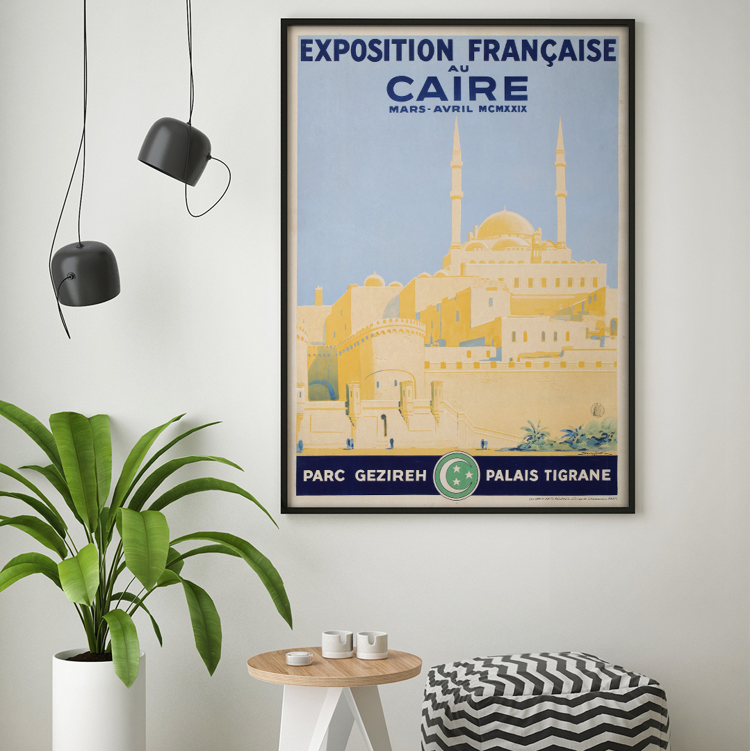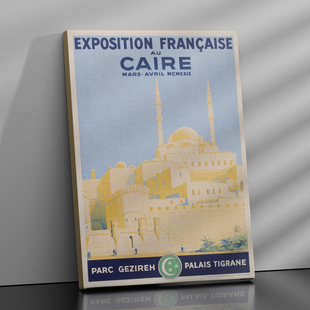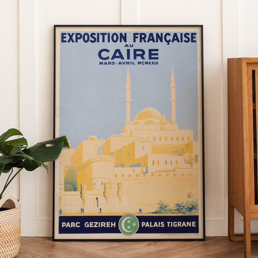 Affiche vintage Le Caire – Exposition Française 1929, organisée au Parc Gezireh et au Palais Tigrane. Une œuvre élégante et historique, idéale pour une décoration murale culturelle et raffinée.