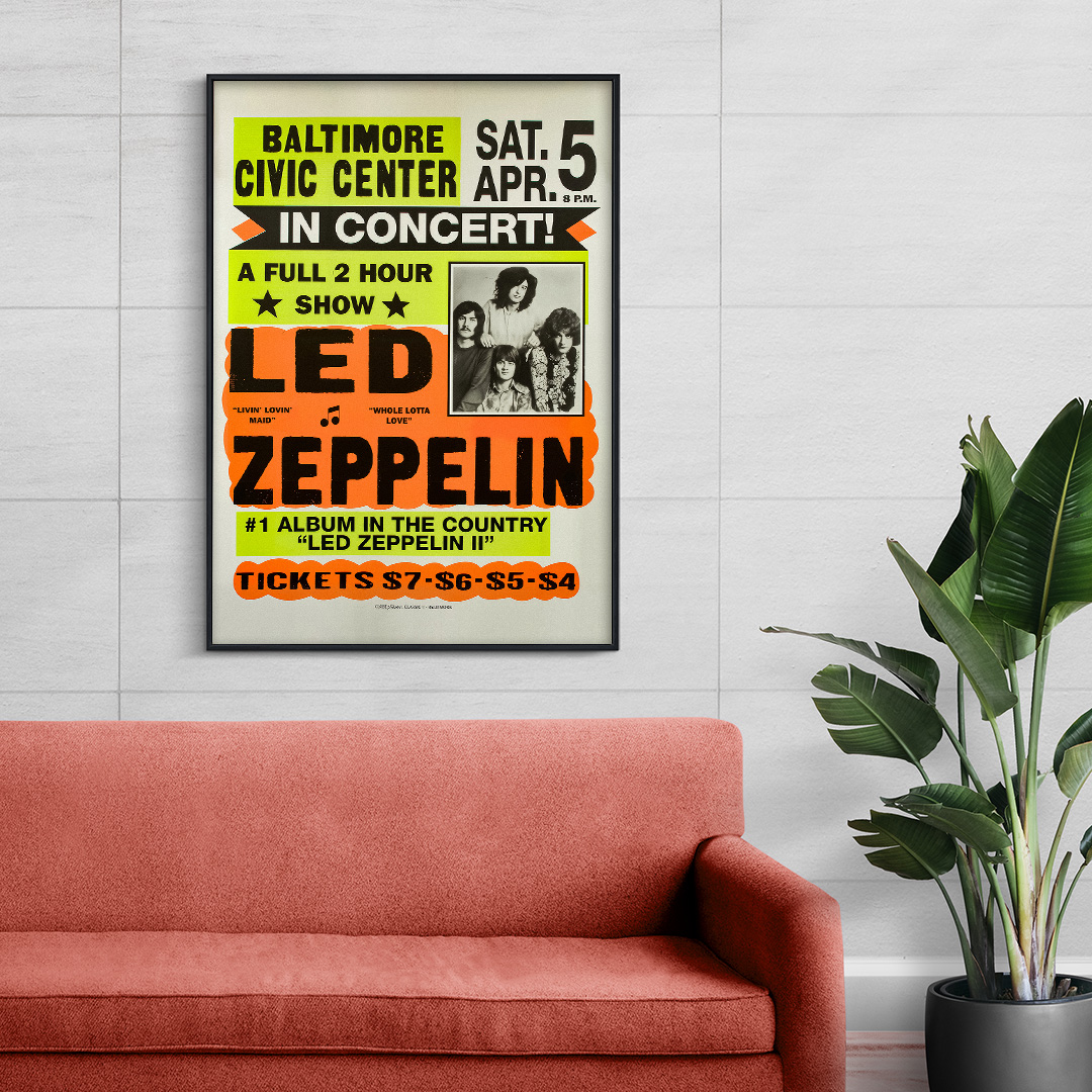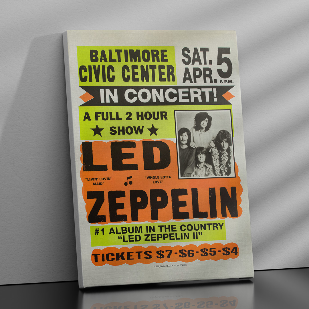 Revivez l’âge d’or du rock avec cette affiche Led Zeppelin Baltimore Civic Center. Ce poster rend hommage au concert mythique du 5 avril 1970, lorsque le groupe britannique dominait la scène mondiale. Ce soir-là, Led Zeppelin présentait Led Zeppelin II, l’album numéro 1 aux États-Unis, avec les titres cultes Whole Lotta Love et Livin’ Lovin’ Maid.