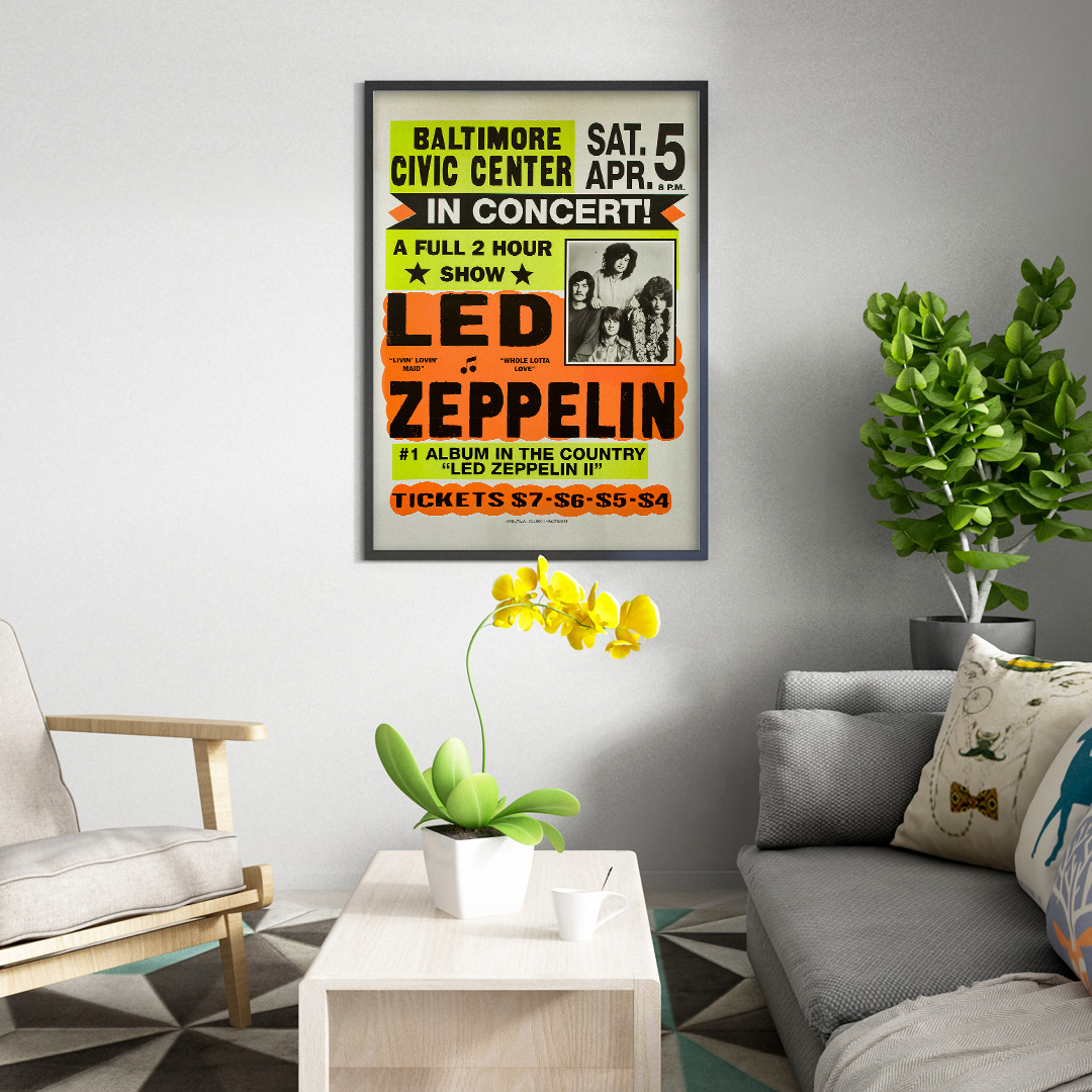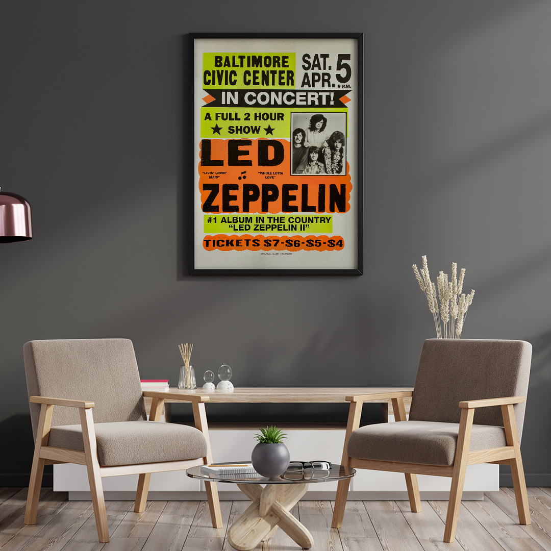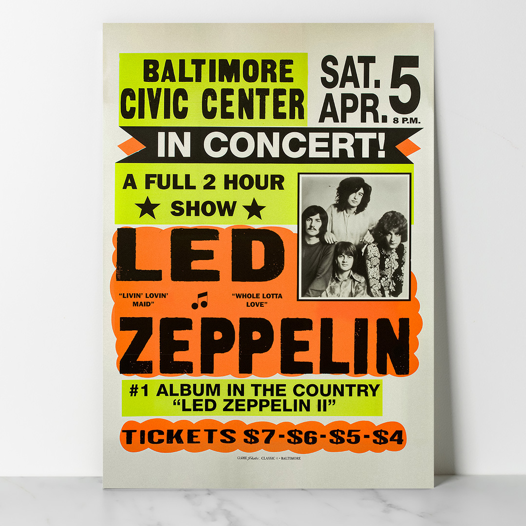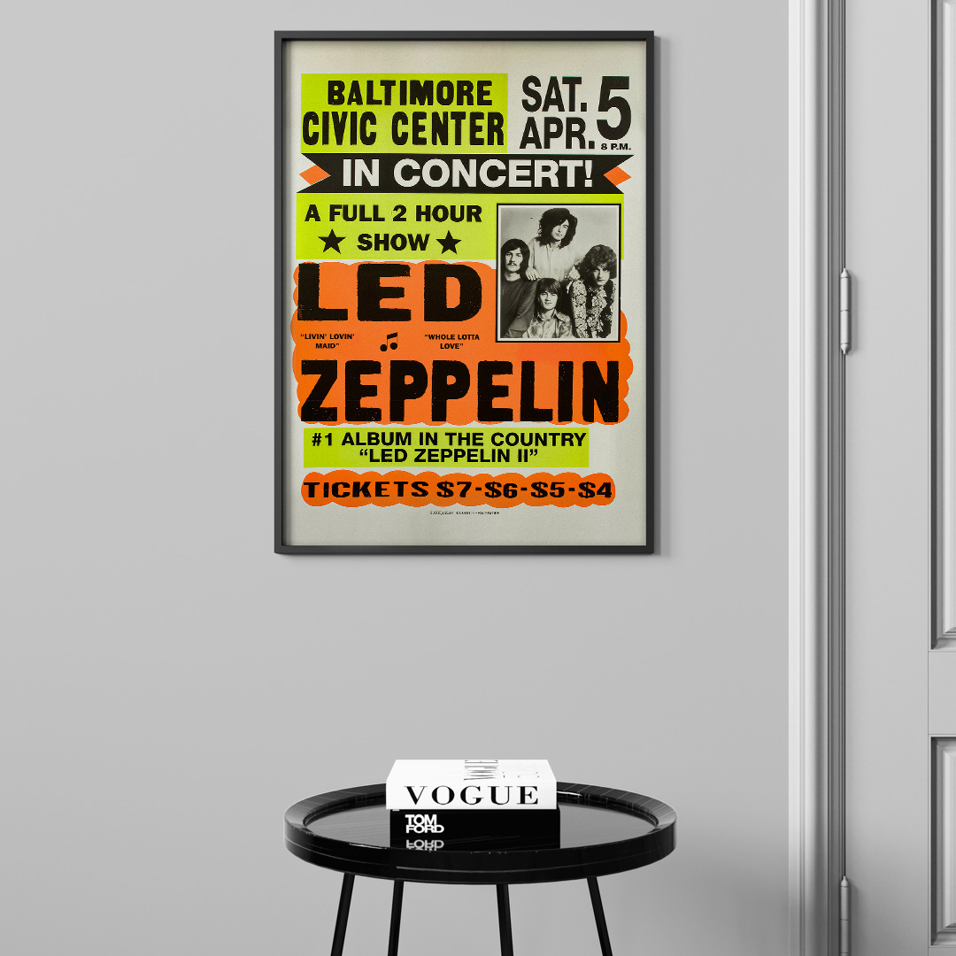 Affiche vintage du concert de Led Zeppelin au Baltimore Civic Center, le 5 avril 1970. Une pièce iconique célébrant l’ère du rock pur, idéale pour les fans du groupe et les amateurs de design rétro.
