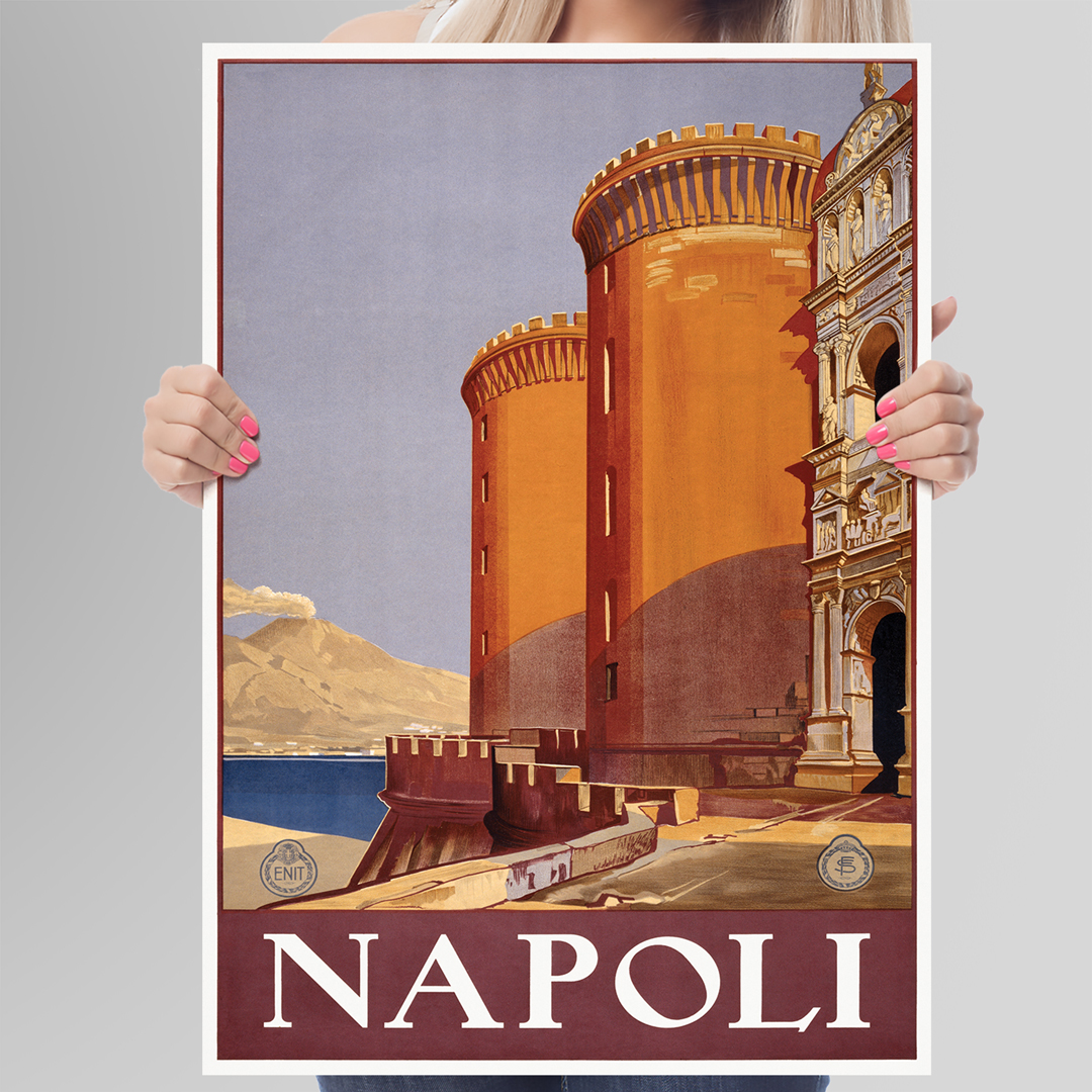 Créée en 1920, cette œuvre s’inscrit dans l’âge d’or des affiches publicitaires de voyage. À cette époque, l’art graphique servait de véritable outil de séduction touristique. L’artiste parvient ici à mêler précision architecturale et charme pittoresque, offrant une vision idéale de Naples.
