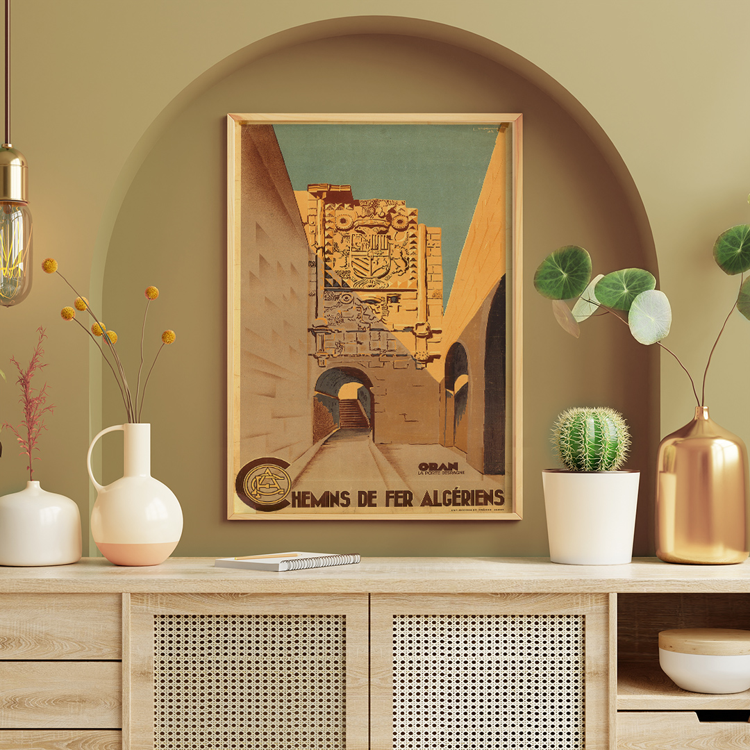 Imprimée par les ateliers Baconnier Frères, cette lithographie incarne le savoir-faire artistique du début du XXᵉ siècle. L’affiche vintage Algérie Oran s’intègre parfaitement dans une décoration murale rétro ou coloniale, apportant une note historique et élégante à tout intérieur. Elle symbolise à la fois le patrimoine algérien et la fascination du voyage en train, chère à l’imaginaire de l’époque.