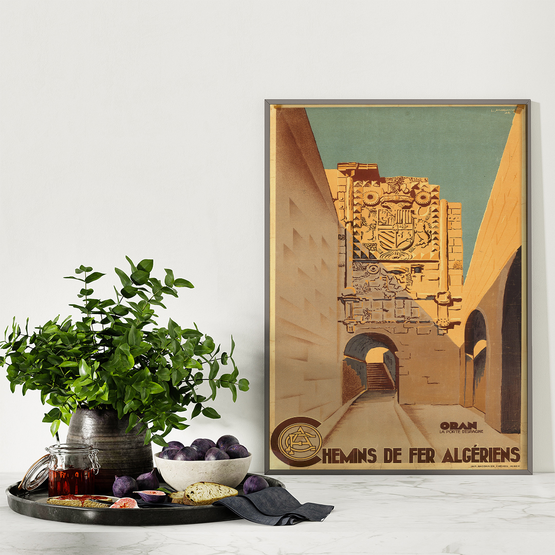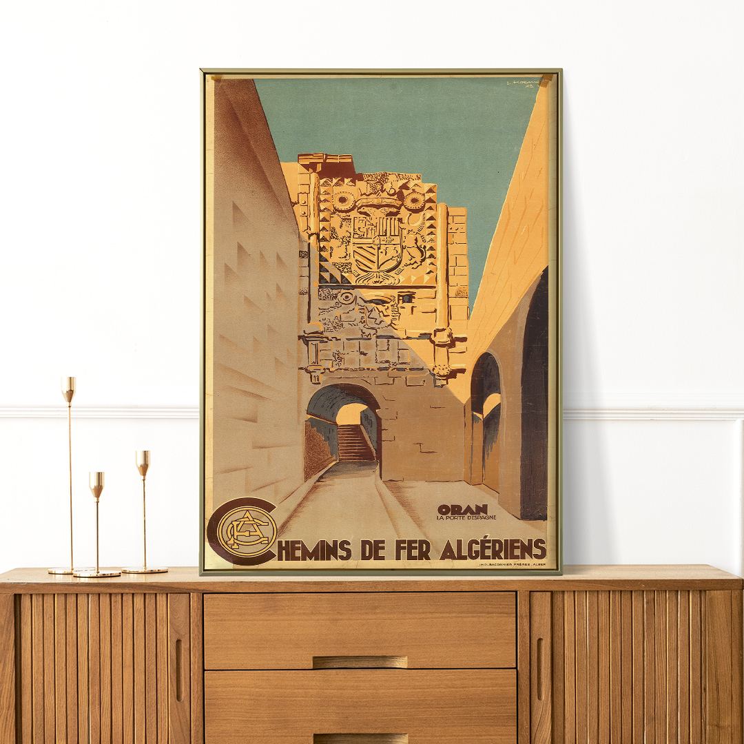Sublime affiche vintage Oran – La Porte d’Espagne (1933) signée L. Koenig pour les Chemins de Fer Algériens. Un chef-d’œuvre de la lithographie coloniale, parfait pour une décoration murale rétro ou art déco, célébrant le charme d’Oran et l’esprit du voyage.
