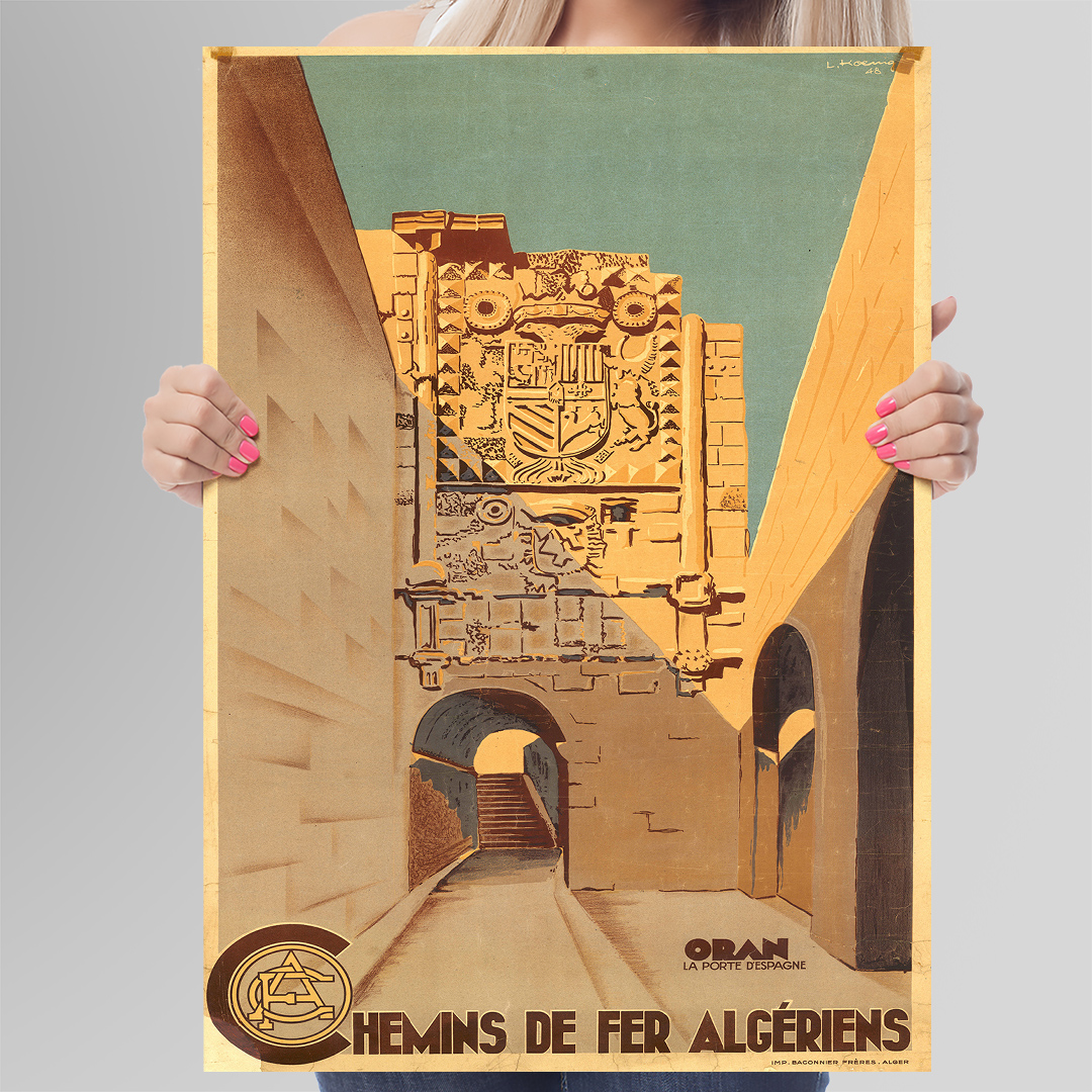 L’affiche vintage Algérie Oran – La Porte d’Espagne est une œuvre emblématique du tourisme des années 1930. Réalisée par L. Koenig pour les Chemins de Fer Algériens, elle met en valeur Oran, surnommée « la Porte d’Espagne », à travers un graphisme lumineux et harmonieux. Dès le premier regard, cette affiche transporte le spectateur dans une atmosphère de découverte et d’évasion.