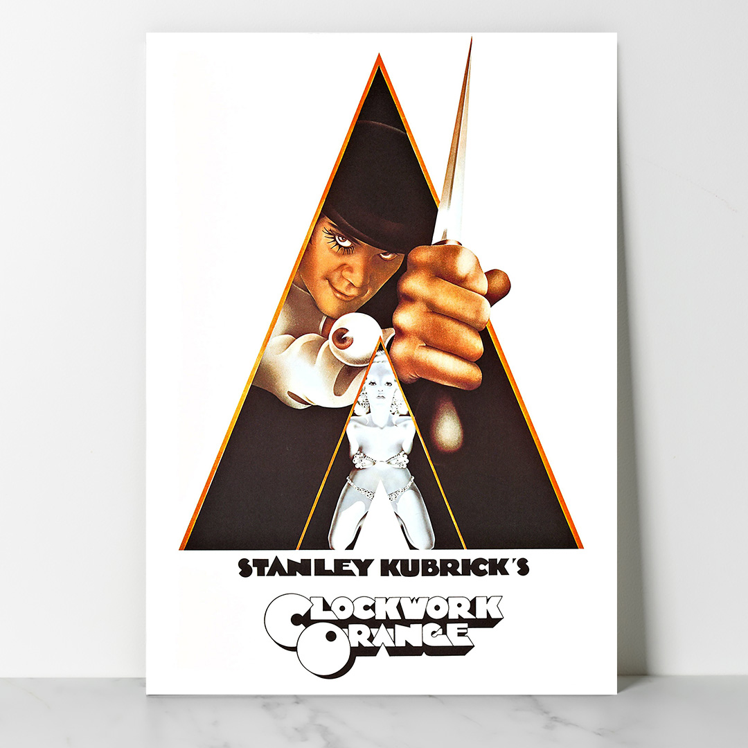Ce poster iconique, au fond blanc épuré, présente Alex DeLarge, le célèbre protagoniste au regard inquiétant, surgissant d’un triangle noir tranchant.