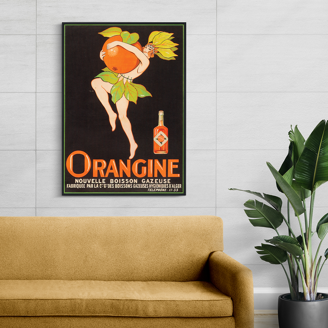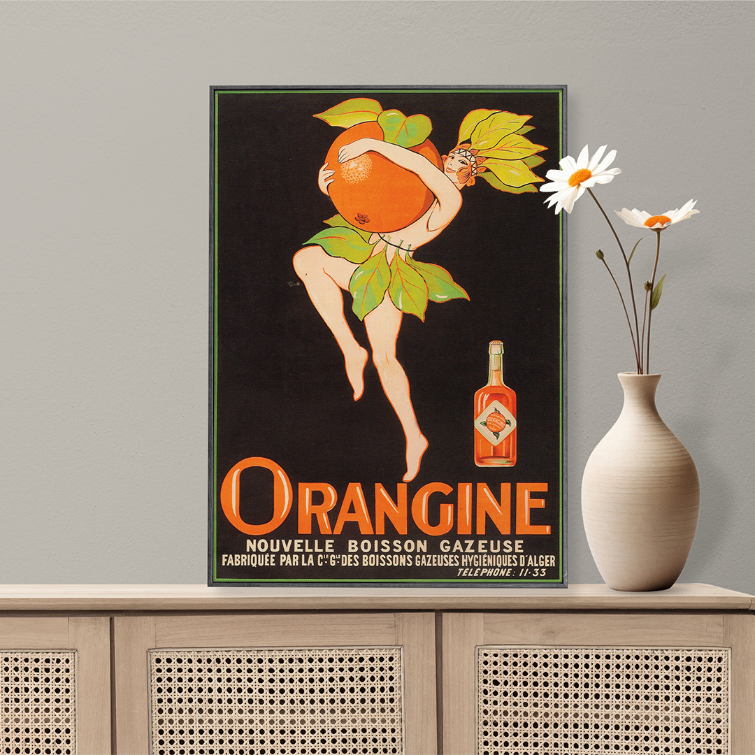 Affiche publicitaire vintage « Orangine » : une femme vêtue de feuilles d’oranger porte une orange monumentale sur fond noir. Avec la mention « nouvelle boisson gazeuse », elle illustre l’essor des sodas en Algérie et incarne l’élégance Art déco. Une pièce incontournable pour collectionneurs.