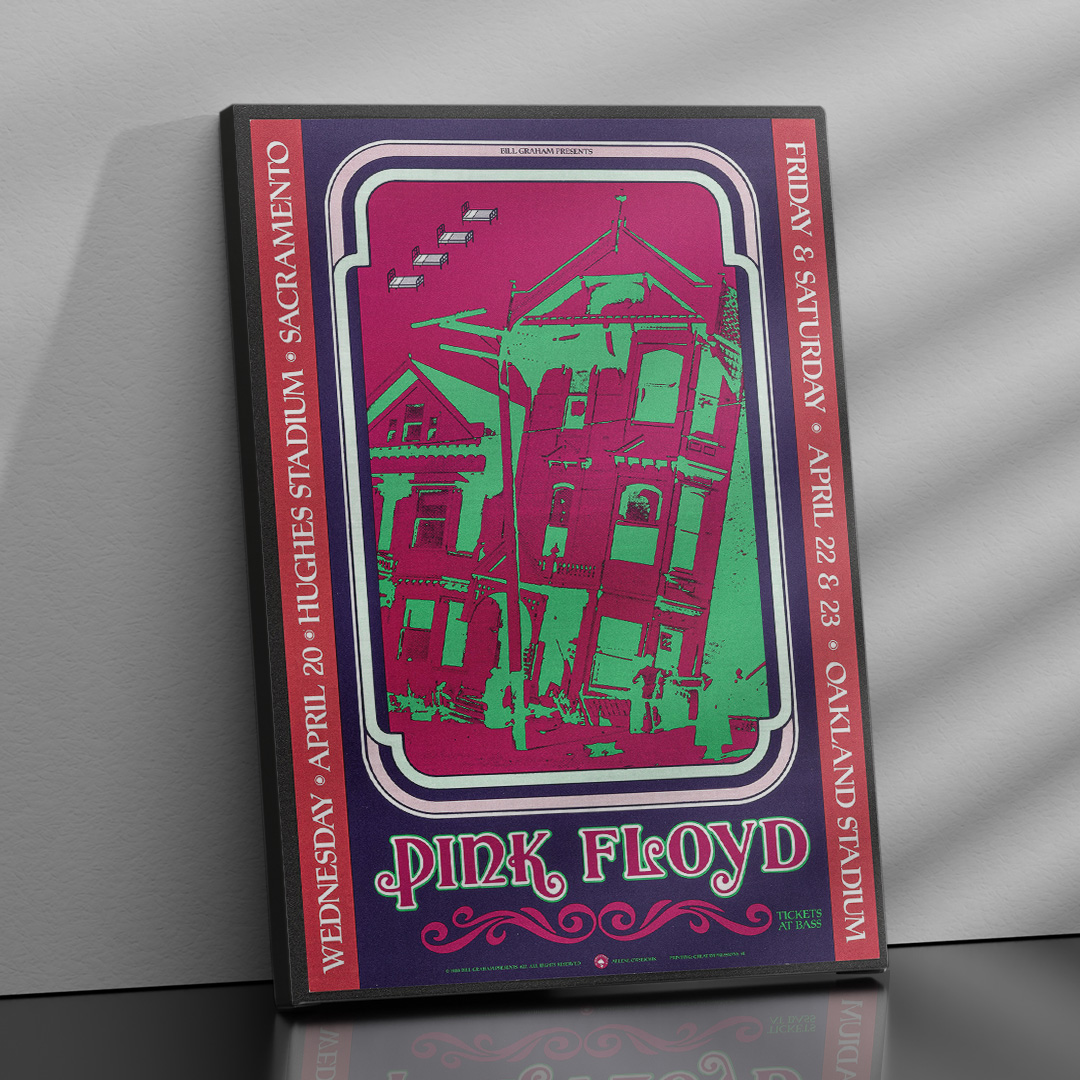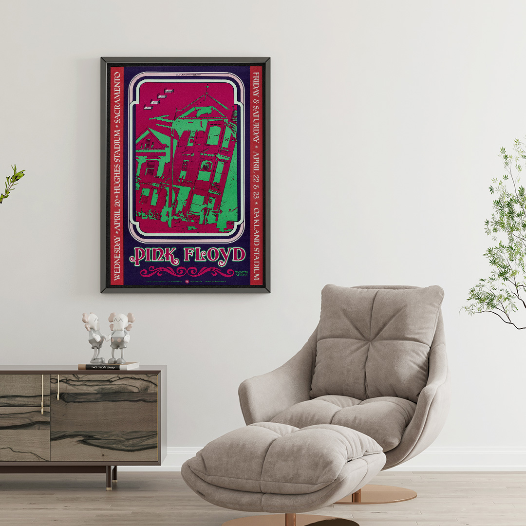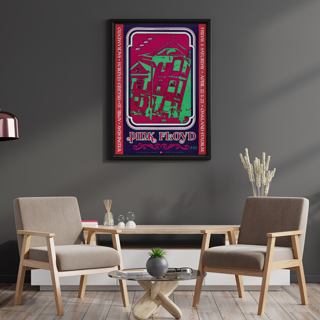 Ce concert, donné à Sacramento le 20 avril 1988, faisait partie de la tournée mondiale A Momentary Lapse of Reason Tour. C’était une période charnière pour Pink Floyd, marquée par le retour sur scène de David Gilmour, Nick Mason et Richard Wright. À travers cette affiche, on retrouve toute la puissance visuelle et sonore du groupe, entre effets de lumière, symboles oniriques et énergie planante.