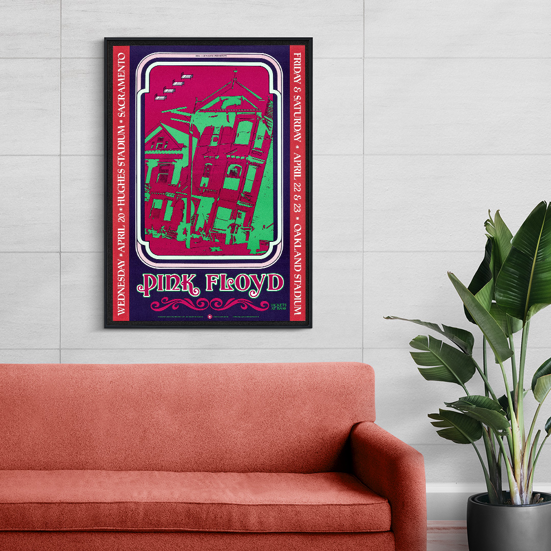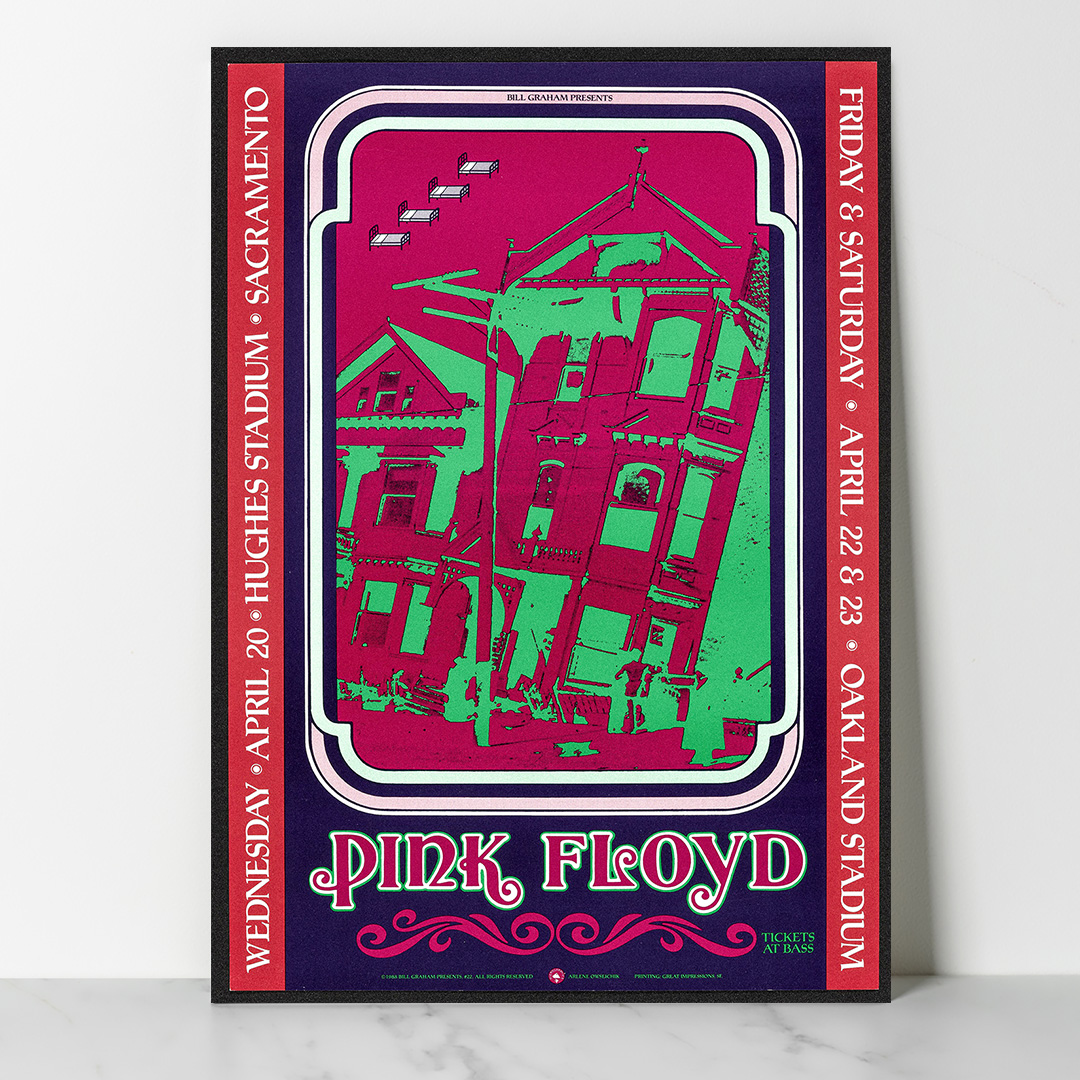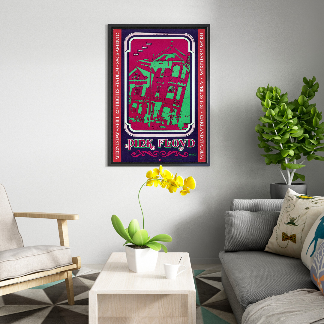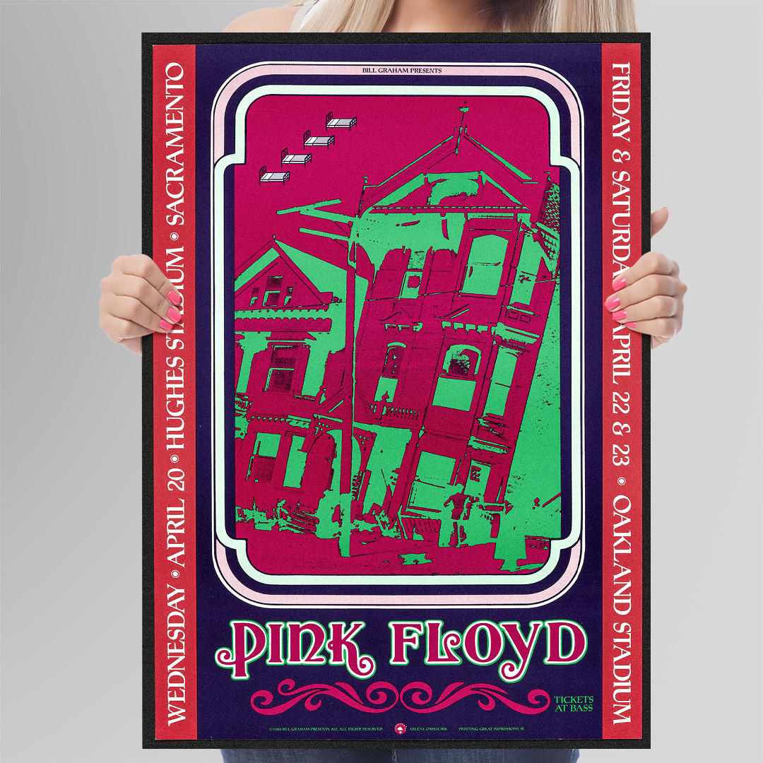 Ce concert, donné à Sacramento le 20 avril 1988, faisait partie de la tournée mondiale A Momentary Lapse of Reason Tour. C’était une période charnière pour Pink Floyd, marquée par le retour sur scène de David Gilmour, Nick Mason et Richard Wright. À travers cette affiche, on retrouve toute la puissance visuelle et sonore du groupe, entre effets de lumière, symboles oniriques et énergie planante.