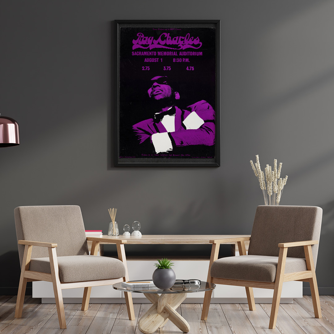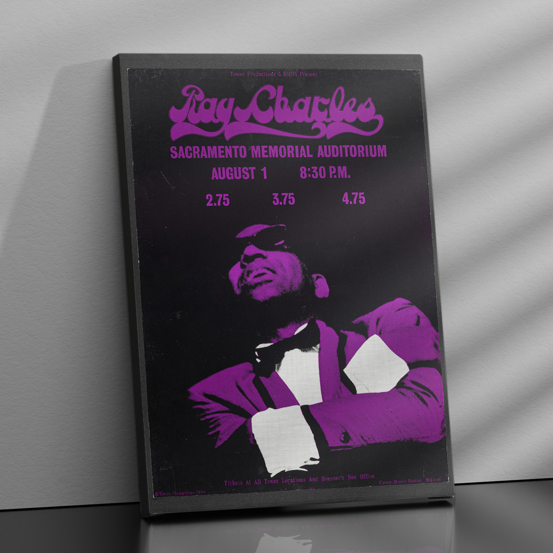 Superbe affiche vintage du concert de Ray Charles – Sacramento Memorial Auditorium 1968. Fond noir et typographie violette pour une ambiance soul et rétro. Un incontournable pour les amateurs de musique et de design.