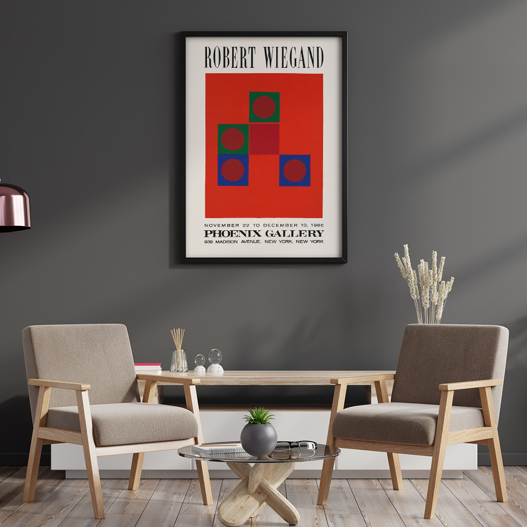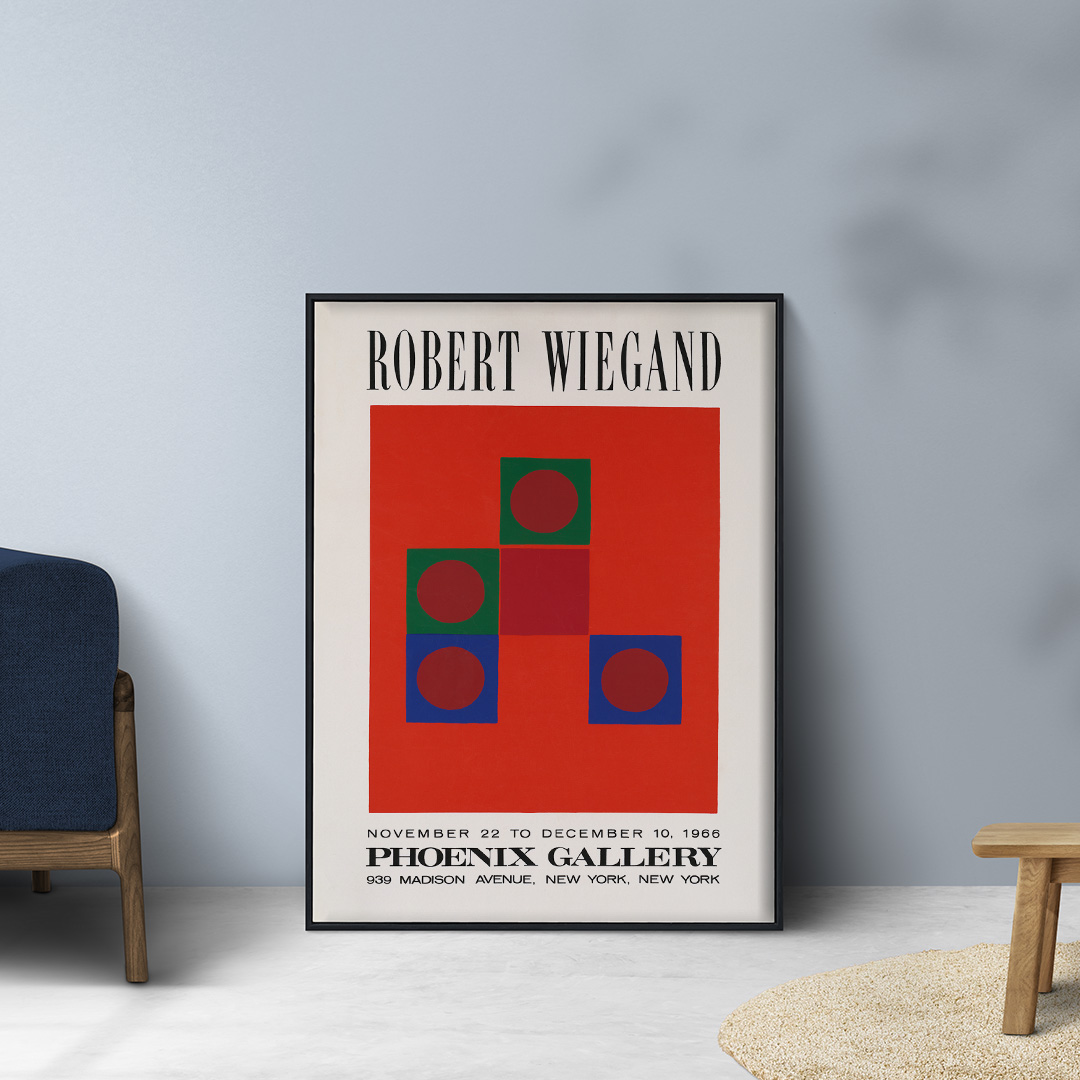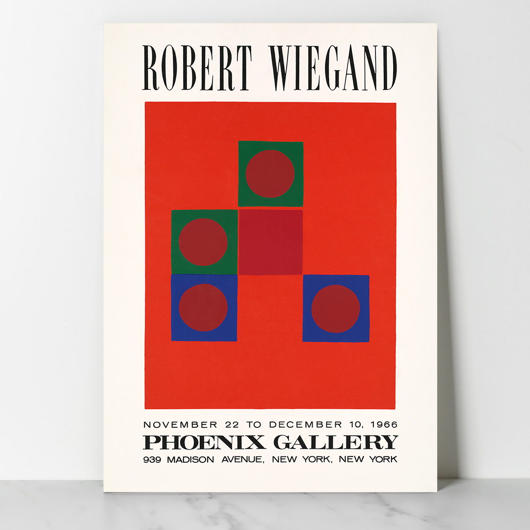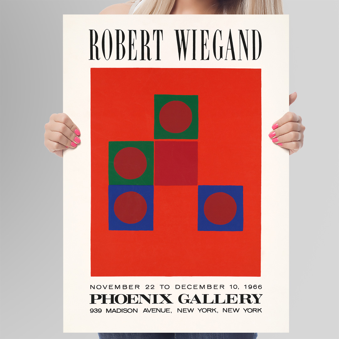 Affiche vintage Robert Wiegand – Phoenix Gallery 1966, œuvre abstraite audacieuse aux couleurs vives. Un classique du modernisme américain signé Robert Wiegand.