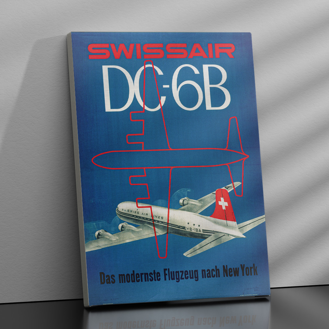 Affiche vintage Swissair DC-6B 1952 – New York, mettant en avant l’un des avions les plus modernes de son époque. Une œuvre élégante qui évoque le prestige, le voyage et l’âge d’or de l’aviation civile.