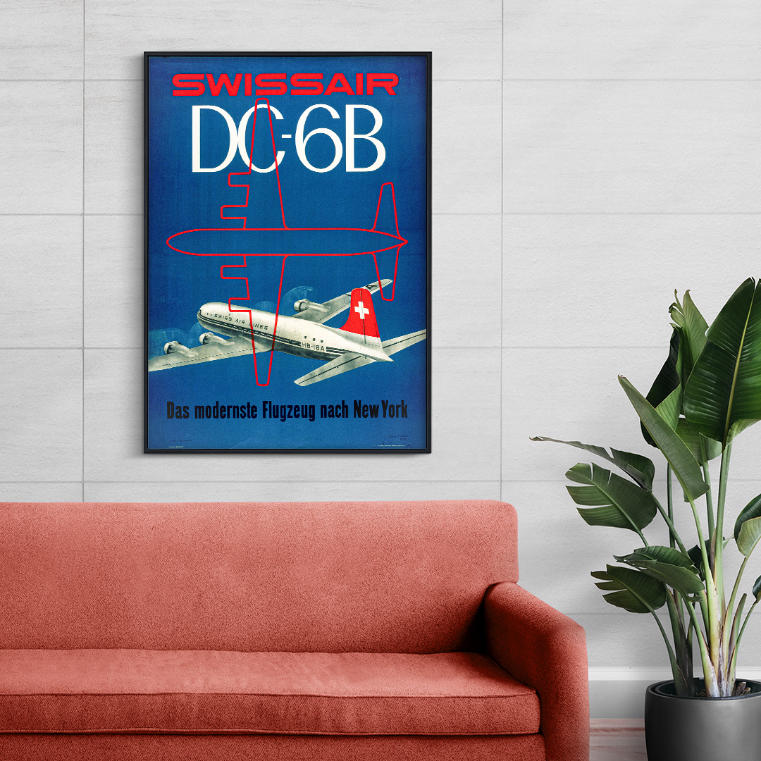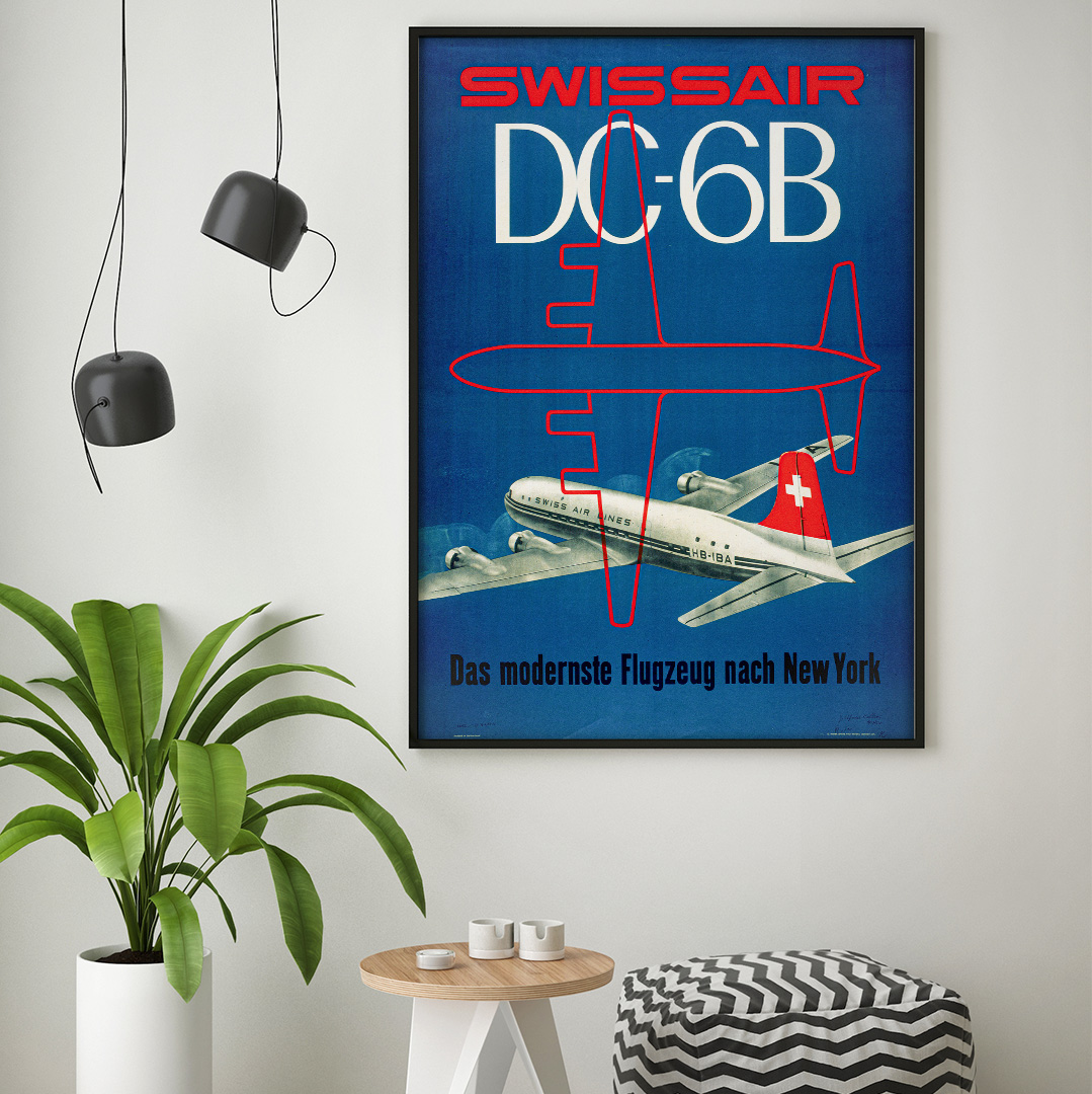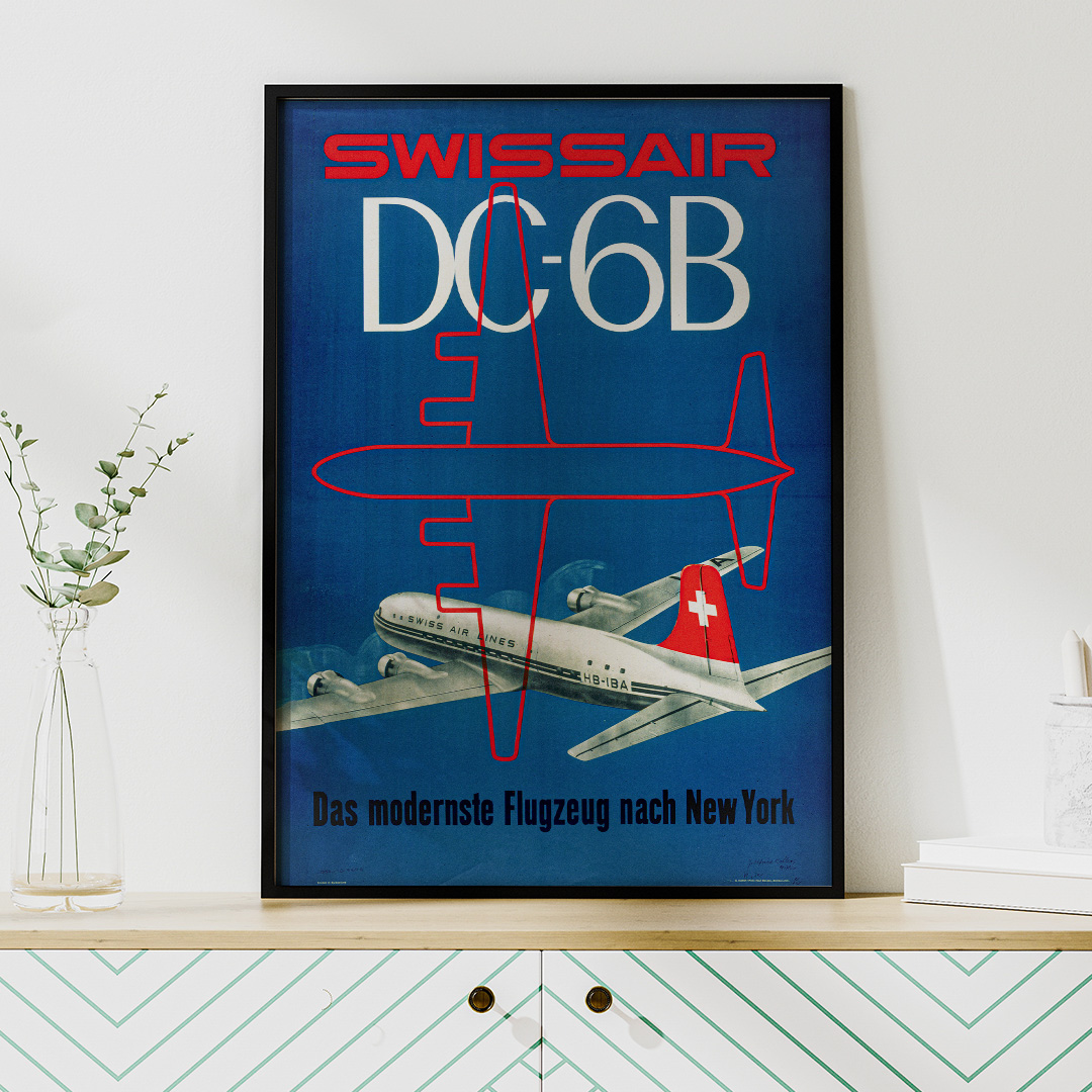 Par ailleurs, cette affiche Swissair DC-6B 1952 évoque une période charnière, où l’aviation reliait l’Europe et l’Amérique avec une élégance nouvelle. Elle trouve naturellement sa place dans un intérieur contemporain, un bureau professionnel ou un espace dédié au voyage et au design vintage. De plus, elle séduit les amateurs d’aviation, de graphisme et d’histoire du transport aérien.