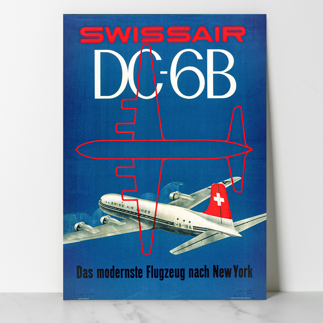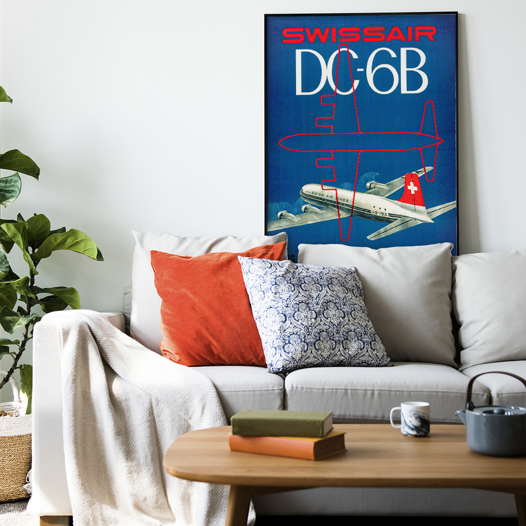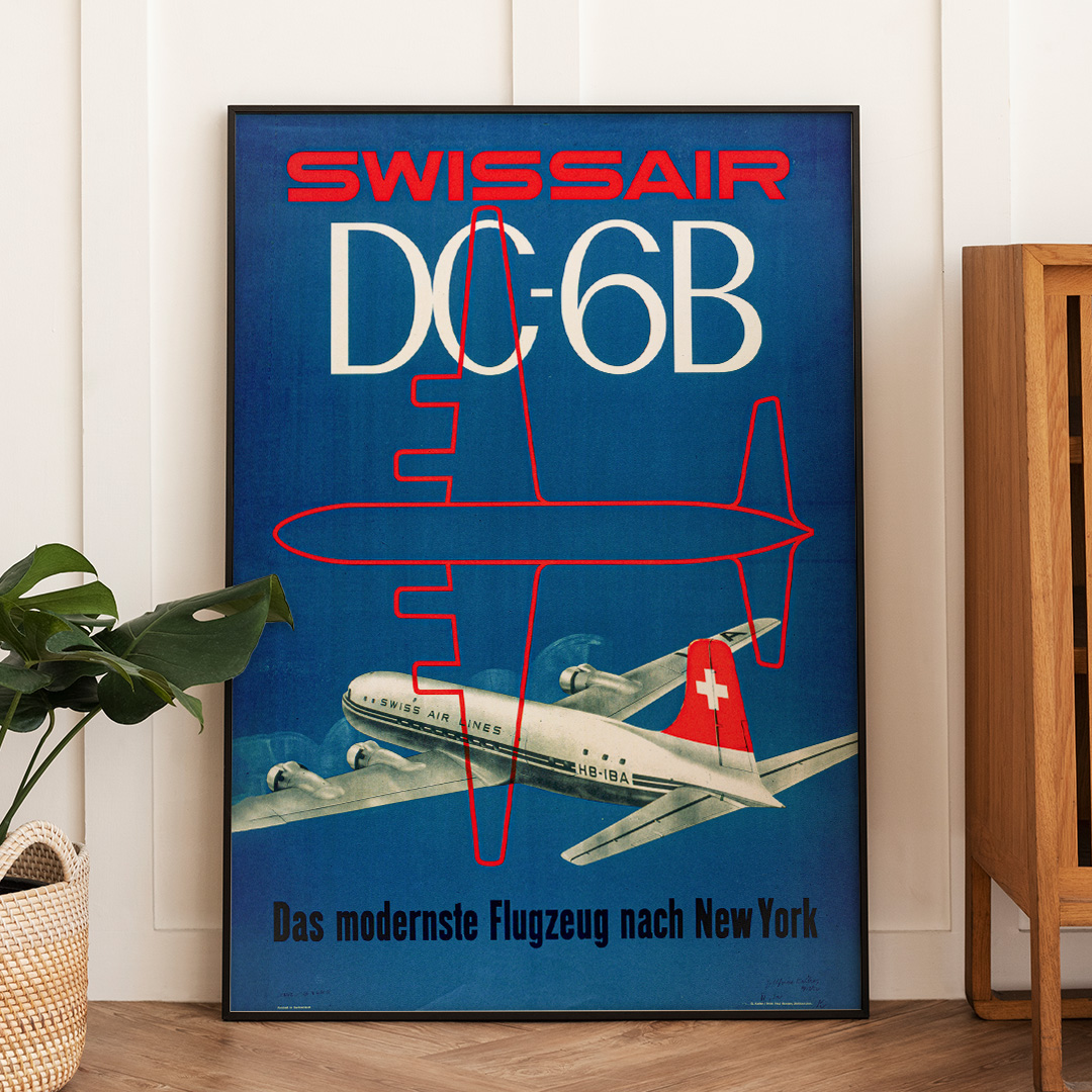 Par ailleurs, cette affiche Swissair DC-6B 1952 évoque une période charnière, où l’aviation reliait l’Europe et l’Amérique avec une élégance nouvelle. Elle trouve naturellement sa place dans un intérieur contemporain, un bureau professionnel ou un espace dédié au voyage et au design vintage. De plus, elle séduit les amateurs d’aviation, de graphisme et d’histoire du transport aérien.