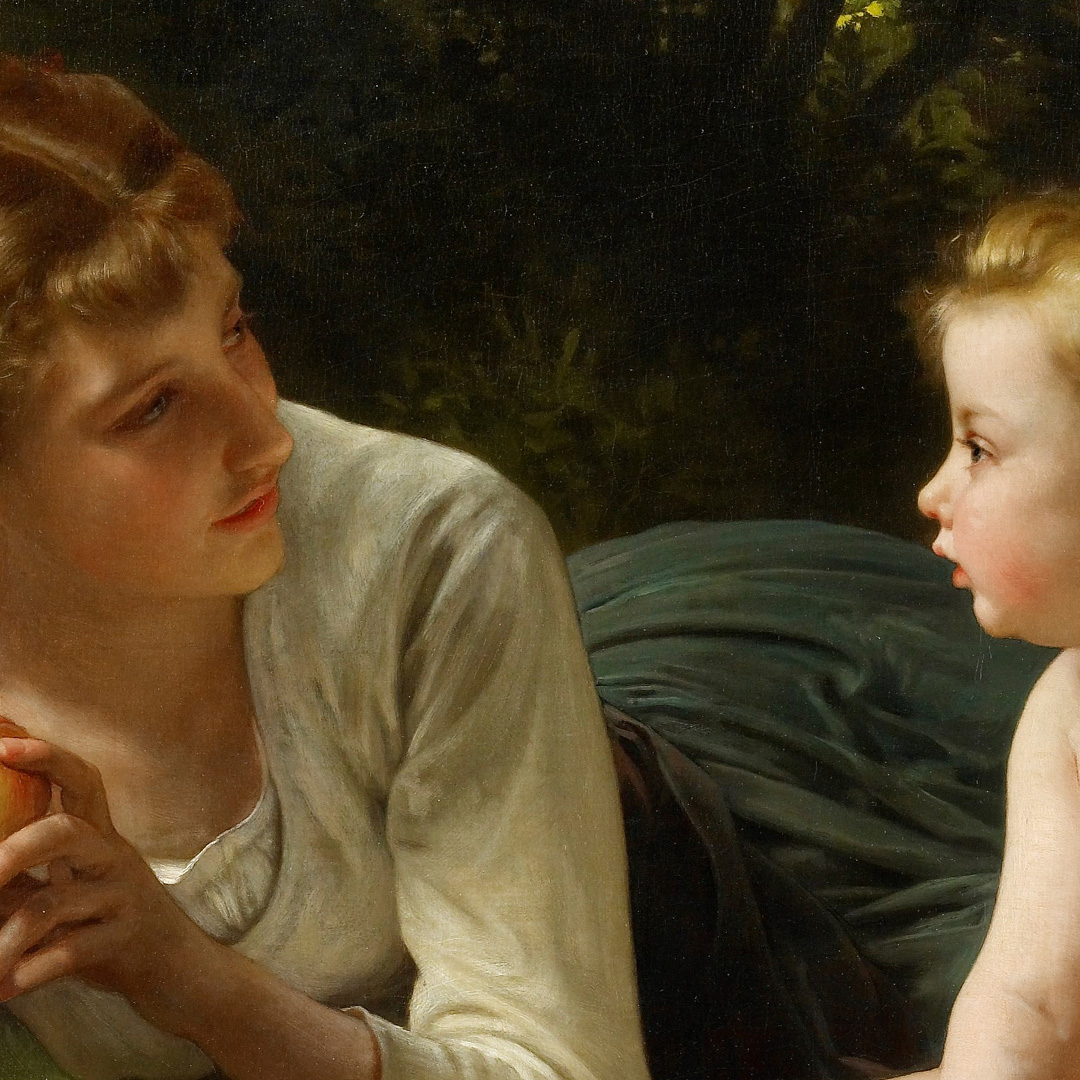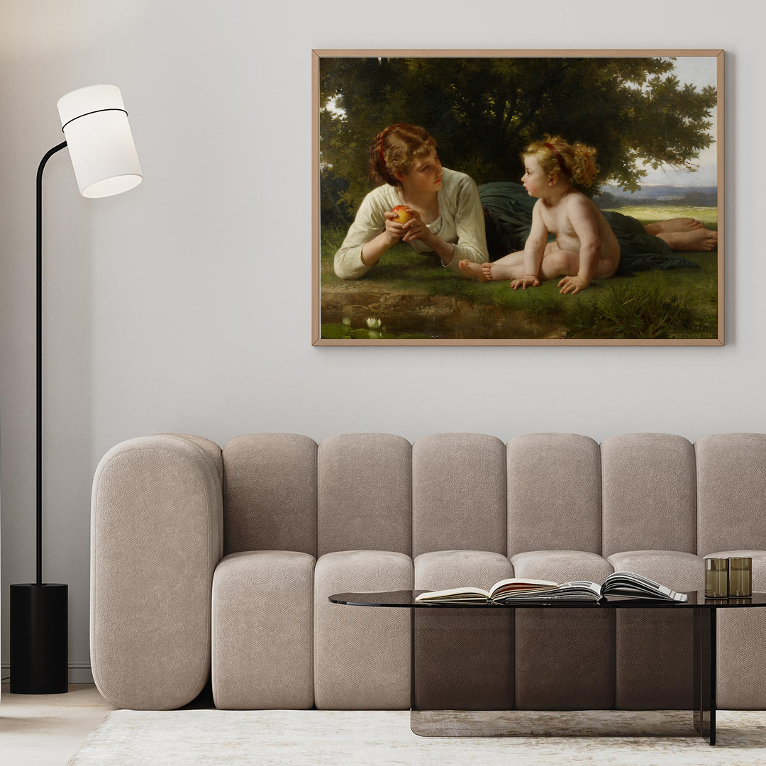 Le tableau original montre une femme tenant un fruit, symbole de tentation, et un enfant à ses côtés, dans un décor naturel et apaisant. Les couleurs subtiles, la lumière délicate et les détails minutieux créent une ambiance à la fois intime et poétique. Cette affiche permet de décorer votre salon, bureau ou chambre tout en invitant à la contemplation.