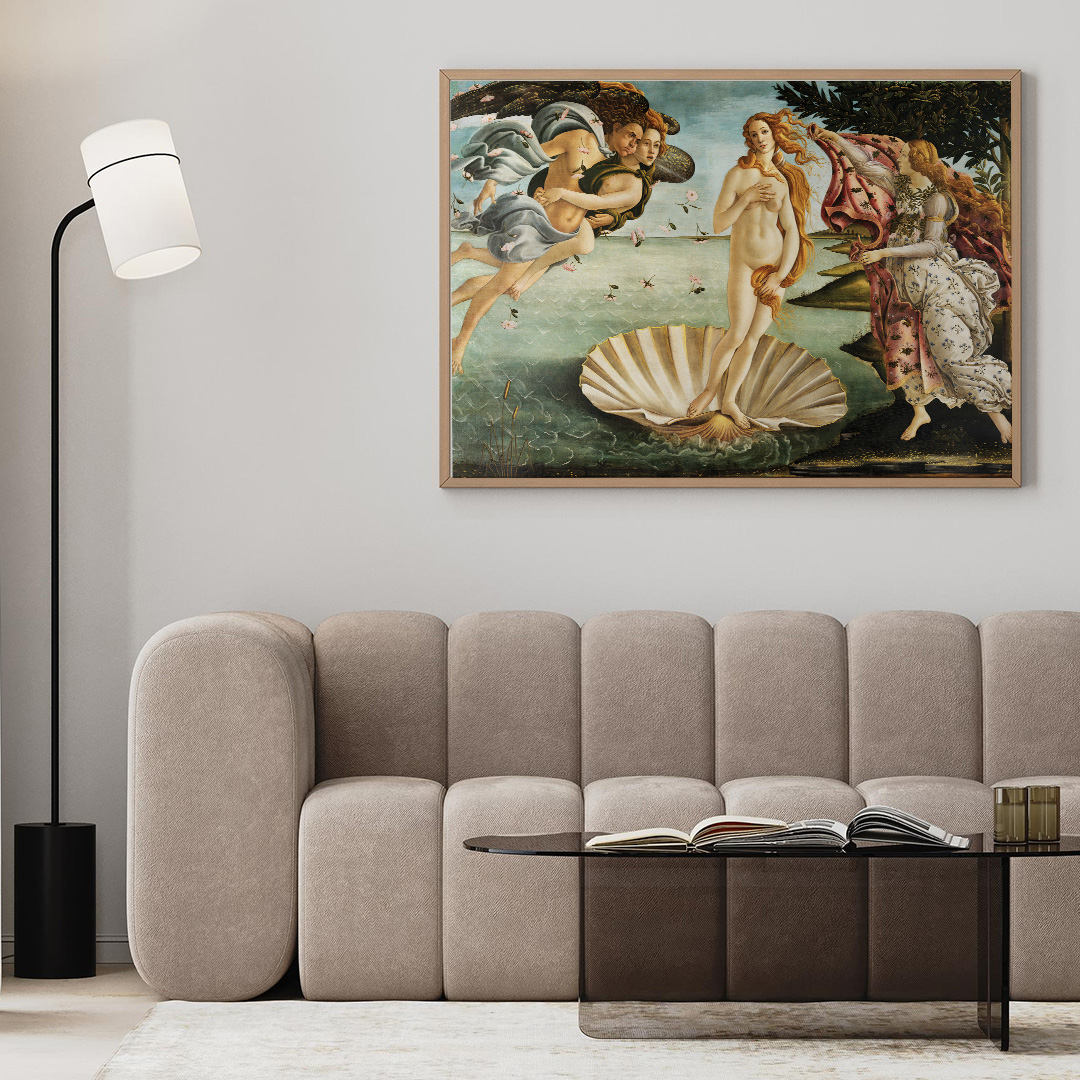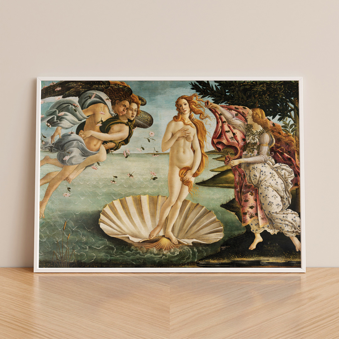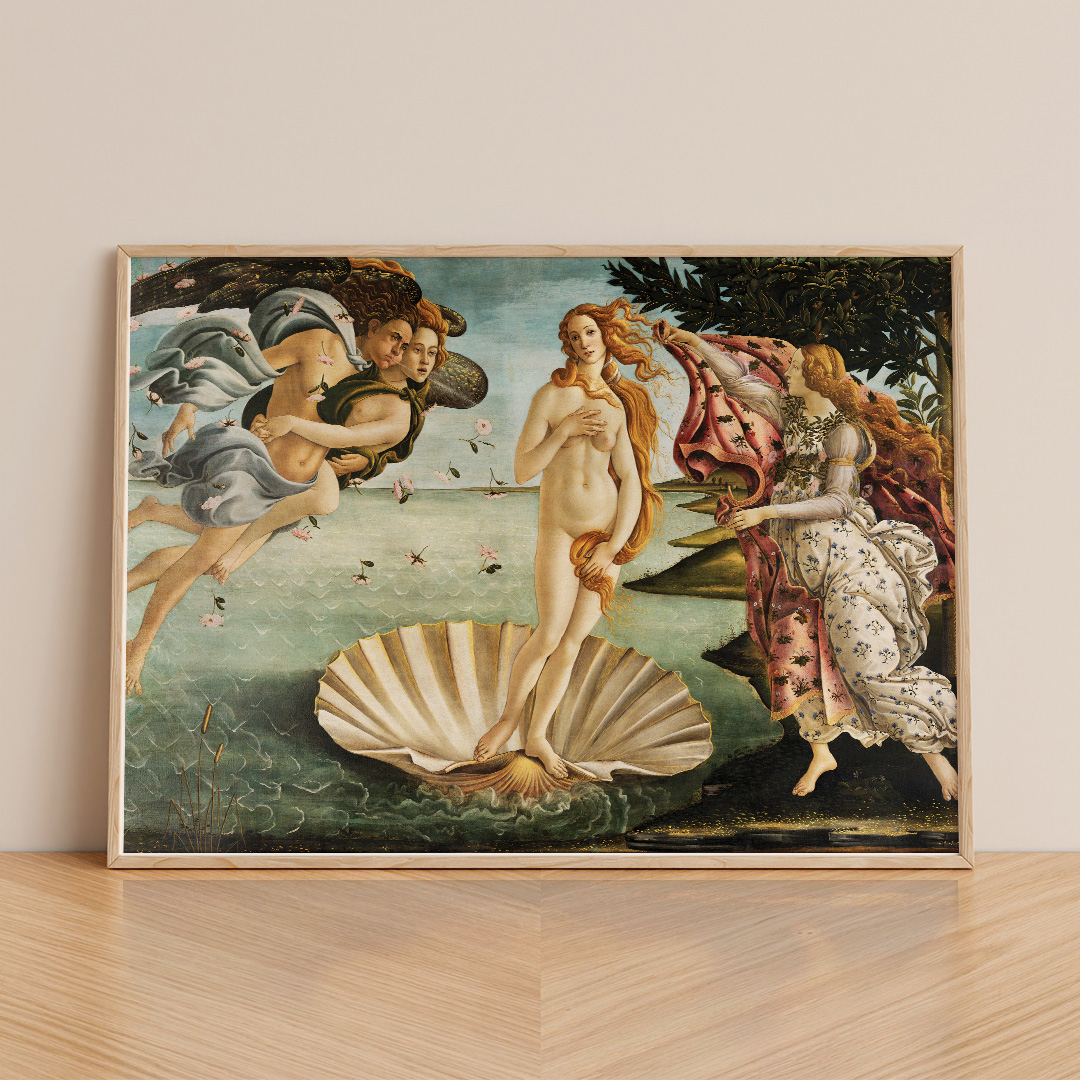 Affiche décorative The Birth of Venus de Botticelli, reproduction haute qualité d’une œuvre emblématique de la Renaissance. Disponible en formats A4 à A1, en cadre ou toile montée.