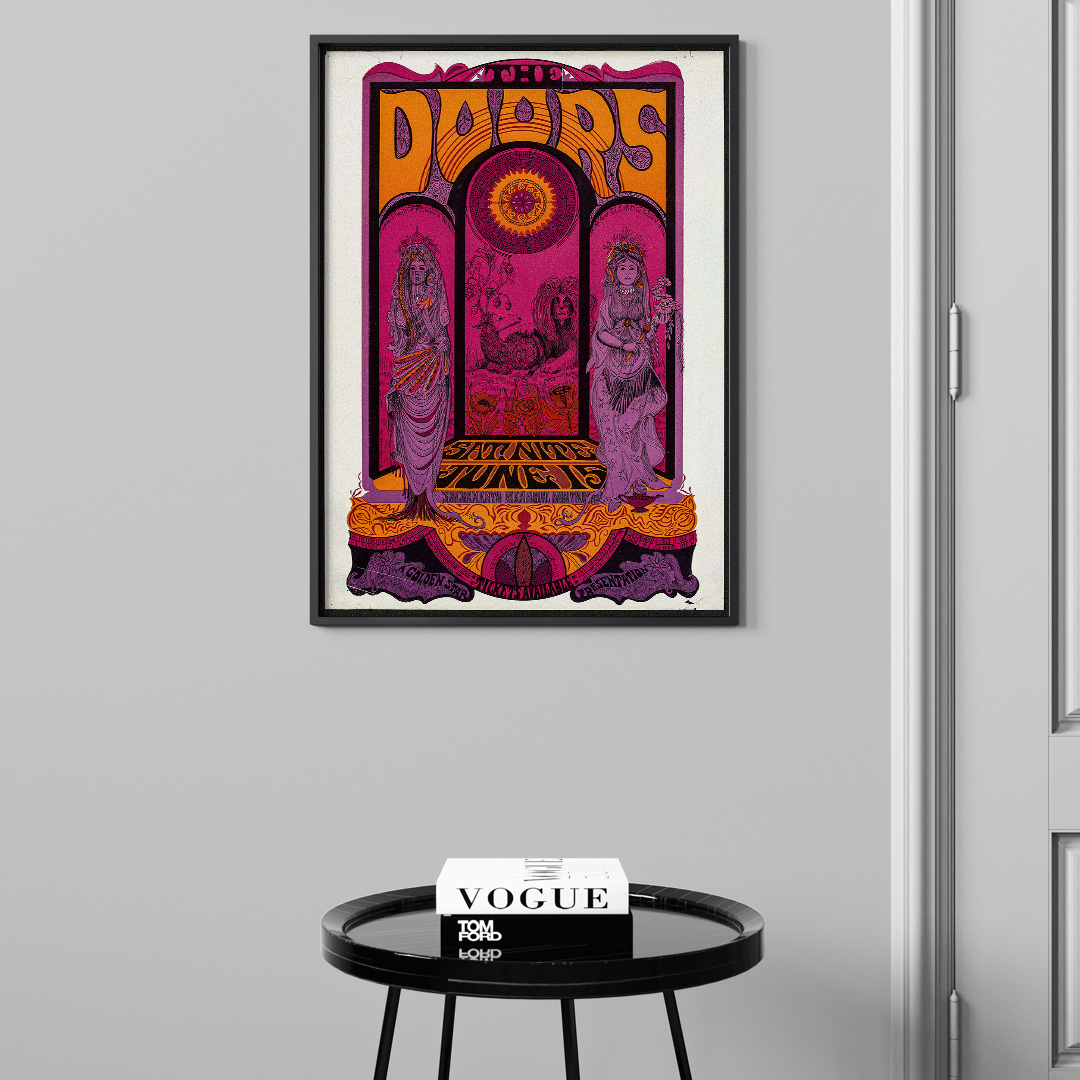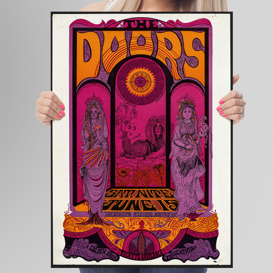 Affiche The Doors – Sacramento Memorial Auditorium 1968. Poster psychédélique légendaire, disponible en A4, A3, A2 et A1, avec cadre ou toile sur châssis.