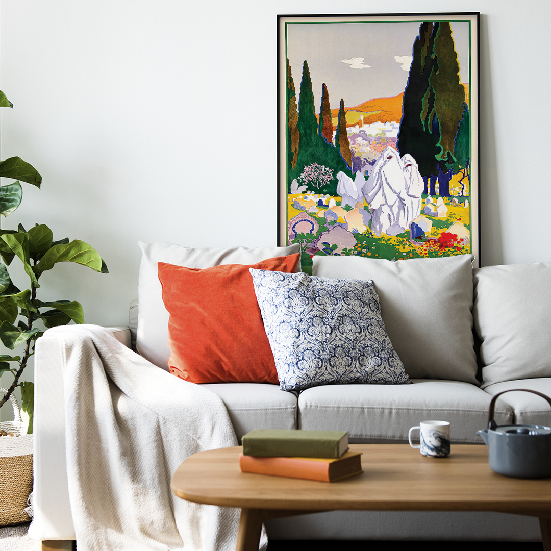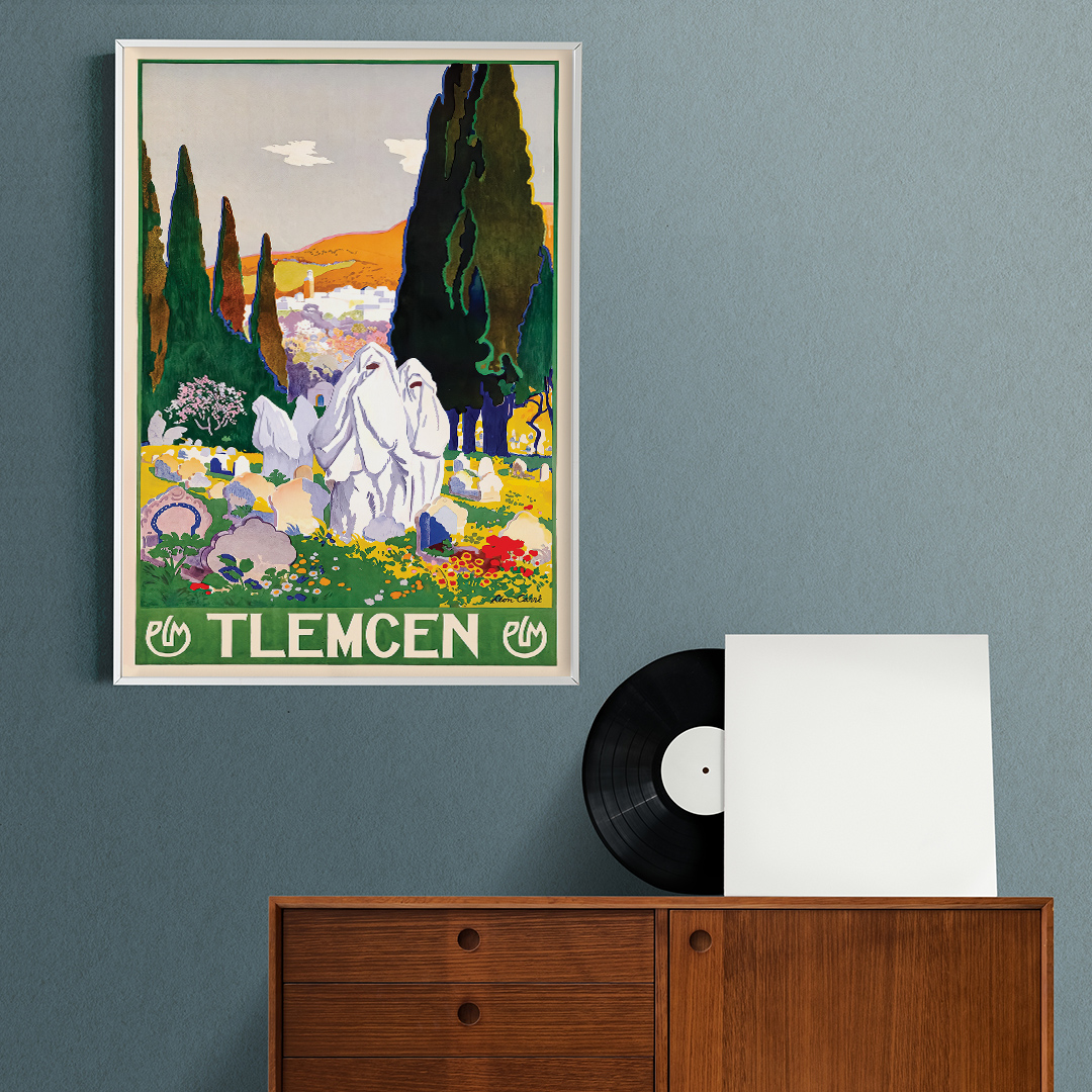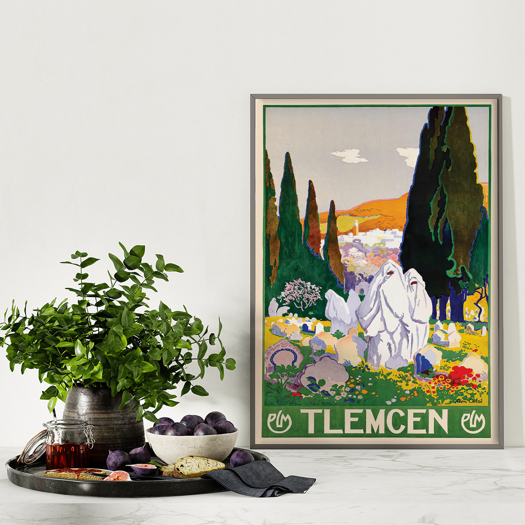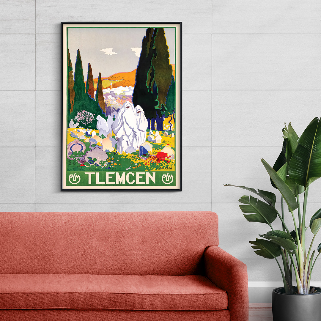 L’affiche Tlemcen PLM (1930), réalisée par Léon Carré pour les Chemins de fer Paris–Lyon–Méditerranée, illustre des femmes dans un cimetière musulman. Œuvre orientaliste raffinée, elle incarne le voyage ferroviaire colonial et demeure une pièce rare, très recherchée des amateurs d’affiches vintage PLM.
