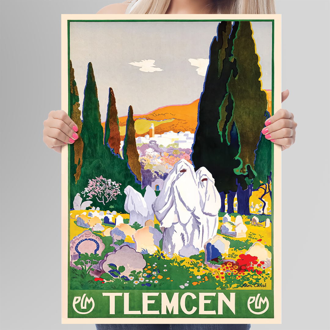 L’affiche Tlemcen PLM de 1930, réalisée par l’artiste orientaliste Léon Carré, est une œuvre phare de la publicité ferroviaire française. Conçue pour la compagnie Paris–Lyon–Méditerranée (PLM), elle met en scène des femmes voilées dans un cimetière de Tlemcen. Cette ville algérienne, spirituelle et majestueuse, attirait de nombreux voyageurs.