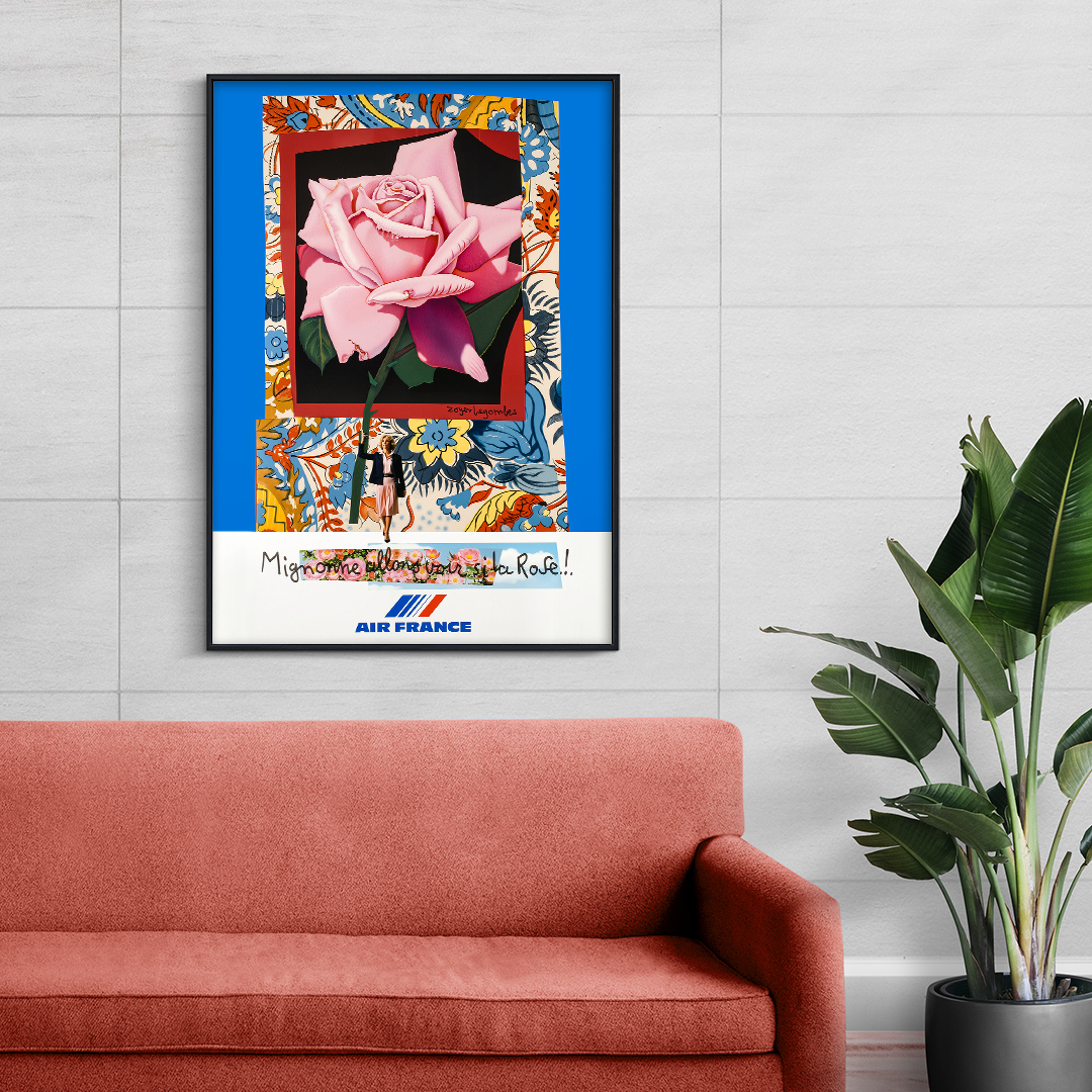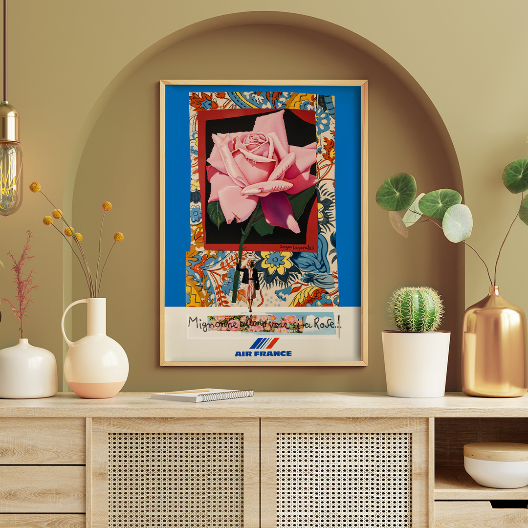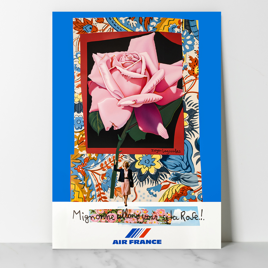 Affiche vintage Air France “Mignonne, allons voir si la rose” (1980) de Roger Bezombes. Une œuvre poétique célébrant le voyage et l’art à la française. Disponible du A4 au A1, encadrée ou sur toile, exclusivement chez Dzeco.art.