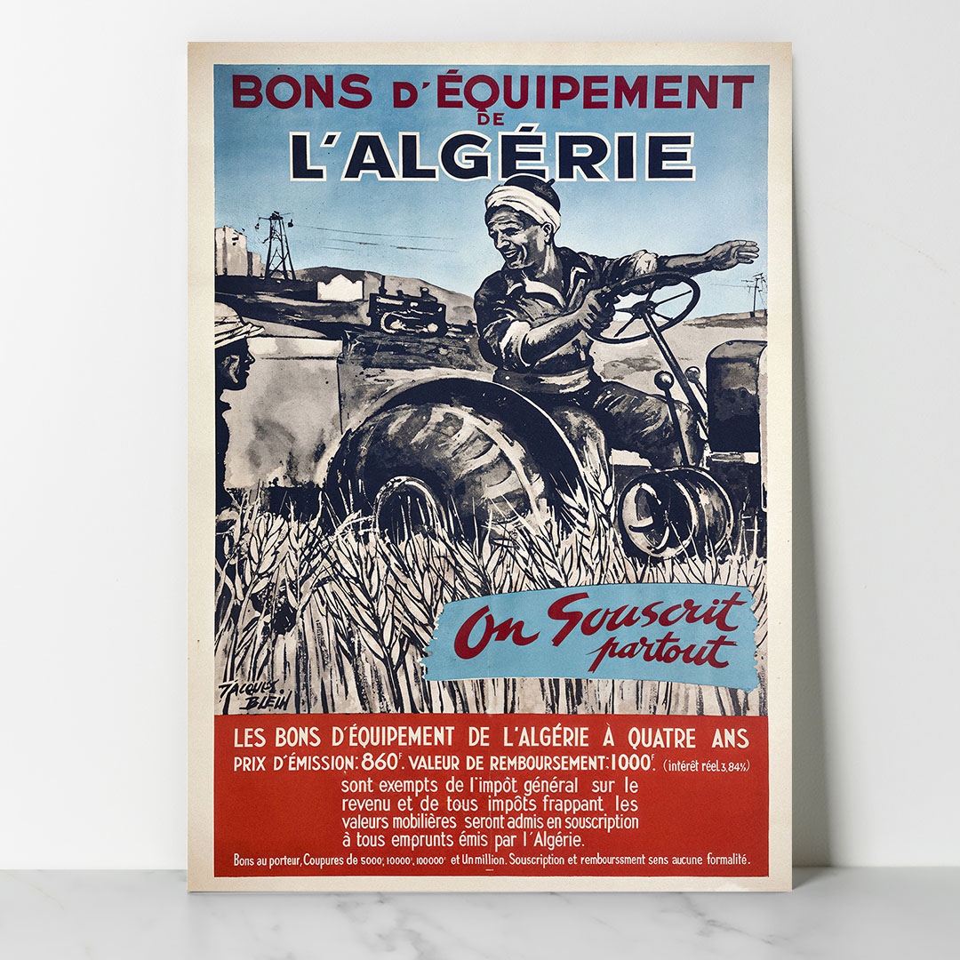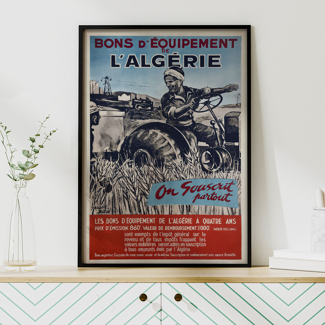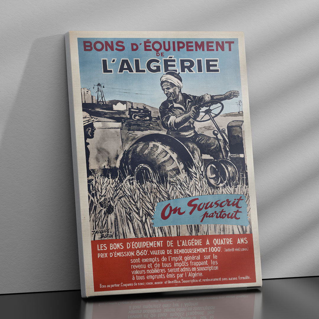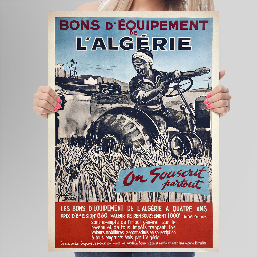 Redécouvrez l’esthétique du milieu du XXe siècle avec cette superbe réédition de l’affiche publicitaire pour les Bons d’Équipement de l’Algérie. Illustrée par l’artiste Jacques Blein, cette œuvre célèbre la modernisation agricole et l’histoire économique à travers un graphisme puissant et authentique.