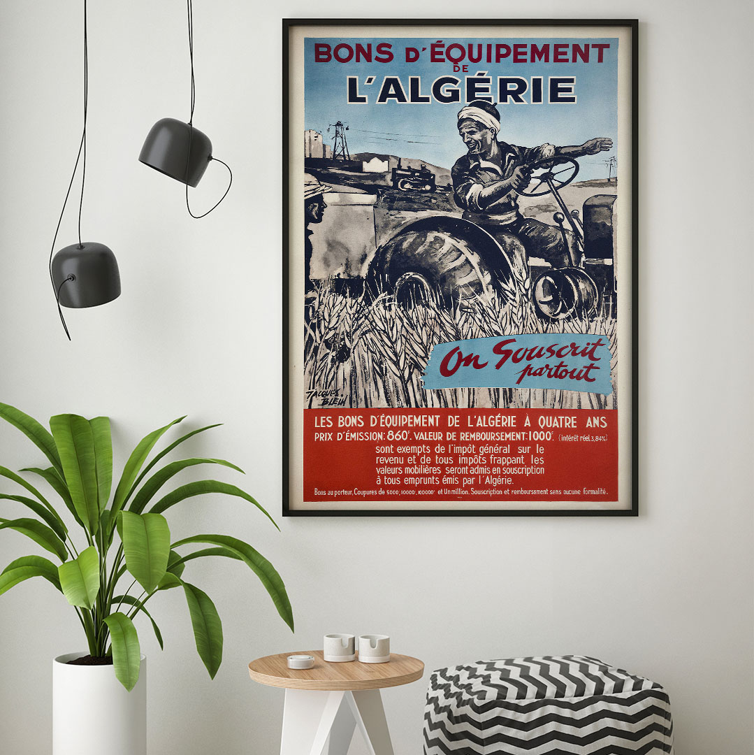 Un style graphique rétro et industriel Le choix des couleurs n’est pas anodin : le rouge vif attire l’attention sur les conditions financières de l’époque, tandis que les teintes sépia et bleutées du paysage évoquent la terre et le ciel méditerranéen. Intégrer cette affiche vintage Algérie dans votre décoration, c’est choisir un style « industriel-rétro » qui raconte une histoire. Les détails typographiques, typiques de l’époque, ajoutent un cachet indéniable que l’on ne retrouve pas dans les créations modernes.