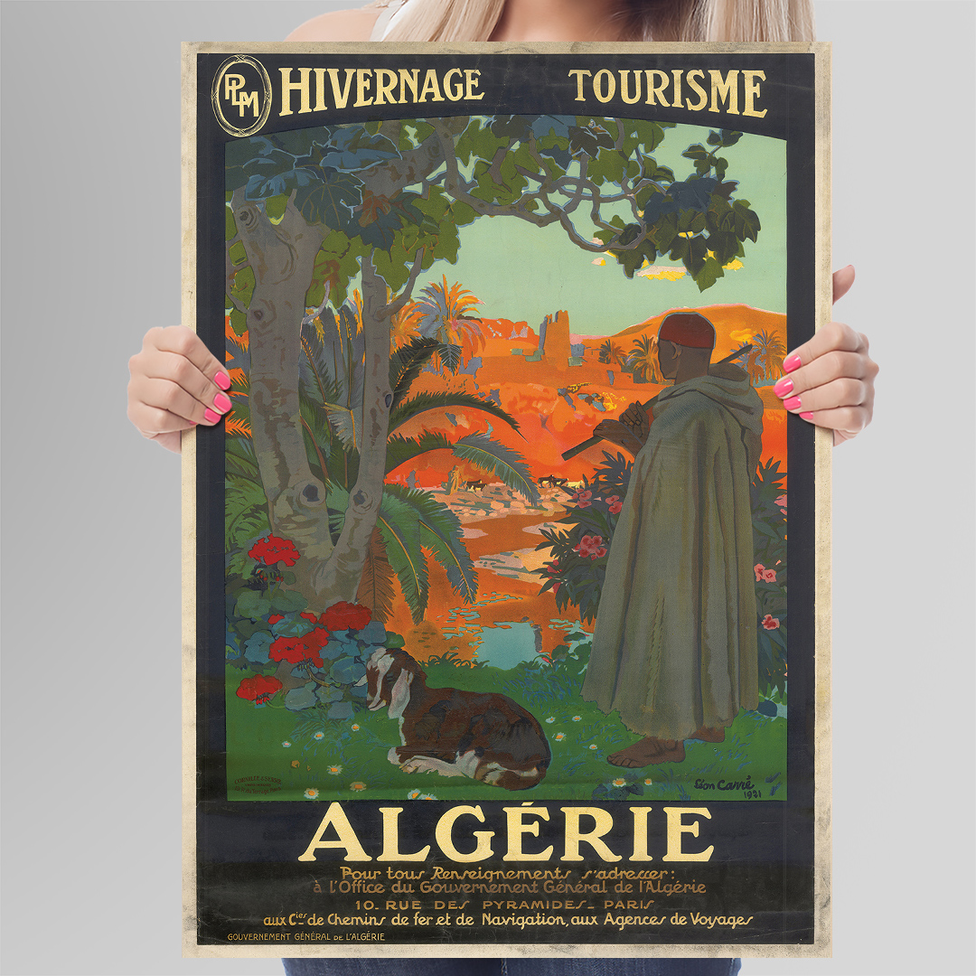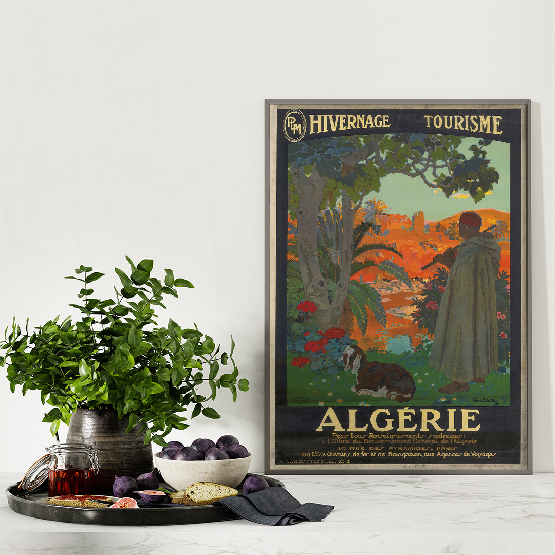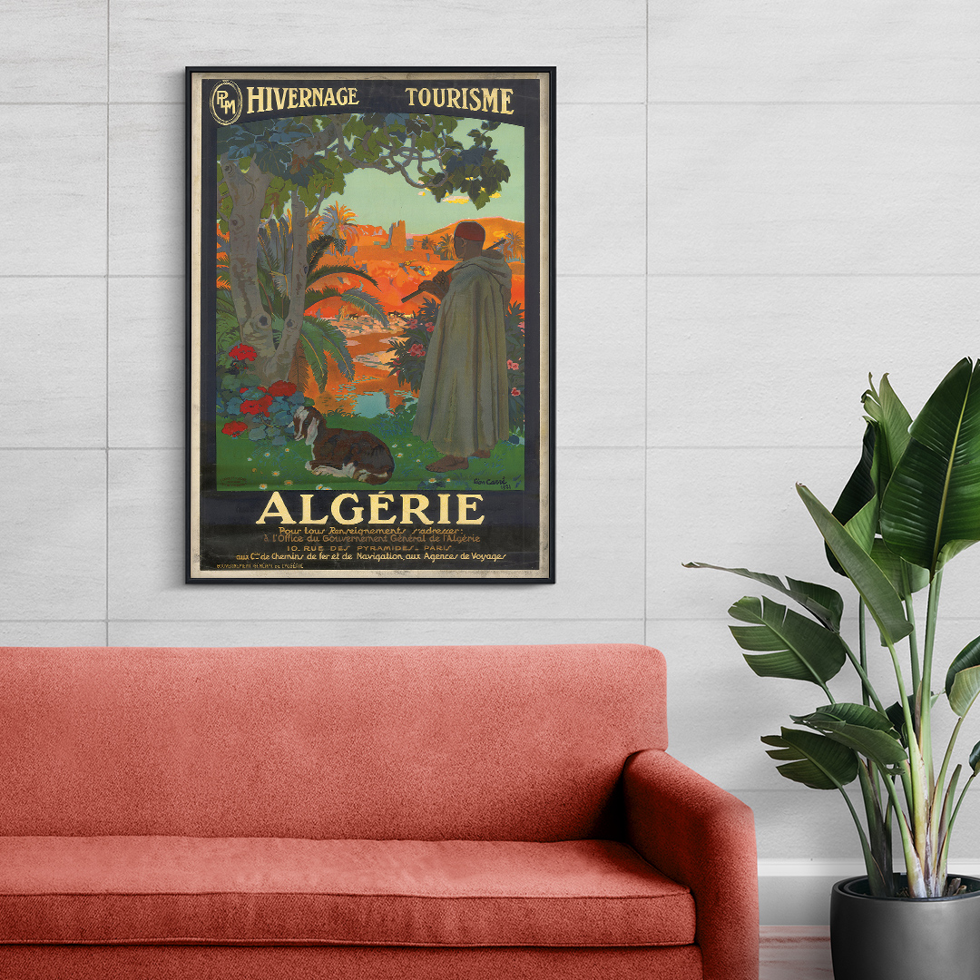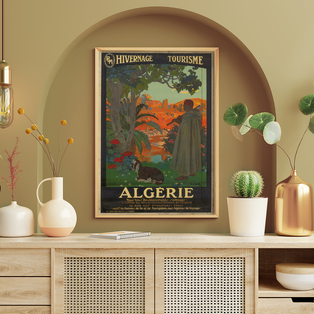Cette affiche vintage Algérie hivernage tourisme de 1921, signée Émile Séon-Carré, illustre l’exotisme et la lumière de l’Afrique du Nord. Ses couleurs vives et son style Art Déco en font une pièce décorative unique. Parfaite en affiche murale rétro, elle apporte chaleur, élégance et histoire à tout intérieur.