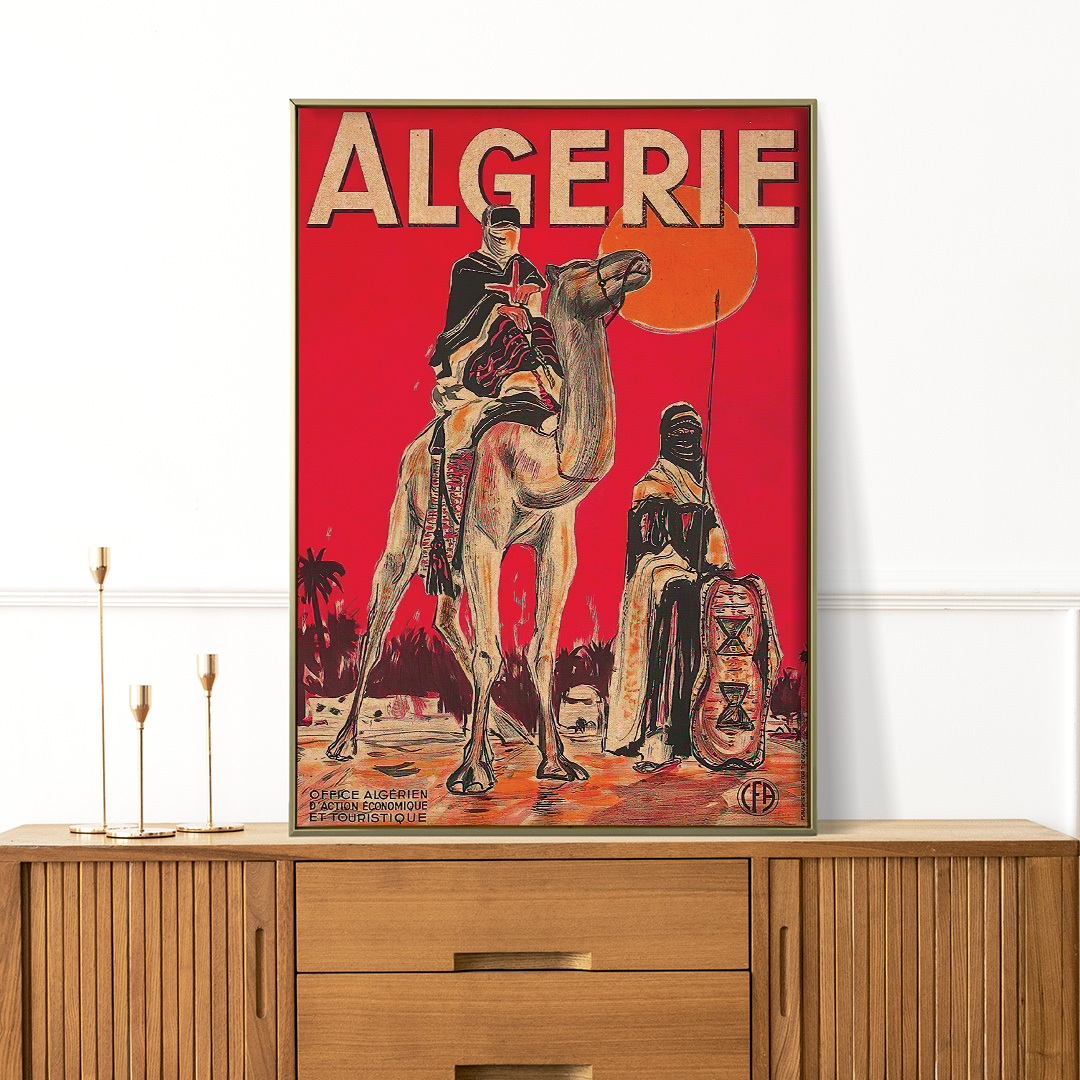 Découvrez l’affiche vintage Algérie Touareg chameau ciel rouge, une œuvre emblématique de l’Office Algérien d’Action Économique et Touristique. Créée dans les années 1960-1970, elle reflète l’esprit saharien et la richesse culturelle de l’Algérie.