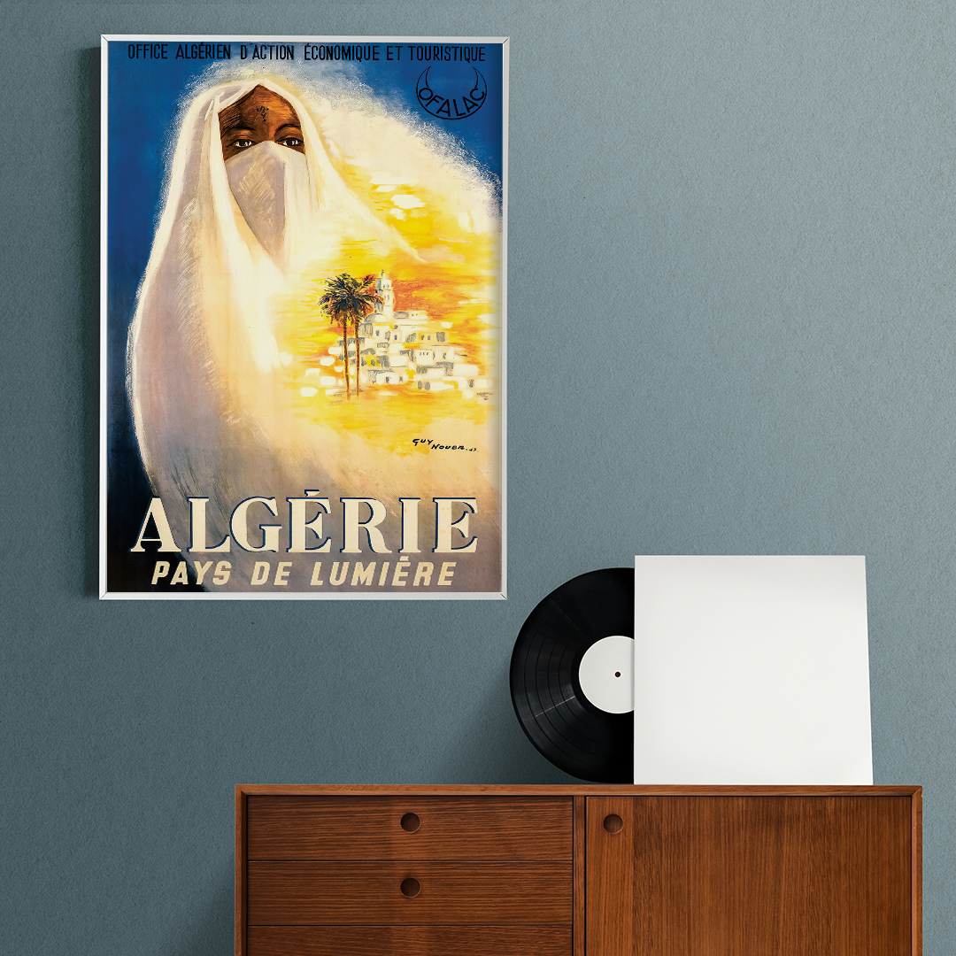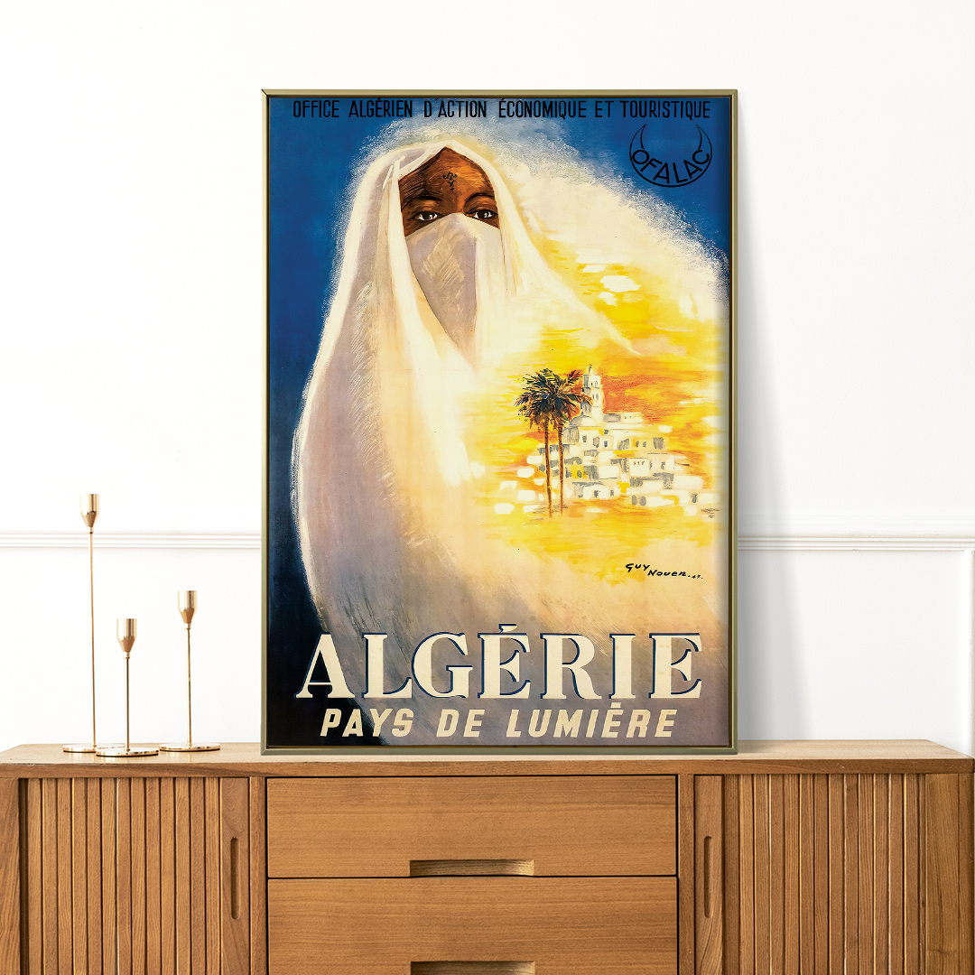 Découvrez l’affiche vintage Algérie pays de lumière, une œuvre emblématique réalisée en 1947 par l’artiste Guy Nouen pour l’Office Algérien d’Action Économique et Touristique (OFALAC). Cette affiche illustre l’élégance intemporelle du patrimoine algérien et l’aura lumineuse du pays.